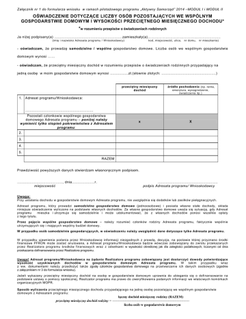 Załącznik nr 1 do formularza wniosku w ramach pilotażowego programu „Aktywny Samorząd” 2014 –MODUŁ I i MODUŁ II OŚWIADCZENIE DOTYCZĄCE LICZBY OSÓB POZOSTAJĄCYCH WE WSPÓLNYM GOSPODARSTWIE DOMOWYM I WYSOKOŚCI PRZECIĘTNEGO MIESIĘCZNEGO DOCHODU* *w rozumieniu przepisów o świadczeniach rodzinnych Ja niżej podpisany(a) ............................................................zamieszkały(a).................... (im ię i n azwisko Adresata programu / Wnioskodawcy) kod, m iejscowość, ulica, nr domu, nr m ieszkania) - oświadczam, że prowadzę samodzielne / wspólne gospodarstwo domowe. Liczba osób we wspólnym gospodarstwie domowym wynosi - oświadczam, że przeciętny miesięczny dochód w rozumieniu przepisów o świadczeniach rodzinnych przypadający na jedną osobę w moim gospodarstwie domowym wynosi ................zł.(słownie złotych: ................................................) przeciętny miesięczny dochód źródło pochodzenia (np. renta, x X em erytura, wynagrodzenie, świadczenia itp.) 1. Adresat programu/Wnioskodawca: ............................................................ Pozostali członkowie wspólnego gospodarstwa domowego Adresata programu – poniżej należy wymienić tylko stopień pokrewieństwa z Adresatem programu: 2. 3. 4. 5. RAZEM Prawdziwość powyższych danych stwierdzam własnoręcznym podpisem. ........................................, dnia....................r. miejscowość ..................................................... podpis Adresata programu/ Wnioskodawcy Uwaga! Uwaga: Przy ustalaniu dochodu w gospodarstwie domowym Adresata programu, nie uwzględnia się dodatków lub zasiłków pielęgnacyjnych. Adresat programu, który prowadzi samodzielne gospodarstwo domowe (jednoosobowe) i posiada własne stałe dochody, składa niniejsze oświadczenie wyliczone na podstawie własnych dochodów. Za własne gospodarstwo domowe uważa się sytuację, gdy Adresat programu mieszka i utrzymuje się samodzielnie i może udokumentować, że z własnych dochodów ponosi wszelkie opłaty z tego tytułu. Przez pojęcie wspólne gospodarstwo domowe – należy rozumieć członków rodziny Adresata programu, faktycznie wspólnie utrzymujących się i mających wspólny budżet domowy. W przypadku osób samodzielnie gospodarujących, w oświadczeniu należy uwzględnić dane dotyczące tylko Adresata programu. W przypadku ujawnienia podania przez W nioskodawcę informacji niezgodnych z prawdą, decyzja, na postawie której przyznano środki finansowe PFRON może zostać anulowana, a Adresat programu/W nioskodawca będzie wówczas zobowiązany do zwrotu przekazanych przez Realizatora programu środków finansowych wraz z odsetkami w wysokości określonej jak dla zaległości podatkowych, liczonymi od dnia przekazania dofinansowania przez Realizatora programu. Uwaga! Adresat programu/Wnioskodawca na żądanie Realizatora programu zobowiązany jest dostarczyć dowody potwierdzające wysokość uzyskiwanych dochodów w gospodarstwie domowym Adresata programu. W takim przypadku wraz z ww. dokumentami należy przedłożyć także zgodę członków gospodarstwa domowego na przetwarzanie ich danych osobowych (zgodnie z załącznikiem nr 3 do formularza wniosku). Jeżeli wykazany przeciętny miesięczny dochód na osobę w gospodarstwie domowym uprawnia do ubiegania się o dofinansowanie na podstawie ustawy o pomocy społecznej, Realizator programu ma prawo do zweryfikowania podanych informacji we właściwych komórkach organizacyjnych MOPR. Sposób wyliczenia przeciętnego miesięcznego dochodu przypadającego na jedną osobę pozostającą we wspólnym gospodarstwie domowym z Adresatem programu: łączny dochód miesięczny rodziny (RAZEM) przeciętny miesięczny dochód rodziny = -------------------------------------------------------------------liczba osób w gospodarstwie domowym ZGODNIE Z ART. 3. USTAWY Z DNIA 28 LISTOPADA 2003 R. O ŚWIADCZENIACH RODZINNYCH (DZ. U. Z 2006R. NR 139, POZ. 992 Z PÓŹN. ZM.) ILEKROĆ W USTAWIE JEST MOWA O: 1)dochodzie - oznacza to, po odliczeniu kwot alimentów świadczonych na rzecz innych osób: a)przychody podlegające opodatkowaniu na zasadach ogólnych na podstawie przepisów o podatku dochodowym od osób fizycznych, pomniejszone o koszty uzyskania przychodu, należny podatek dochodowy od osób fizycznych, zapłacone składki na ubezpieczenia społeczne niezaliczone do kosztów uzyskania przychodu oraz zapłacone składki na ubezpieczenie zdrowotne, b)deklarowany w oświadczeniu dochód z działalności podlegającej opodatkowaniu na podstawie przepisów o zryczałtowanym podatku dochodowym od niektórych przychodów osiąganych przez osoby fizyczne, pomniejszony o należny zryczałtowany podatek dochodowy i zapłacone składki na ubezpieczenia społeczne i zdrowotne, c)inne dochody niepodlegające opodatkowaniu na podstawie przepisów o podatku dochodowym od osób fizycznych: –renty określone w przepisach o zaopatrzeniu inwalidów wojennych i wojskowych oraz ich rodzin, –renty wypłacone osobom represjonowanym i członkom ich rodzin, przyznane na zasadach określonych w przepisach o zaopatrzeniu inwalidów wojennych i wojskowych oraz ich rodzin, –świadczenia pieniężne oraz ryczałt energetyczny określone w przepisach o świadczeniu pieniężnym i uprawnieniach przysługujących żołnierzom zastępczej służby wojskowej przymusowo zatrudnianym w kopalniach węgla, kamieniołomach, zakładach rud uranu i batalionach budowlanych, –dodatek kombatancki, ryczałt energetyczny i dodatek kompensacyjny określone w przepisach o kombatantach oraz niektórych osobach będących ofiarami represji wojennych i okresu powojennego, –świadczenie pieniężne określone w przepisach o świadczeniu pieniężnym przysługującym osobom deportowanym do pracy przymusowej oraz osadzonym w obozach pracy przez III Rzeszę Niemiecką lub Związek Socjalistycznych Republik Radzieckich, –emerytury i renty 