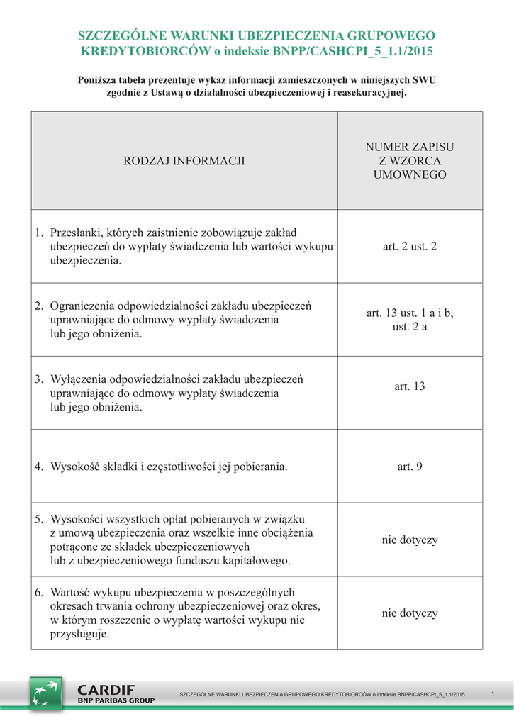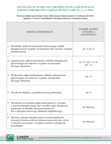 SZCZEGÓLNE WARUNKI UBEZPIECZENIA GRUPOWEGO KREDYTOBIORCÓW o indeksie BNPP/CASHCPI_5_1.1/2015 Poniższa tabela prezentuje wykaz informacji zamieszczonych w niniejszych SWU zgodnie z Ustawą o działalności ubezpieczeniowej i reasekuracyjnej. RODZAJ INFORMACJI NUMER ZAPISU Z WZORCA UMOWNEGO 1. Przesłanki, których zaistnienie zobowiązuje zakład ubezpieczeń do wypłaty świadczenia lub wartości wykupu ubezpieczenia. art. 2 ust. 2 2. Ograniczenia odpowiedzialności zakładu ubezpieczeń uprawniające do odmowy wypłaty świadczenia lub jego obniżenia. 3. Wyłączenia odpowiedzialności zakładu ubezpieczeń uprawniające do odmowy wypłaty świadczenia lub jego obniżenia. 4. Wysokość składki i częstotliwości jej pobierania. art. 13 ust. 1 a i b, ust. 2 a art. 13 art. 9 5. Wysokości wszystkich opłat pobieranych w związku z umową ubezpieczenia oraz wszelkie inne obciążenia potrącone ze składek ubezpieczeniowych lub z ubezpieczeniowego funduszu kapitałowego. nie dotyczy 6. Wartość wykupu ubezpieczenia w poszczególnych okresach trwania ochrony ubezpieczeniowej oraz okres, w którym roszczenie o wypłatę wartości wykupu nie przysługuje. nie dotyczy SZCZEGÓLNE WARUNKI UBEZPIECZENIA GRUPOWEGO KREDYTOBIORCÓW o indeksie BNPP/CASHCPI_5_1.1/2015 1 Niniejsze Szczególne Warunki Ubezpieczenia Grupowego Kredytobiorców oznaczone indeksem BNPP/CASHCPI_5_1.1/2015 stanowią integralną część Umowy Ubezpieczenia, tj.: Umowy Ubezpieczenia Grupowego Kredytobiorców zawartej pomiędzy Towarzystwem Ubezpieczeń na Życie Cardif Polska S.A. a Ubezpieczającym. art. 1 DEFINICJE W Szczególnych Warunkach Ubezpieczenia Grupowego Kredytobiorców o indeksie BNPP/CASHCPI_5_1.1/2015 (dalej „SWU”) oraz w pozostałych dokumentach dotyczących Umowy Ubezpieczenia, poniżej podanym terminom nadano następujące znaczenie: 1) Agent – przedsiębiorca, który wykonuje czynności pośrednictwa ubezpieczeniowego na podstawie umowy agencyjnej zawartej z Ubezpieczycielem, wpisany do rejestru agentów ubezpieczeniowych prowadzonego przez Komisję Nadzoru Finansowego; 2) Deklaracja zgody - wyrażone w formie pisemnej, pod rygorem nieważności, oświadczenie woli osoby wskazanej przez Kredytobiorcę, na mocy którego wyraża on zgodę na objęcie Ochroną ubezpieczeniową na podstawie Umowy ubezpieczenia; 3) Dzień przystąpienia do ubezpieczenia – dzień złożenia Ubezpieczającemu przez Ubezpieczonego wypełnionej i podpisanej Deklaracji zgody; 4) Dzień rozpoczęcia Ochrony ubezpieczeniowej - dzień uruchomienia Kredytu; 5) Dzień zajścia Zdarzenia: a) w przypadku Zgonu – dzień zgonu, wskazany w akcie zgonu; b) w przypadku Poważnego zachorowania, w zależności od zdarzenia lub choroby: − dla nowotworu złośliwego (rak), zawału serca, udaru mózgu, niewydolności nerek – dzień wydania diagnozy przez lekarza, potwierdzającej zgodność danej choroby z opisem choroby wskazanej w niniejszych SWU; − dla operacji pomostowania naczyń wieńcowych (by-pass) – dzień przeprowadzenia zabiegu; − dla przeszczepu narządów – dzień wykonania zabiegu lub gdy zakwalifikowano Ubezpieczonego na listę biorców, dzień zakwalifikowania Ubezpieczonego na listę biorców oczekujących na przeszczep; 6) Harmonogram spłat– dokument opracowany przez Kredytodawcę dla potrzeb danej Umowy kredytu, wskazujący wysokość oraz terminy spłat poszczególnych Rat kredytu należnych Kredytodawcy z tytułu zawartej Umowy kredytu, w tym wskazujący wysokość Salda zadłużenia po spłacie każdej z Rat kredytu, obowiązujący na Dzień zajścia Zdarzenia; 7) Kredyt – zobowiązanie finansowe Kredytobiorcy w ramach kredytu udzielonego w oparciu o wewnętrzne regulacje obowiązujące w Banku; 8) Kredytobiorca – osoba fizyczna prowadząca własną działalność gospodarczą lub rolniczą, spółka cywilna, spółka jawna, spółka partnerska, która zawarła z Kredytodawcą Umowę kredytu; 9) Kredytodawca („Bank”) – Bank BGŻ BNP Paribas S.A. z siedzibą w Warszawie (kod pocztowy 01-211), ul. Kasprzaka 10/16, udzielający Kredytu w oparciu o wewnętrzne regulacje obowiązujące w Banku; 10) Ochrona ubezpieczeniowa – ochrona ubezpieczeniowa udzielana przez Ubezpieczyciela danemu Ubezpieczonemu, na zasadach określonych w niniejszych SWU; 11) Okres ubezpieczenia – czas trwania odpowiedzialności Ubezpieczyciela w stosunku do Ubezpieczonego, rozpoczynający się w Dniu rozpoczęcia Ochrony ubezpieczeniowej; 12) Osoba składająca Skargę – Ubezpieczający, Ubezpieczony, Uposażony lub Uprawniony z Umowy Ubezpieczenia; 13) Pakiet – jeden z pakietów, określający zakres Ochrony ubezpieczeniowej; 14) Poważne zachorowanie – jedno z następujących zdarzeń lub chorób: a) nowotwór złośliwy (rak) – nowotwór (guz) złośliwy, charakteryzujący się niekontrolowanym wzrostem i rozprzestrzenianiem się komórek nowotworowych, powodujących naciekanie i niszczenie prawidłowych tkanek. Rozpoznanie musi zostać potwierdzone badaniem histopatologicznym przez lekarza onkologa lub histopatologa. Zakres ubezpieczenia obejmuje także białaczkę, chłoniaka złośliwego, ziarnicę złośliwą (chorobę Hodgkina), złośliwe nowotwory szpiku kostnego oraz nowotwory skóry powodujące powstawanie przerzutów. Z ochrony ubezpieczeniowej wykluczone są: − rak nieinwazyjny (carcinoma in situ), dysplazja szyjki macicy lub rak szyjki macicy stopniu CIN-1, CIN-2, CIN-3 (CIN – Cervical Intraepithelial Neoplasia) oraz wszelkie zmiany przedrakowe i nieinwazyjne; − wczesny rak gruczołu krokowego (T1 wg klasyfikacji TNM, wliczając T1a i T1b lub odpowiadający mu stopień zaawansowania wg innej klasyfikacji); − czerniak złośliwy skóry w stopniu zaawansowania 1A (Stage 1A) =< 1mm, poziom II lub III, bez owrzodzenia) według kla- syfikacji AJCC (American Journal of Critical Care) z 2002 r.; nadmierne rogowacenie (hyperkeratosis), podstawnokomórkowy rak skóry i kolczystokomórkowy rak s