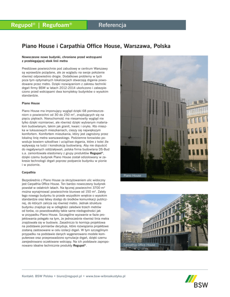 Regupol® | Regufoam® Referencja Piano House i Carpathia Office House, Warszawa, Polska Nowoczesne nowe budynki, chronione przed wstrząsami z przebiegającej obok linii metra Prestiżowe powierzchnie pod zabudowę w centrum Warszawy są wprawdzie pożądane, ale ze względu na swoje położenie również odpowiednio drogie. Dodatkowe problemy w tych poza tym optymalnych lokalizacjach stwarzają drgania powodowane przez metro. Dzięki rozwiązaniom z zakresu techniki drgań firmy BSW w latach 2012-2014 ukończono i zabezpieczono przed wstrząsami dwa kompleksy budynków o wysokim standardzie. Piano House Piano House ma imponujący wygląd dzięki 68 pomieszczeniom o powierzchni od 30 do 250 m², znajdujących się na pięciu piętrach. Nieruchomość ma niesamowity wygląd nie tylko dzięki rozmiarowi, ale również dzięki wybranym materiałom budowlanym, takim jak granit, kwarc i onyks. Kto mieszka w luksusowych mieszkaniach, cieszy się największym komfortem. Komfortem mieszkania, który jest zagrożony przez lokalną linię metra warszawskiego. Podziemne torowisko powoduje bowiem szkodliwe i uciążliwe drgania, które z kolei źle wpływają na ludzi i konstrukcję budowlaną. Aby nie dopuścić do negatywnych oddziaływań, polska firma budowlana DS-Bud s.a. zamontowała elastomery z grupy produktów Regupol®, dzięki czemu budynek Piano House został odizolowany w zakresie technologii drgań poprzez podparcie budynku w pionie i w poziomie. Carpathia Bezpośrednio z Piano House za skrzyżowaniem ulic widoczny jest Carpathia Office House. Ten bardzo nowoczesny budynek powstał w ostatnich latach. Na łącznej powierzchni 3700 m² można wynajmować powierzchnie biurowe od 150 m². Zalety tego nowego budynku to przede wszystkim wnętrze o wysokim standardzie oraz łatwy dostęp do środków komunikacji publicznej, do których zalicza się również metro. Jednak struktura budynku znajduje się w odległości zaledwie trzech metrów od torów, co powodowałoby takie same niedogodności jak w przypadku Piano House. Szczególne wyzwanie w fazie projektowania polegało na tym, że jednocześnie również linia metra znajdowała się w budowie. Zasadniczo to komisja projektowa na podstawie pomiarów decyduje, które rozwiązania projektowe zostaną zastosowane w celu izolacji drgań. W tym szczególnym przypadku na podstawie danych wygenerowano modele komputerowe oraz przeprowadzono symulacje drgań, dzięki czemu zarejestrowano oczekiwane wstrząsy. Na ich podstawie zaproponowano idealne technicznie produkty Regupol®. Piano House Carpathia Office House Kontakt: BSW Polska • [email protected] • www.bsw-wibroakustyka.pl Regupol® | Regufoam® Referencja Projektowanie, koncepcja i montaż Położenie fundamentów budynku w bezpośredniej bliskości tunelu metra oraz związane z tym niedogodności sprawiły, że niezbędne okazało się rozwiązanie polegające na izolacji drgań. Z tego powodu projektanci zdecydowali się zlecić projekt rozwiązania z zakresu techniki drgań firmie BSW. W rozwiązaniu przewidziano zamontowanie warstwy izolacyjnej bezpośrednio na fundamencie betonowym pod wznoszonymi elementami konstrukcji. Dzięki temu uniknięto rozchodzenia się wstrząsów w strukturze budynku, które są odczuwane jako drgania lub odgłos wtórny. Realizująca projekt firma budowlana IDS-Bud s.a. zainstalowała izolację drgań firmy BSW, składającą się głównie z typów Regupol® HT i Regupol® PL. Elementem tego rozwiązania z zakresu techniki drgań była również izolacja boczna o grubości 50 mm, wykonana także w jakości Regupol®. Piano House W Carpathia Office House zastosowano produkty Regupol® vibration 480, Regupol® vibration 550 i Regupol® vibration 450 z odświeżonego asortymentu produktów BSW. Dzisiaj linia metra jest już w użytkowaniu, a prace budowlane przy budynkach zostały zakończone. Należy stwierdzić, że występujące drgania i hałasy negatywnie wpływają na sąsiednie budynki, natomiast Piano House i Carpathia Office House zostały skutecznie zabezpieczone przed tymi zjawiskami. Zgodnie z planem, mieszkańcy nie zauważają przejeżdżających pociągów. Ponadto podczas montażu uwzględniono i dostosowano się do norm prawnych z zakresu ochrony przed wibracjami. Informacje w skrócie Obiekt:Piano House i Carpathia Office House, Warszawa Projektowanie: BSW Berleburger Schaumstoffwerk GmbH Firma budowlana:IDS-Bud s.a. Kontakt: BSW Polska • [email protected] • www.bsw-wibroakustyka.pl Online Version March 2016 Carpathia Office House