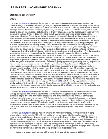 2010.12.22 - KOMENTARZ PORANNY Stabilizacja czy wzrosty? Witam. Wykres 60 minutowy kontraktów FW20H11. Wczorajsza sesja pomimo lekkiego wzrostu na otwarciu długo zapowiadała się analogicznie jak ta poniedziałkowa. Na rynku panowały niskie obroty i lekkie osuwanie się rynku. Optymizm za to panował w Eurolandzie i to on spowodował rozruszanie naszego handlu. Tamtejsze wzrosty przyspieszyły bowiem po pobudce w USA i nasz rynek musiał podążyć śladem innych giełd. Odbyło się to w typowy dla naszego rynku sposób, czyli koszykowymi zleceniami kupna. Rynek w dosłownie kilka minut wyrwał się z marazmu przebijając poziom porannego otwarcia. Potem już do końca dnia popyt dominował i konsekwentnie podnosił rynek w górę. Dopiero na końcowym fixingu indeks stracił 8pkt. Sesja zakończyła się całkiem wyraźnym wzrostem, a przede wszystkim w niedużej odległości od ubiegłotygodniowego maksimum. Na rynku terminowym brakuje do niego 19pkt. Popyt pokazał więc, że kontroluje co się dzieje na rynku i jest w stanie wyprowadzić skuteczną kontrę. Teraz aktualne są dwa scenariusze dalszego rozwoju sytuacji. Pierwszy to taki, że wczorajszy wzrost niczego nie zmieni na rynku i dzisiaj przy marazmie powrócimy do osuwania się rynku w dół, a drugi podpowiada, że jest szansa na to, że korekta trwająca od 7 grudnia dobiegła końca i pojawił się wczoraj nowy impuls wzrostowy. Przy tym drugim scenariuszu bardzo szybko doszłoby do ustanowienia nowych maksimów i jeszcze dalszej kontynuacji wzrostu. W nim zakończenie roku wypadłoby z bardzo optymistyczny sposób. Nie wiem, który z nich ma większe szanse na wystąpienie. Obawiam się, że pod koniec roku nikt nie będzie angażował większych kapitałów, ale z drugiej strony przy obecnych niskich obrotach można przecież zrobić wszystko co się chce. Podstawową informacją płynącą po wczorajszej sesji jest to, że powstało nowe wsparcie znajdujące się na poniedziałkowym minimum. Jest to poziom 2756pkt. Tam teoretycznie powinna zakończyć się korekta, jeśli mamy do czynienia z kontynuacją wzrostu z pierwszych dni grudnia. Istotną rzeczą może być również to, że wykres 60 minutowy powrócił nad średnie 55 i 100. Podaż ściągając go poniżej tych średnich nic nie osiągnęła i jest to jej porażka. Dlatego po jej niepowodzeniu teraz popyt ma szansę się wykazać, a jak ją wykorzysta to się okaże. Opisując wczoraj wskaźniki pisałem, że spadły one dosyć nisko, ale nie doszły do swoich minimów z początku grudnia. Przez to jest możliwość ich kształtowania na coraz wyższym poziomie. Do tego jednak potrzeba pokonania oporów, a te wczoraj nie zostały przebite. Dla wskaźnika RSI jest to linia spadkowa, a dla MACD pozioma linia oporu. Wskaźnik STS z okolic strefy wyprzedania dotarł do strefy wykupienia i wszedł w jej zakres. Teraz okaże się, czy jest to wystarczający bodziec dla podaży, czy też impuls wzrostowy będzie kontynuowany. Linia ADX trochę się obniżyła wskazując na słabość wcześniejszej tendencji spadkowej. Wykres 10 minutowy kontraktów FW20H11. Opisując wczoraj wykres 10 minutowy zwracałem uwagę, że wyjście nad średnią 55 powinno zakończyć wyraźną przewagę podaży. Jedynie w pierwszej części dnia i to minimalnie próbowała ona dalej dominować na rynku, a czym się to skończyło później widać na wykresie. Wybił się on ponad wszystkie średnie kroczące i w związku z tym popyt podejmie próbę poprowadzenia ruchu powyżej średnich z tego wykresu. Zapewne w momencie, gdy znowu średnia 55 zostanie przebita, ale tym razem od góry, to skończy się wspomniana próba ruchu wzrostowego. Wskaźnik RSI dotarł do strefy wykupienia i pojawiła się na nim linia wzrostowa. Wskaźnik MACD dotarł jedynie do górnego ograniczenia swoich ostatnich wahań. Wykres 60 minutowy indeksu WIG20. Wykres 60 minutowy indeksu również wyszedł w górę przebijając od dołu średnie 55 i 100 oraz zbliżył się na odległość 15pkt na zakończeniu sesji do tegorocznego maksimum. Nowym wsparciem jest poniedziałkowe minimum na 2728pkt. Wskaźnik TRD po spadku do wyżej położonej linii wsparcia dotarł wczoraj do niżej położonej linii oporu. Jeśli nie dotrze do tej drugiej linii oporu, to będziemy mieli do czynienia z zawężonymi wahaniami rynku. Tylko wzrost do wyżej położonej linii oporu będzie sygnałem, że nastąpił powrót do faktycznego impulsu wzrostowego. Wskaźnik TRIX zakręcił w górę i przebił linię sygnalną. Na jego dołku wsparła się nowa linia wzrostowa, a czy ma ona rację bytu pokażą najbliższe sesje. Wczoraj w czasie sesji wzrosła LOP o około 3400 pozycji do poziomu 110515. Sesja w USA zakończyła się wzrostem indeksów o trochę ponad 0,5%. Dzisiaj amerykańskie futuresy są na delikatnym minusie, a giełdy azjatyckie w większości lekko zyskują. W końcu mamy jakieś wydarzenia w kalendarium. O 13.00 z USA poznamy wnioski o kredyt hipoteczny, o 14.30 weryfikację PKB za III kwartał wraz z deflatorem i PCE, o 16.00 sprzedaż domów na rynku wtórnym, raport o cenach domów wg FHFA i o 16.30 tygodniową zmianę zapasów paliw. Dzisiaj też w programie jest komunikat RPP po posiedzeniu. Moja strategia ma otwartą krótką pozycję w 1/2 wielkości. Ewentualna zmiana pozycji nastąpi na koniec tygodnia w czwartek. Pozdrawiam, Andrzej Klempka Niniejszy materiał został sporządzony przez analityka współpracującego z BDM S.A. i reprezentuje wyłącznie stanowisko jego autora. Niniejszy materiał nie stanowi rekomendacji w rozumieniu rozporządzenia Ministra Finansów z dnia 19 października 2005 r. w sprawie informacji stanowiących rekomendacje dotyczące instrumentów finansowych, ich emitentów lub wystawców a zamieszczone w nim informacje, komentarze i opinie nie stanowią porad inwestycyjnych, rekomendacji lub ofert zakupu lub sprzedaży instrumentów finansowych a także nie są analizami inwe