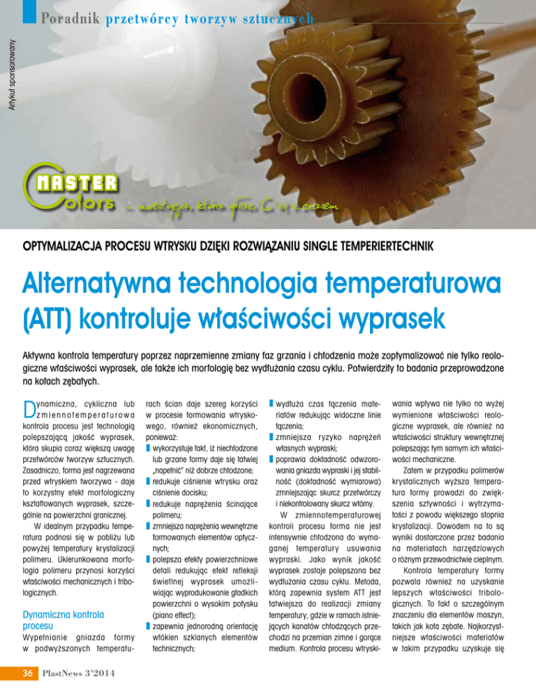 Artykuł sponsorowany Poradnik przetwórcy tworzyw sztucznych Optymalizacja procesu wtrysku dzięki rozwiązaniu Single Temperiertechnik Alternatywna technologia temperaturowa (ATT) kontroluje właściwości wyprasek Aktywna kontrola temperatury poprzez naprzemienne zmiany faz grzania i chłodzenia może zoptymalizować nie tylko reologiczne właściwości wyprasek, ale także ich morfologię bez wydłużania czasu cyklu. Potwierdziły to badania przeprowadzone na kołach zębatych. D ynamiczna, cykliczna lub zmiennotemperaturowa kontrola procesu jest technologią polepszającą jakość wyprasek, która skupia coraz większą uwagę przetwórców tworzyw sztucznych. Zasadniczo, forma jest nagrzewana przed wtryskiem tworzywa - daje to korzystny efekt morfologiczny kształtowanych wyprasek, szczególnie na powierzchni granicznej. W idealnym przypadku temperatura podnosi się w pobliżu lub powyżej temperatury krystalizacji polimeru. Ukierunkowana morfologia polimeru przynosi korzyści właściwości mechanicznych i tribologicznych. Dynamiczna kontrola procesu Wypełnianie gniazda formy w podwyższonych temperatu36 PlastNews 3’2014 rach ścian daje szereg korzyści w procesie formowania wtryskowego, również ekonomicznych, ponieważ: wykorzystuje fakt, iż niechłodzone lub grzane formy daje się łatwiej „napełnić” niż dobrze chłodzone; redukuje ciśnienie wtrysku oraz ciśnienie docisku; redukuje naprężenia ścinające polimeru; zmniejsza naprężenia wewnętrzne formowanych elementów optycznych; polepsza efekty powierzchniowe detali redukując efekt refleksji świetlnej wyprasek umożliwiając wyprodukowanie gładkich powierzchni o wysokim połysku (piano effect); zapewnia jednorodną orientację włókien szklanych elementów technicznych; wydłuża czas łączenia mate- riałów redukując widoczne linie łączenia; zmniejsza ryzyko naprężeń własnych wypraski; poprawia dokładność odwzorowania gniazda wypraski i jej stabilność (dokładność wymiarowa) zmniejszając skurcz przetwórczy i niekontrolowany skurcz wtórny. W zmiennotemperaturowej kontroli procesu forma nie jest intensywnie chłodzona do wymaganej temperatury usuwania wypraski. Jako wynik jakość wyprasek zostaje polepszona bez wydłużania czasu cyklu. Metoda, którą zapewnia system ATT jest łatwiejsza do realizacji zmiany temperatury, gdzie w ramach istniejących kanałów chłodzących przechodzi na przemian zimne i gorące medium. Kontrola procesu wtryski- wania wpływa nie tylko na wyżej wymienione właściwości reologiczne wyprasek, ale również na właściwości struktury wewnętrznej polepszając tym samym ich właściwości mechaniczne. Zatem w przypadku polimerów krystalicznych wyższa temperatura formy prowadzi do zwiększenia sztywności i wytrzymałości z powodu większego stopnia krystalizacji. Dowodem na to są wyniki dostarczone przez badania na materiałach narzędziowych o różnym przewodnictwie cieplnym. Kontrola temperatury formy pozwala również na uzyskanie lepszych właściwości tribologicznych. To fakt o szczególnym znaczeniu dla elementów maszyn, takich jak koła zębate. Najkorzystniejsze właściwości materiałów w takim przypadku uzyskuje się Poradnik przetwórcy tworzyw sztucznych poprzez zwiększenie temperatury formy. Ekonomika procesu wymaga jak najkrótszych czasów cyklu. Systematyczne badania w Instytucie Technologii Polimerów na Uniwersytecie Eulengen - Nuremberg, Niemcy, pokazują, że kontrola zmiennotemperaturowa procesu wtrysku stawia w fizycznej sprzeczności potrzebę wysokich temperatur podczas wtrysku dla dobrej morfologii wypraski i konieczności niskiej temperatury dla uzyskania krótkich czasów cyklu. W formie do kół zębatych z polioksometylenu (POM) zawarte płytki wnękowe są izolowane cieplnie od formy głównej. Forma jest utrzymywana w stałej temperaturze dla zachowania stabilności procesu i tylko temperatura wkładek jest aktywnie sterowana. Wkładki te zostały zbudowane ze stali proszkowej w technologii Laser Cusing na podstawie danych projektowych. Połączenie izolacji z formy głównej z kanałami chłodzącymi sprzyja gwałtownym zmianom temperatury. Czujniki, znajdujące się blisko ściany gniazda dostarczają informacji o aktualnej temperaturze, dzięki czemu proces może być dokładnie kontrolowany ułatwiając synchronizację procesu wtrysku z fazą kontroli temperatury. Faza wtrysku – 150°C Faza usuwania wypraski – 70°C Do zmiany temperatury w systemie ATT zastosowano układ regulacji (STWS 200, Single Temperiertechnik GmbH). System wykorzystuje wodę jako medium obiegowe, posiada funkcję grzania i chłodzenia oraz hydrauliczną stację zaworów umożliwiającą przełączanie obiegów. System posiada dwa oddzielne obiegi, w których woda utrzymywana jest w dwóch różnych temperaturach i może zapewnić naprzemienne grzanie i chłodzenie. W rezultacie zmiany temperatury o 80°C można dokonać w czasie 10 s. Maszyna informuje sterownik stacji zaworów o temperaturze wody. Dla POM użytego do badań (Hostaform C9021, Ticona GmbH) dynamiczna regulacja temperatury umożliwia zmianę temperatury formy aż do poziomu temperatury krystalizacji materiału. Wysoka temperatura ścianki gniazda pozwala uniknąć tworzenia się stref brzegowych niskiej krystaliczności, jednocześnie jednorodna struktura może stanowić całą część. Po wtrysku, podczas utrzymywania ciśnienia, następuje chłodzenie do 70°C, które umożliwia usunięcie wypraski z gniazda formy. Jako, że faza grzania i chłodzenia zajmuje w przybliżeniu taką samą ilość czasu, faza grzania zaczyna się po zakończeniu fazy chłodzenia poprzedniego cyklu. Poprawa morfologii Temperatura gniazda formy znacząco wpływa na morfologię wypraski. Dla zaawansowanych termicznie wyprasek temperatura jest wspólna i wynosi 100°C. Jedynym sposobem na uniknięcie tworzenia się warstwy granicznej, która ma inną mikrostrukturę, jest podniesienie 
