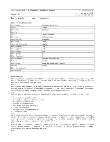 'Alfa Investment - Nieruchomości Doradztwo Finanse' SD00777 Typ transakcji: ul. Grudziądzka 79 Toruń tel. (56) 664 10 25/26 tel.kom +48 888 658 303 domy / sprzedaż Dane nieruchomości: Województwo kujawsko-pomorskie Miasto Toruń Dzielnica Bielawy Osiedle Ulica Jeleniogórska Typ domu wolnostojący Typ własności własność Rok budowy 2000 Materiał wykonania cegła Pow. całkowita 148 Pow. użytkowa 145 Pow. działki 950 Ilość pokoi 5 Ilość łazienek 2 Typ ogrzewania gazowe dwufunkcyjne Kuchnia aneks Uzbrojenie woda,gaz,prąd,kanalizacja Dodatki garaż Ilość kondygnacji 1 Zasiedlenie Informacje: Mam przyjemność zaprezentować Państwu ładny dom jednorodzinny, wolnostojący, parterowy. Dom został wybudowany w 2000 roku, posiada 145,8 m2 powierzchni użytkowej i znajduje się na działce o powierzchni 950 m2.</br> </br> Konstrukcja domu składa się z ław żelbetonowych wylewanych na mokro, oraz ścian z gazbetonu. Budynek został ocieplony styropianem o grubości 12 cm. Dach spadzisty z dachówki betonowej. Okna PCV system VEKA z zewnętrznymi roletami antywłamaniowymi.</br> </br> Budynek został wykonany w wysokim standardzie w oparciu o projekt architekta wnętrz.</br> </br> W skład budynku wchodzi:</br> - Duży salon z otwartym kominkiem</br> - Pół otwarta kuchnia</br> - Kuchnia półotwarta</br> - Dwie kompletne łazienki</br> - Cztery pokoje</br> - Pomieszczenie gospodarcze</br> - Przedsionek</br> </br> Na działce znajduje garaż dwustanowiskowy z drzwiami na pilota, do którego prowadzi dojazd z kostki brukowej. Dodatkowym atutem ogrodu jest oświetlenie, które dodatkowo podkreśla urokliwy ogród. Ponadto w ogrodzie znajduje się altanka ogrodowa, która jest idealną alternatywą na rodzinne spotkanie czy grilla.</br> </br> Budynek stoi w doskonałej, zielonej lokalizacji z dala od ulicznego zgiełku. Obszar ten jest dobrze skomunikowany z miastem, w okolicy znajduje się sklep wielobranżowy, szkoła, przedszkole oraz tereny rekreacyjne.</br> </br> <b>Artur Brączkowski</br> Tel. 887-602-116</br> e-mail: [email protected]</br></b> </br> Pośrednik odpowiedzialny zawodowo:</br> Paweł Dawidowicz licencja pośrednika w obrocie nieruchomościami 7432</br> Andrzej Pamin licencja pośrednika w obrocie nieruchomościami 1145</br> </br> <b>UWAGA!!!</br> BEZPŁATNIE POMAGAMY W UZYSKANIU KREDYTU NA ZAKUP NIERUCHOMOŚCI. WSPÓŁPRACUJEMY Z WIELOMA BANKAMI.</br></b> </br> Treść niniejszego ogłoszenia nie stanowi oferty handlowej w rozumieniu przepisów Kodeksu Cywilnego.</br> </br> Więcej ofert na <b>www.alfa-investment.pl</br> ZAPRASZAMY!!!</b> Cena: 870 000 PLN Dokument wygenerowany ze strony www.alfa-investment.pl Strona 2