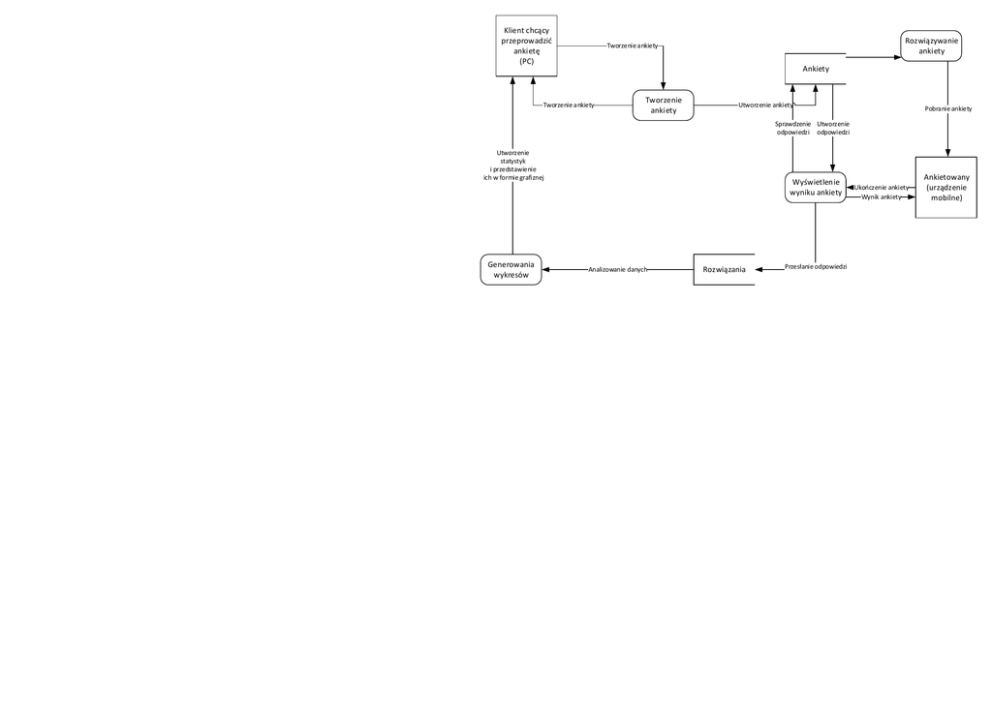 Klient chcący przeprowadzić ankietę (PC) Rozwiązywanie ankiety Tworzenie ankiety Ankiety Tworzenie ankiety Tworzenie ankiety Utworzenie ankiety Pobranie ankiety Sprawdzenie Utworzenie odpowiedzi odpowiedzi Utworzenie statystyk i przedstawienie ich w formie grafiznej Generowania wykresów Wyświetlenie wyniku ankiety Analizowanie danych Rozwiązania Przesłanie odpowiedzi Ukończenie ankiety Wynik ankiety Ankietowany (urządzenie mobilne)