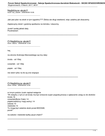 Forum Sekcji Spadochronowej - Sekcja Spadochronowa-Aeroklub Białostocki - SKOKI SPADOCHRONOW Wygenerowano: 4 March, 2017, 08:47 Najbliższe skoki!! Autor: sky_slawek - 2009/06/08 10:26 _____________________________________ Jaki jest plan na skoki w tym tygodniu??? Zbliża sie długi weekend, więc ustalmy jak skaczemy. Zaplanujmy dzień i godzinę spotkania na lotnisku i skaczmy. Jurek!! podaj jakieś daty. Pozdrawiam ============================================================================ O:Najbliższe skoki!! Autor: stachu - 2009/06/08 12:28 _____________________________________ hej, na stronie Andrzeja Manowskiego są trzy daty: środa - od 15tej czwartek - od 14tej piątek - od 15tej nie wiem tylko na ile są one wiążące ============================================================================ O:Najbliższe skoki!! Autor: tomek - 2009/06/08 12:50 _____________________________________ w innym poście Jurek napisał wstępnie "W związku z tym,iż od środy ma być wreszcie super pogoda,proszę o zgłaszanie uwag co do skoków: środa 16 czwartek(Boże Ciało) 14 piątek(niektórzy mają wolny) 14 sobota 10 niedziela 13 To mogą być ostatnie skoki przed BOOGIE. pozdr" na sobote i niedziele byliby jacyś chętni? ============================================================================ 1/6 Forum Sekcji Spadochronowej - Sekcja Spadochronowa-Aeroklub Białostocki - SKOKI SPADOCHRONOW Wygenerowano: 4 March, 2017, 08:47 O:Najbliższe skoki!! Autor: Skybabe - 2009/06/08 13:03 _____________________________________ ja pisze sie na każdy z podanych powyzej terminów. Długa przerwa spowodowana beznadziejna pogodą wywołała u mnie głód skakania :laugh: ============================================================================ Re:O:Najbliższe skoki!! Autor: Kejt - 2009/06/08 20:44 _____________________________________ Ja też już nie wytrzymuję siedząc ciągle w domu! No i czasem planując skoki, z których wychodzi dupa :angry: Jeśli w ŚRODĘ dopisze pogoda, to SKACZMY! ============================================================================ Re:O:Najbliższe skoki!! Autor: Ola - 2009/06/08 22:00 _____________________________________ Ja też powoli zaczynam się czuć jak narkomanka na głodzie :-) ============================================================================ Re:Najbliższe skoki!! Autor: PePe - 2009/06/08 23:17 _____________________________________ Patrzę, że tutaj same głodomory, hehe... :laugh: Przyznam, że u mnie jest podobnie - skakach się chce, jak diabli ]:-> Tylko ta pogoda jakoś ostatnio nie chce nam wcale "pomóc" i niestety na ten tydzień też to raczej kiepsko (nie chcąc krakać: kra, kra...) wygląda :( Jakby jednak Słonko zmieniło zdanie i się do Nas uśmiechnęło, to jestem do dyspozycji*: - w środę po 16.00, - w czwartek od rana (ale w Boże Ciało ponoć się nie skacze???), - i w piątek od rana, *tzn. na 100% jestem "na polu" i skaczę ile się da :) Pozdrawiam... ============================================================================ 2/6 Forum Sekcji Spadochronowej - Sekcja Spadochronowa-Aeroklub Białostocki - SKOKI SPADOCHRONOW Wygenerowano: 4 March, 2017, 08:47 O:Re:Najbliższe skoki!! Autor: plonek58 - 2009/06/09 06:48 _____________________________________ Możemy skakać: środa 16 piątek 14 sobota 10 niedziela 12 W czwartek (Boże Ciało) nie skaczemy.Lotnictwo stoi a raczej idzie w procesji.Są to ostatnie skoki przed Casa Boogie. Ponadto potrzebuję rąk do pracy (już od dziś) przy stojankach. Chętnych zapraszam. pozdr ============================================================================ O:Re:Najbliższe skoki!! Autor: admin - 2009/06/09 16:55 _____________________________________ Witam W celu usprawnienia planowania skoków dodałem (napisaną w pocie czoła) funkcjonalność zapisywania się na skoki. Dostępna jest ona w menu 'Skoki'. Jurek może dodawać i usuwać nowe terminy skoków. Każdy zalogowany użytkownik może się zapisać na skoki (uwaga, decyzja jest wiążąca, nazwisko pozostaje na liście bez możliwości usunięcia) , skreślić swoje nazwisko na liście lub anulować skreślenie (wkrótce możliwość zmiany komentarza). Osoby niezalogowane nie widzą nazwisk, tylko sumaryczną liczbę osób. Komponent będzie w wolnych chwilach udoskonalany. ============================================================================ O:Najbliższe skoki!! Autor: tomek - 2009/06/09 17:48 _____________________________________ brawo dla admina! świtny pomysł, polać mu za to ============================================================================ Re:O:Najbliższe skoki!! Autor: Kejt - 2009/06/09 22:00 _____________________________________ 3/6 Forum Sekcji Spadochronowej - Sekcja Spadochronowa-Aeroklub Białostocki - SKOKI SPADOCHRONOW Wygenerowano: 4 March, 2017, 08:47 Dziękujemy bardzo! :) A jeszcze lepiej by było, gdyby można było dopisywać innych (nie wszyscy zawsze mają możliwość wejść na stronę) :P ============================================================================ O:Najbliższe skoki!! Autor: admin - 2009/06/09 22:06 _____________________________________ Taka opcja póki co nie jest przewidziana. W zasadzie oczekiwane są poważne deklaracje, a za takie można uważać zgłoszone ze swojego konta. Jest konto, hasło i pewność, że to właściwa osoba zgłosiła się, a nie "bo ktoś mnie wpisał" ;-) Może w przyszłości ... ============================================================================ O:Najbliższe skoki!! Autor: PePe - 2009/06/09 23:19 _____________________________________ Nowe rozwiązanie planowania skoków, jak dla mnie rewelka ;) Adminowi gratuluję czujności :) Brawa dla tego Pana! B R A W O ! ! ! Pozdrawiam... ============================================================================ Najbliższe skoki!! - ŚRODA 17.06. Autor: grzecho - 2009/06/15 14:47 _____________________________________ Casa przyleci pewnie dopiero wieczorem 