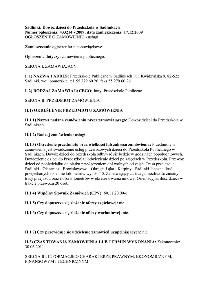 Sadlinki: Dowóz dzieci do Przedszkola w Sadlinkach Numer ogłoszenia: 433214 - 2009; data zamieszczenia: 17.12.2009 OGŁOSZENIE O ZAMÓWIENIU - usługi Zamieszczanie ogłoszenia: nieobowiązkowe Ogłoszenie dotyczy: zamówienia publicznego. SEKCJA I: ZAMAWIAJĄCY I. 1) NAZWA I ADRES: Przedszkole Publiczne w Sadlinkach , ul. Kwidzyńska 9, 82-522 Sadlinki, woj. pomorskie, tel. 55 279 60 26, faks 55 279 60 26. I. 2) RODZAJ ZAMAWIAJĄCEGO: Inny: Przedszkole Publiczne. SEKCJA II: PRZEDMIOT ZAMÓWIENIA II.1) OKREŚLENIE PRZEDMIOTU ZAMÓWIENIA II.1.1) Nazwa nadana zamówieniu przez zamawiającego: Dowóz dzieci do Przedszkola w Sadlinkach. II.1.2) Rodzaj zamówienia: usługi. II.1.3) Określenie przedmiotu oraz wielkości lub zakresu zamówienia: Przedmiotem zamówienia jest świadczenie usług przewozowych dzieci do Przedszkola Publicznego w Sadlinkach. Dowóz dzieci do przedszkola odbywać się będzie w godzinach popołudniowych. Dowiezienie dzieci do Przedszkola i odwiezienie dzieci po zajęciach w Przedszkolu. Przewóz dzieci od poniedziałku do piątku z wyłączeniem dni wolnych od zajęć. Trasa przejazdu: Sadlinki - Olszanica - Bronisławowo - Okrągła Łąka - Karpiny - Sadlinki. Łączna ilość przejechanych dziennie kilometrów wynosi 40. Zamawiający zastrzega możliwość zmiany trasy przejazdu oraz ilości kilometrów w okresie trwania umowy. Orientacyjna ilość dzieci w trakcie przewozu 20 osób. II.1.4) Wspólny Słownik Zamówień (CPV): 60.11.20.00-6. II.1.5) Czy dopuszcza się złożenie oferty częściowej: nie. II.1.6) Czy dopuszcza się złożenie oferty wariantowej: nie. II.1.7) Czy przewiduje się udzielenie zamówień uzupełniających: nie. II.2) CZAS TRWANIA ZAMÓWIENIA LUB TERMIN WYKONANIA: Zakończenie: 30.06.2011. SEKCJA III: INFORMACJE O CHARAKTERZE PRAWNYM, EKONOMICZNYM, FINANSOWYM I TECHNICZNYM III.1) WARUNKI DOTYCZĄCE ZAMÓWIENIA Informacja na temat wadium: nie dotyczy III.2) WARUNKI UDZIAŁU Opis warunków udziału w postępowaniu oraz opis sposobu dokonywania oceny spełniania tych warunków: Do przetargu mogą przystąpić wykonawcy którzy: 1) posiadają uprawnienia do wykonywania określonej działalności lub czynności, jeżeli ustawy nakładają obowiązek posiadania takich uprawnień; 2) posiadają niezbędną wiedzę i doświadczenie oraz dysponują potencjałem technicznym i osobami zdolnymi do wykonania zamówienia lub przedstawią pisemne zobowiązanie innych podmiotów do udostępnienia potencjału technicznego i osób zdolnych do wykonania zamówienia; 3) znajdują się w sytuacji ekonomicznej i finansowej zapewniającej wykonanie zamówienia; 4) nie podlegają wykluczeniu z postępowania o udzielenie zamówienia na podstawie art.24 ustawy prawo zamówień publicznych. Ocena spełniania warunków udziału w postępowaniu nastąpi na podstawie dokumentów i oświadczeń, przedłożonych przez wykonawcę wraz z ofertą, wyszczególnionych w pkt. VI, na zasadzie kwalifikacji spełnia nie spełnia. Informacja o oświadczeniach i dokumentach, jakie mają dostarczyć wykonawcy w celu potwierdzenia spełniania warunków udziału w postępowaniu: Dla uznania ważności oferty Oferent musi przedstawić w ofercie następujące dokumenty lub kserokopie poświadczone za zgodność z oryginałem przez wykonawcę (oferenta ) a) Formularz oferty zał nr 1 b) Oświadczenie o spełnieniu warunków udziału w postępowaniu zał nr 2 c)Aktualny odpis z właściwego rejestru albo aktualne zaświadczenie o wpisie do ewidencji działalności gospodarczej potwierdzający, że wykonawca prowadzi działalność zakresie wykonywania usług objętych zamówieniem, wystawiony nie wcześniej niż 6 miesięcy przed upływem składania ofert. SEKCJA IV: PROCEDURA IV.1) TRYB UDZIELENIA ZAMÓWIENIA IV.1.1) Tryb udzielenia zamówienia: przetarg nieograniczony. IV.2) KRYTERIA OCENY OFERT IV.2.1) Kryteria oceny ofert: najniższa cena. IV.2.2) Wykorzystana będzie aukcja elektroniczna: nie. IV.3) INFORMACJE ADMINISTRACYJNE IV.3.1) Adres strony internetowej, na której dostępna jest specyfikacja istotnych warunków zamówienia: www.sadlinki.pl. Specyfikację istotnych warunków zamówienia można uzyskać pod adresem: Przedszkole Publiczne w Sadlinkach ul. Kwidzyńska 9 82-522 Sadlinki. IV.3.4) Termin składania wniosków o dopuszczenie do udziału w postępowaniu lub ofert: 29.12.2009 godzina 09:00, miejsce: Urząd Gminy Sadlinki ul. Kwidzyńska 12 82-522 Sadlinki. IV.3.5) Termin związania ofertą: okres w dniach: 30 (od ostatecznego terminu składania ofert). IV.3.13) Informacje dodatkowe, w tym dotyczące finansowania projektu/programu ze środków Unii Europejskiej: Projekt Przedszkole otwarte na przyszłość współfinansowany ze środków Unii Europejskiej w ramach Europejskiego Funduszu Społecznego. Dyrektor Przedszkola Ewa Złotnik-Strzelecka