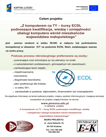Celem projektu „Z komputerem na TY – kursy ECDL podnoszące kwalifikacje, wiedzę i umiejętności obsługi komputera wśród mieszkańców województwa małopolskiego” jest pomoc osobom w wieku 50-64l. w nabyciu lub podniesieniu kompetencji w obszarze ICT na poziomie ECDL Start, zwiększające szanse na rynku pracy. Podczas procesu rekrutacyjnego preferowane są osoby: • powracające oraz wchodzące po raz pierwszy na rynek; • z wykształceniem podstawowym, gimnazjalnym lub zawodowym; • zamieszkujące teren wiejski; • niepełnosprawne; • bezrobotne; • długotrwale bezrobotne; • płeć (preferencja dla Kobiet); • w wieku 55+; • zamieszkałe w powiecie: dąbrowskim, limanowskim lub nowosądeckim Szczegółowe informacje na temat realizacji projektu, miejscu spotkań informacyjnych, trwającej rekrutacji uczestników do projektu znajdą Państwo na stronie: www.persona.edu.pl w zakładce projektu „Z komputerem na TY – kursy ECDL podnoszące kwalifikacje, wiedzę i umiejętności obsługi komputera wśród mieszkańców województwa małopolskiego” BIURO PROJEKTU: ul. Jana Dekerta 12, 30-703 Kraków Tel: 733 749 240 784 065 941 CZŁOWIEK - NAJLEPSZA INWESTYCJA PERSONA OŚRODEK SZKOLENIOWO – DORADCZY W PARTNERSTWIE Z FUNDACJĄ EKSPERT- KUJAWY zaprasza do udziału w projekcie: „Z komputerem na TY – kursy ECDL podnoszące kwalifikacje, wiedzę i umiejętności obsługi komputera wśród mieszkańców województwa małopolskiego” PROJEKT SKIEROWANY JEST DO OSÓB: - bezrobotnych - niepełnosprawnych - nieaktywnych zawodowo - niepracujących zawodowo ZAMIESZKUJĄCYCH NASTĘPUJĄCE POWIATY WOJEWÓDZTWA MAŁOPOLSKIEGO: • • • • bocheński brzeski chrzanowski dąbrowski • • • • gorlicki krakowski limanowski miechowski • • • • myślenicki nowosądecki nowotarski olkuski • • • • olkuski oświęcimski proszowicki suski • • • • tarnowski tatrzański wadowicki wielicki W RAMACH PROJEKTU OFERUJEMY: - 64 godzinne szkolenie z kompetencji ECDL Start, kończące się egzaminem ECDL - Zwrot kosztów dojazdu dla uczestników mieszkających poza miejscowością, w której odbywać się będzie kurs ECDL Czym jest ECDL: Europejski Certyfikat Umiejętności Komputerowych jest jednolitym, uznawanym w całej Europie certyfikatem i jest popierany przez Radę Europy, rządy wielu państw i duże korporacje oraz firmy. Powstał z myślą o tych, którzy muszą lub chcą wiedzieć, jak korzystać z komputera. Jest odpowiedni dla ludzi dowolnych zawodów i dla poszukujących pracy, w każdym wieku. Umiejętności komputerowe mają coraz większe znaczenie we wszystkich dziedzinach życia ECDL jest rzetelnym świadectwem tych umiejętności.