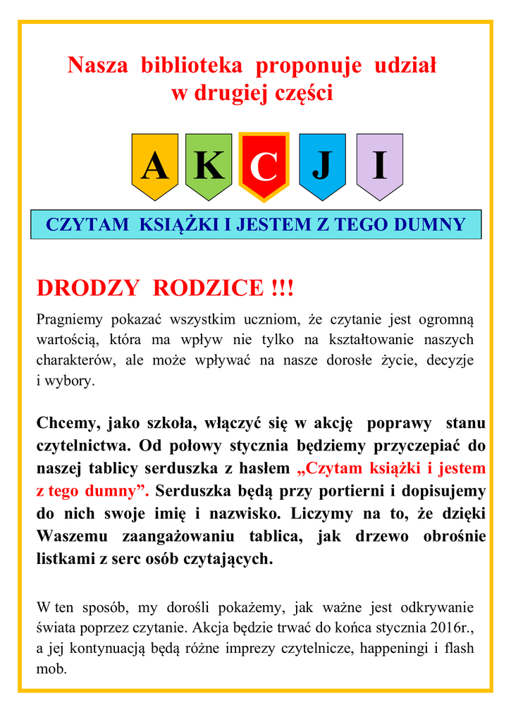 Nasza biblioteka proponuje udział w drugiej części A K C J I CZYTAM KSIĄŻKI I JESTEM Z TEGO DUMNY DRODZY RODZICE !!! C Pragniemy pokazać wszystkim uczniom, że czytanie jest ogromną wartością, która ma wpływ nie tylko na kształtowanie naszych charakterów, ale może wpływać na nasze dorosłe życie, decyzje i wybory. Chcemy, jako szkoła, włączyć się w akcję poprawy stanu czytelnictwa. Od połowy stycznia będziemy przyczepiać do naszej tablicy serduszka z hasłem „Czytam książki i jestem z tego dumny”. Serduszka będą przy portierni i dopisujemy do nich swoje imię i nazwisko. Liczymy na to, że dzięki Waszemu zaangażowaniu tablica, jak drzewo obrośnie listkami z serc osób czytających. W ten sposób, my dorośli pokażemy, jak ważne jest odkrywanie świata poprzez czytanie. Akcja będzie trwać do końca stycznia 2016r., a jej kontynuacją będą różne imprezy czytelnicze, happeningi i flash mob.