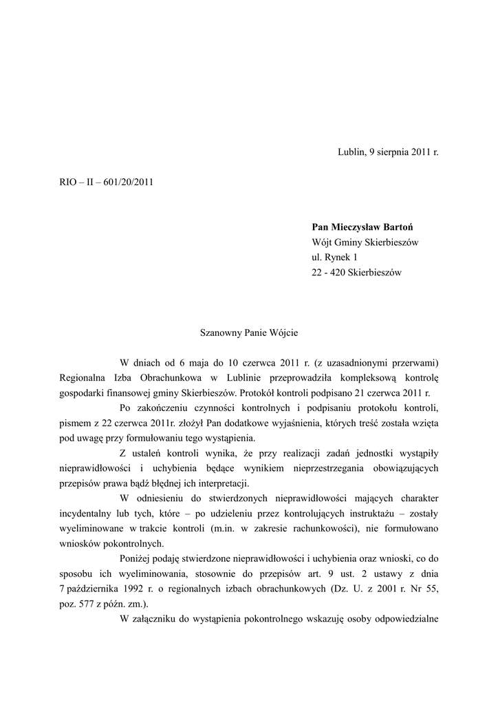 Lublin, 9 sierpnia 2011 r. RIO – II – 601/20/2011 Pan Mieczysław Bartoń Wójt Gminy Skierbieszów ul. Rynek 1 22 - 420 Skierbieszów Szanowny Panie Wójcie W dniach od 6 maja do 10 czerwca 2011 r. (z uzasadnionymi przerwami) Regionalna Izba Obrachunkowa w Lublinie przeprowadziła kompleksową kontrolę gospodarki finansowej gminy Skierbieszów. Protokół kontroli podpisano 21 czerwca 2011 r. Po zakończeniu czynności kontrolnych i podpisaniu protokołu kontroli, pismem z 22 czerwca 2011r. złożył Pan dodatkowe wyjaśnienia, których treść została wzięta pod uwagę przy formułowaniu tego wystąpienia. Z ustaleń kontroli wynika, że przy realizacji zadań jednostki wystąpiły nieprawidłowości i uchybienia będące wynikiem nieprzestrzegania obowiązujących przepisów prawa bądź błędnej ich interpretacji. W odniesieniu do stwierdzonych nieprawidłowości mających charakter incydentalny lub tych, które – po udzieleniu przez kontrolujących instruktażu – zostały wyeliminowane w trakcie kontroli (m.in. w zakresie rachunkowości), nie formułowano wniosków pokontrolnych. Poniżej podaję stwierdzone nieprawidłowości i uchybienia oraz wnioski, co do sposobu ich wyeliminowania, stosownie do przepisów art. 9 ust. 2 ustawy z dnia 7 października 1992 r. o regionalnych izbach obrachunkowych (Dz. U. z 2001 r. Nr 55, poz. 577 z późn. zm.). W załączniku do wystąpienia pokontrolnego wskazuję osoby odpowiedzialne 2 za stwierdzone nieprawidłowości. 1. W zakresie księgowości i sprawozdawczości budżetowej: 1.1. Niekompletne opracowanie dokumentacji opisującej przyjęte w jednostce zasady (politykę) rachunkowości, w wyniku nieopisania działania opcji służącej do obliczania skutków obniżenia górnych stawek w podatku rolnym, stanowiących podstawę sporządzenia sprawozdania Rb-PDP „Roczne sprawozdanie z wykonania dochodów podatkowych gminy”. Uzupełnić dokumentację opisującą przyjęte zasady (politykę) rachunkowości, przez opisanie działania opcji służącej do obliczania skutków obniżenia górnych stawek w podatku rolnym, stanowiących podstawę sporządzenia sprawozdania Rb–PDP, stosownie do przepisów art. 10 ust. 1 pkt 3 lit.c ustawy z dnia 29 września 1994 r. o rachunkowości (Dz. U. z 2009 r. Nr 152, poz. 1223 z późn. zm.) – str. 8, 9, 24 protokołu. Ponadto, rozważyć powierzenie obowiązków w zakresie prowadzenia ewidencji druków ścisłego zarachowania (w tym czeków gotówkowych, KP „Kasa przyjmie” i kwitariuszy przychodowych K-103) osobie innej niż kasjer, który jest jednocześnie upoważniony do ich pobierania i stosowania w celu dokumentowania obrotów kasowych, mając na uwadze przepisy art. 68 ust. 2 pkt 2 ustawy z dnia 27 sierpnia 2009 r. o finansach publicznych (Dz. U. Nr 157, poz. 1240 z późn. zm.) oraz standardem 14 „Szczegółowe mechanizmy kontroli dotyczące operacji finansowych i gospodarczych” Standardów kontroli zarządczej dla sektora finansów publicznych (komunikat Nr 23 Ministra Finansów z dnia 16 grudnia 2009 r. Dz. Urz. MF Nr 15, poz 84) – str. 7 protokołu. 2. W zakresie operacji pieniężnych i rozrachunków: 2.1. Nieterminowe regulowania zobowiązań wobec Izby Rolniczej. Wydatków dokonywać zgodnie z przepisami dotyczącymi poszczególnych rodzajów wydatków, stosownie do przepisów art. 44 ust. 2 ustawy o finansach publicznych, w szczególności wpłaty na rzecz izb rolniczych, w wysokości 2 % od uzyskanych wpływów z podatku rolnego, odprowadzać na rachunek bankowy właściwej izby w terminie 21 dni od dnia, w którym upływa termin płatności danej raty podatku rolnego, zgodnie z przepisami art. 35 ust. 2 ustawy z dnia 14 grudnia 1995 r. 3 o izbach rolniczych (Dz. U. z 2002 r. Nr 101, poz. 927 z późn. zm.) – str. 18 - 19 protokołu. 2.2. Nieujawnienie w trakcie inwentaryzacji – przeprowadzonej na 31 grudnia 2010 r. – różnicy między stanem rzeczywistym a ewidencyjnym stanem należności ujętych na kontach 226 „Długoterminowe należności budżetowe” i 221 „Należności z tytułu dochodów budżetowych”. Na ostatni dzień każdego roku obrotowego przeprowadzać rzetelną inwentaryzację należności metodą weryfikacji, porównując dane ksiąg rachunkowych z odpowiednimi dokumentami i weryfikując ich wartość, stosownie do przepisów art. 26 ust. 1 pkt 3 ustawy o rachunkowości – str. 20, 51 protokołu. 3. W zakresie wykonania budżetu: 3.1. W zakresie dochodów z tytułu podatków i opłat: 3.1.1. Nieprawidłowe sporządzenie sprawozdania Rb-PDP za okres od początku roku do 31 grudnia 2010 r., przez: - zaniżenie danych w kolumnie „skutki decyzji wydanych przez organ podatkowy na podstawie ustawy – Ordynacja podatkowa, obliczone za okres sprawozdawczy” w zakresie rozłożenia na raty, odroczenia terminu płatności podatku rolnego (o 58 zł) z powodu błędów rachunkowych, - zawyżenie skutków decyzji wydanych przez organ podatkowy w zakresie umorzeń zaległości w podatku rolnym (o 4.815,13 zł) i leśnym (o 144 zł), w wyniku ujęcia kwot wynikających z decyzji wydanych w grudniu 2010 r., a doręczonych w styczniu 2011 r. oraz błędów rachunkowych. W sprawozdaniu Rb-PDP „Roczne sprawozdanie z wykonania dochodów podatkowych gminy” wykazywać kwoty stanowiące rzeczywiste skutki decyzji wydanych przez organ podatkowy na podstawie ustawy Ordynacja podatkowa, obliczone za okres sprawozdawczy, stosownie do przepisów § 3 ust. 1 pkt 11 w związku z przepisami § 7 ust. 3 „Instrukcji sporządzania sprawozdań budżetowych w zakresie budżetów jednostek samorządu terytorialnego”, stanowiącej załącznik Nr 39 do rozporządzenia Ministra Finansów z dnia 3 lutego 2010 r. w sprawie sprawozdawczości budżetowej (Dz. U. Nr 20, poz. 103). W kolumnie „Skutki decyzji wydanych przez organ podatkowy na podstawie ustawy – Ordynacja podatkowa, obliczone za okres sprawozdawczy” w zakresie umorzeń zaległości podatkowych wykazyw