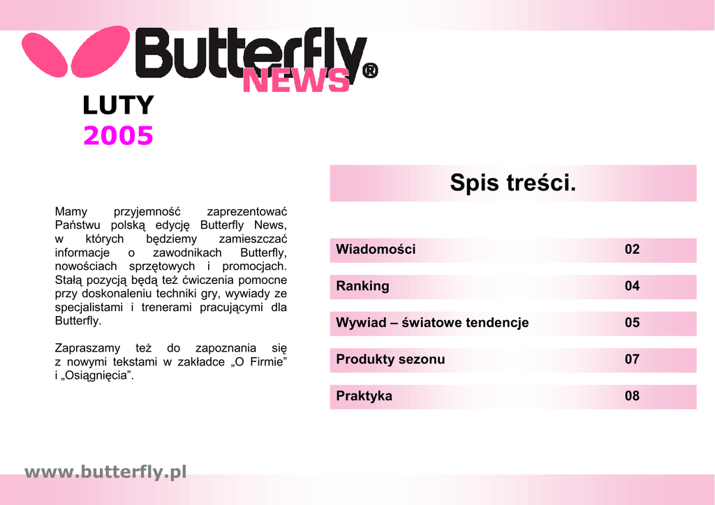 7 LUTY 2005 Spis treści. Mamy przyjemność zaprezentować Państwu polską edycję Butterfly News, w których będziemy zamieszczać informacje o zawodnikach Butterfly, nowościach sprzętowych i promocjach. Stałą pozycją będą teŜ ćwiczenia pomocne przy doskonaleniu techniki gry, wywiady ze specjalistami i trenerami pracującymi dla Butterfly. Zapraszamy teŜ do zapoznania się z nowymi tekstami w zakładce „O Firmie” i „Osiągnięcia”. www.butterfly.pl Wiadomości 02 Ranking 04 Wywiad – światowe tendencje 05 Produkty sezonu 07 Praktyka 08 02 Wiadomości www.butterfly.pl Gwiazdy Butterfly Podczas europejskiego TOP 12, który zakończył się 6 lutego 2005 roku w Rennes, połowa medali przypadła zawodnikom Butterfly. Wśród pań złoto zdobyła grająca w barwach Austrii Liu Jia, a srebro wywalczyła Węgierka Krisztina Toth. Wśród panów trzecie miejsce na podium zajął Timo Boll. Zwycięstwo Liu Jia, jak równieŜ Aleksieja Smirnowa, było sporym zaskoczeniem – oboje wygrali ten drugi co do waŜności turniej kontynentalny po raz pierwszy. Sama Liu Jia, nazywana przez przyjaciół Susi widzi dwie przyczyny swojego sukcesu : „W ubiegłym roku nie tylko poprawiłam znacznie technikę gry, ale teŜ bardziej uwierzyłam w siebie. Jechałam do Rennes aby wygrać turniej TOP 12. Z drugiej lokaty nie byłabym zadowolona.” Dzięki takiej postawie Liu, jako jedyna startująca zawodniczka, nie przegrała ani jednej gry w całym turnieju. Prezentując bardzo siłowy styl gry, pokonała tak utytułowane zawodniczki jak : Wenling Tan-Monfardini, Nicole Struse, Otilię Badescu, Michaelę Steff oraz Kristinę Toth. Faworytami w turnieju męŜczyzn byli Timo Boll, Werner Schlager oraz Michael Maze – zawodnicy sponsorowani przez Butterfly, a takŜe mistrz Europy Wladymir Samsonow. Jednak zwycięzcą został Aleksiej Smirnow, który do grona najlepszej dwunastki starego kontynentu zakwalifikował się tylko dzięki wycofaniu się Kalinikosa Kreangi (równieŜ zawodnika Butterfly). Sukces Smirnowa był tym większy, Ŝe w drodze po zwycięstwo pokonał obrońcę tytułu Michaela Maze oraz dwukrotnego złotego medalistę TOP 12 – Timo Bolla. LUTY 2005 www.butterfly.pl 03 Wiadomości World Press Foto Kontuzjowany Timo Boll, był jednak zadowolony ze swojego osiągnięcia „Nie zdąŜyłem się właściwie przygotować do tego turnieju. Teraz waŜniejszy jest dla mnie powrót do formy na Mistrzostwa Świata i Europy.” Mistrz świata Werner Schlager przegrał pojedynek w grupie z kolegą z ekipy Butterfly – Czechem Petrem Korbelem oraz ćwierćfinał z Samsonowem. RównieŜ jego zadeklarowanym celem są dwie najwaŜniejsze imprezy sezonu. Nagroda World Press Foto jest wręczana w kilku kategoriach i jest uwaŜana za najbardziej prestiŜowe wyróŜnienie fotograficzne na świecie. W tym roku w konkursie brało udział 69.190 zdjęć nadesłanych przez 4.266 profesjonalnych fotografów. NajwaŜniejszy po mistrzostwach Europy, turniej kontynentalny dostarczył wielu wraŜeń i niespodzianek. Przyniósł tez nadzieję, Ŝe być moŜe druga po Tamarze Boros, zawodniczka reprezentująca Europę – Liu Jia, moŜe powaŜnie zagrozić dominacji Chinek na tegorocznych mistrzostwach świata. W kategorii SPORT drugą nagrodę zdobyło zdjęcie autorstwa Donalda Miralle Jr. zrobione podczas Igrzysk Olimpijskich 2004 roku i przedstawiające zmagania tenisistów stołowych. LUTY 2005 www.butterfly.pl 04 Ranking Ranking ITTF 02.2005 MęŜczyźni 1 WANG Liqin CHN 2 MA Lin CHN 3 WANG Hao CHN 4 BOLL Timo GER 5 RYU Seung Min KOR 6 SAMSONOV Vladimir BLR 7 Chen Qi CHN 8 SCHLAGER Werner AUT 9 CHUAN Chih-Yuan TPE 10 KREANGA Kalinikos GRE 11 KONG Linghui CHN 12 SAIVE Jean-Michel BEL 13 CHIANG Peng-Lung TPE 14 MAZE Michael DEN 15 CHEN Weixing AUT 16 LEUNG Chu Yan HKG 17 LIU Guozheng CHN 18 KARLSSON Peter SWE 19 JOO Se Hyuk KOR 19 KORBEL Petr CZE 21 KEEN Trinko NED 22 OH Sang Eun KOR 23 WALDNER Jan-Ove SWE 24 KO Lai Chak HKG 25 HAO Shuai CHN 26 CRISAN Adrian ROU 27 ROSSKOPF Jörg GER 28 BLASZCZYK Lucjan POL 29 PRIMORAC Zoran CRO 30 SMIRNOV Alexei RUS Ranking ITTF 02.2005 Kobiety 1 ZHANG Yining CHN 2 NIU Jianfeng CHN 3 WANG Nan CHN 4 BOROS Tamara HRV 5 GUO Yue CHN 6 LI Jia Wei SIN 7 GUO Yan CHN 8 TIEYana HKG 9 KIM Kyung Ah KOR 10 LI Ju CHN 11 LAU Sui Fei HKG 12 CAO Zhen CHN 13 LIU Jia AUT 14 LI Xiaoxia CHN 15 GAO Jun USA 16 PAVLOVICH Viktoria BLR 17 LIN Ling HKG 18 ZHANG Rui HKG 19 SONG Ah Sim HKG 20 KIM Hyang Mi PRK 21 LI Nan CHN 22 FAN Ying CHN 23 UMEMURA Aya JPN 24 TOTH Krisztina HUN 25 KIM Hyon Hui PRK 25 STEFF Mihaela ROU 27 BAI Yang CHN 28 LEE Eun Sil KOR 29 PENG Luyang CHN 30 FUKUHARA Ai JPN Kolorem są zaznaczeni zawodnicy kontraktowi Butterfly. PoniŜej przedstawiamy wybrane okładziny, którymi grają. Feint Long II Raystorm Sriver EL LUTY 2005 Sriver Bryce www.butterfly.pl 05 Wywiad Mario Amizic (51) jest dyrektorem ds. sportowych Butterfly, doświadczonym trenerem, współtwórcą potęgi klubu Borussia Dusseldorf w latach osiemdziesiątych i dziewięćdziesiątych. W rozmowie z Butterfly News odpowiada na pytania dotyczące treningu specjalistycznego i ogólnorozwojowego, rywalizacji sportowej, taktyki i psychologii. W bieŜącym numerze Mario przedstawi swój pogląd na stan tenisa stołowego na świecie. Zapraszamy do lektury. Tendencje w światowym tenisie stołowym. Butterfly : Ostatnie dziesięć lat przyniosło znaczne zmiany w profesjonalnym tenisie stołowym. Jakie tendencje są najbardziej zauwaŜalne w tym obszarze? Mario Amizic : Dzięki mojej pracy jako dyrektora sportowego Butterfly i trenera młodych talentów zatrudnionego przez Japońską Federację Tenisa Stołowego, podróŜuję bardzo duŜo i mogę jednoznacznie stwierdzić znaczący rozwój tenisa stołowego na poziomie międzynarodowym. Prawie w kaŜdy weekend rozgrywany jest jakiś interesujący turniej, w skład serii Pro Tour wchodzi juŜ 16 turniejów, a w sekcji juniorskiej rozpoczął się prawdziwy boom za