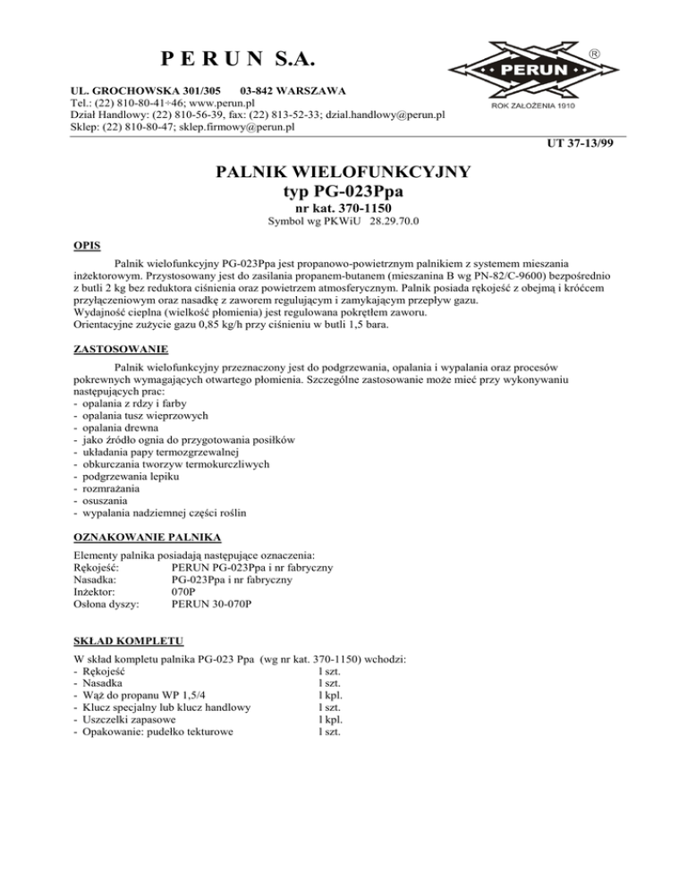 P E R U N S.A. UL. GROCHOWSKA 301/305 03-842 WARSZAWA Tel.: (22) 810-80-41÷46; www.perun.pl Dział Handlowy: (22) 810-56-39, fax: (22) 813-52-33; [email protected] Sklep: (22) 810-80-47; [email protected] UT 37-13/99 PALNIK WIELOFUNKCYJNY typ PG-023Ppa nr kat. 370-1150 Symbol wg PKWiU 28.29.70.0 OPIS Palnik wielofunkcyjny PG-023Ppa jest propanowo-powietrznym palnikiem z systemem mieszania inżektorowym. Przystosowany jest do zasilania propanem-butanem (mieszanina B wg PN-82/C-9600) bezpośrednio z butli 2 kg bez reduktora ciśnienia oraz powietrzem atmosferycznym. Palnik posiada rękojeść z obejmą i króćcem przyłączeniowym oraz nasadkę z zaworem regulującym i zamykającym przepływ gazu. Wydajność cieplna (wielkość płomienia) jest regulowana pokrętłem zaworu. Orientacyjne zużycie gazu 0,85 kg/h przy ciśnieniu w butli 1,5 bara. ZASTOSOWANIE Palnik wielofunkcyjny przeznaczony jest do podgrzewania, opalania i wypalania oraz procesów pokrewnych wymagających otwartego płomienia. Szczególne zastosowanie może mieć przy wykonywaniu następujących prac: - opalania z rdzy i farby - opalania tusz wieprzowych - opalania drewna - jako źródło ognia do przygotowania posiłków - układania papy termozgrzewalnej - obkurczania tworzyw termokurczliwych - podgrzewania lepiku - rozmrażania - osuszania - wypalania nadziemnej części roślin OZNAKOWANIE PALNIKA Elementy palnika posiadają następujące oznaczenia: Rękojeść: PERUN PG-023Ppa i nr fabryczny Nasadka: PG-023Ppa i nr fabryczny Inżektor: 070P Osłona dyszy: PERUN 30-070P SKŁAD KOMPLETU W skład kompletu palnika PG-023 Ppa (wg nr kat. 370-1150) wchodzi: - Rękojeść l szt. - Nasadka l szt. - Wąż do propanu WP 1,5/4 l kpl. - Klucz specjalny lub klucz handlowy l szt. - Uszczelki zapasowe l kpl. - Opakowanie: pudełko tekturowe l szt. 2 UT 37-13/99 Poz. 1. 2. Elementy palnika Rękojeść Nasadka Waga palnika Nr kat. 011-1000 011-2000 ~0,8 kg INFORMACJE DODATKOWE 1. 2. Do kompletu palnika załączone są „Przepisy obsługi palników propanowo-powietrznych" wg nr 3D-3/97. Dla każdego kompletu palnika udzielana jest gwarancja na okres 12 miesięcy od daty sprzedaży (z wyjątkiem części szybko zużywających się) jednak nie dłużej niż 18 miesięcy od daty produkcji.