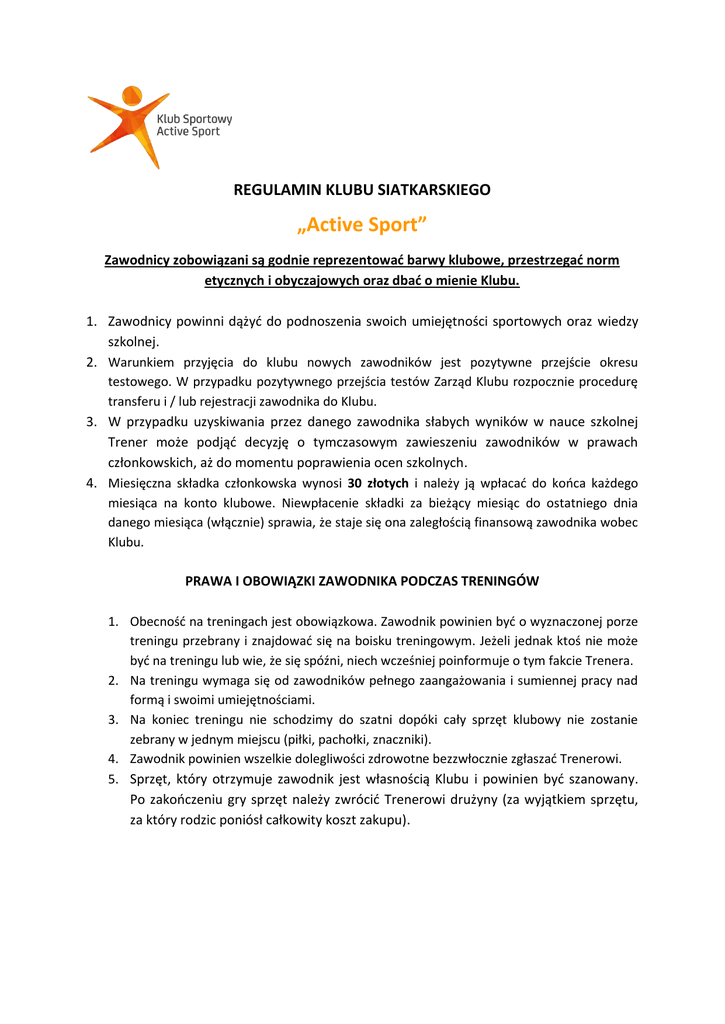 REGULAMIN KLUBU SIATKARSKIEGO „Active Sport” Zawodnicy zobowiązani są godnie reprezentowad barwy klubowe, przestrzegad norm etycznych i obyczajowych oraz dbad o mienie Klubu. 1. Zawodnicy powinni dążyd do podnoszenia swoich umiejętności sportowych oraz wiedzy szkolnej. 2. Warunkiem przyjęcia do klubu nowych zawodników jest pozytywne przejście okresu testowego. W przypadku pozytywnego przejścia testów Zarząd Klubu rozpocznie procedurę transferu i / lub rejestracji zawodnika do Klubu. 3. W przypadku uzyskiwania przez danego zawodnika słabych wyników w nauce szkolnej Trener może podjąd decyzję o tymczasowym zawieszeniu zawodników w prawach członkowskich, aż do momentu poprawienia ocen szkolnych. 4. Miesięczna składka członkowska wynosi 30 złotych i należy ją wpłacad do kooca każdego miesiąca na konto klubowe. Niewpłacenie składki za bieżący miesiąc do ostatniego dnia danego miesiąca (włącznie) sprawia, że staje się ona zaległością finansową zawodnika wobec Klubu. PRAWA I OBOWIĄZKI ZAWODNIKA PODCZAS TRENINGÓW 1. Obecnośd na treningach jest obowiązkowa. Zawodnik powinien byd o wyznaczonej porze treningu przebrany i znajdowad się na boisku treningowym. Jeżeli jednak ktoś nie może byd na treningu lub wie, że się spóźni, niech wcześniej poinformuje o tym fakcie Trenera. 2. Na treningu wymaga się od zawodników pełnego zaangażowania i sumiennej pracy nad formą i swoimi umiejętnościami. 3. Na koniec treningu nie schodzimy do szatni dopóki cały sprzęt klubowy nie zostanie zebrany w jednym miejscu (piłki, pachołki, znaczniki). 4. Zawodnik powinien wszelkie dolegliwości zdrowotne bezzwłocznie zgłaszad Trenerowi. 5. Sprzęt, który otrzymuje zawodnik jest własnością Klubu i powinien byd szanowany. Po zakooczeniu gry sprzęt należy zwrócid Trenerowi drużyny (za wyjątkiem sprzętu, za który rodzic poniósł całkowity koszt zakupu). PRAWA I OBOWIĄZKI ZAWODNIKA PODCZAS MECZÓW 1. Podstawą do gry zawodnika w meczach jest regularna oraz punktualna obecnośd, a także zaangażowanie na treningach. 2. W meczu ligowym mogą wystąpid tylko i wyłącznie zawodnicy uprawnieni do gry w Klubie oraz posiadający ważną kartę zdrowia sportowca. 3. Zabrania się wchodzenia do szatni osobom postronnym na 30 minut przed rozpoczęciem meczu ligowego oraz bezpośrednio po meczu ligowym. 4. Każda nieusprawiedliwiona nieobecnośd na meczu traktowana będzie jako lekceważące podejście do obowiązków zawodnika. 5. Na meczu zawodnicy zobowiązani są do pełnej koncentracji i zaangażowania. Każdy swoje sprawy osobiste, konflikty i animozje pozostawia poza boiskiem. 6. W meczach ligowych nie toleruje się zachowao niezgodnych z duchem fair play oraz dyskusji z sędzią. WYRÓŻNIENIA I NAGRODY 1. Za wybitne osiągnięcia sportowe, za ofiarną pracę na rzecz Klubu, Zarząd może przyznad następujące wyróżnienia: pochwałę dyplom nagrodę 2. Zarząd Klubu może przyznad również inne nagrody ustanowione własnymi przepisami i regulaminami. POSTANOWIENIA KOOCOWE 1. Za nieprzestrzeganie lub rażące naruszenie Regulaminu Zarząd Klubu może ukarad zawodnika następującymi karami: upomnienie zawieszenie zawodnika wykluczenia z Klubu 2. Zawieszony zawodnik nie może brad udziału w treningach oraz nie będzie brany pod uwagę przy wydarzeniach, w których uczestniczy Klub. 3. Zarejestrowany zawodnik może zmienid klub jedynie za zgodą Zarządu „Active Sport” 4. Regulamin może ulec zmianie i rozszerzeniu. Zarząd Klubu Sportowego „Active Sport”