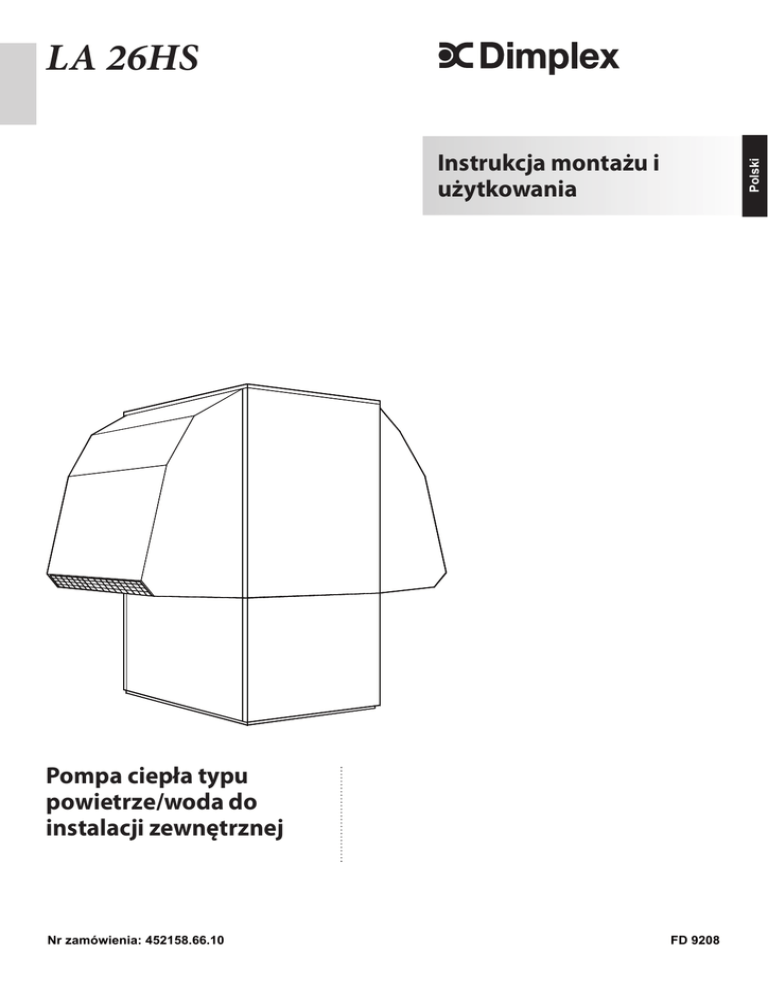 LA 26HS Polski Instrukcja montażu i użytkowania Pompa ciepła typu powietrze/woda do instalacji zewnętrznej Nr zamówienia: 452158.66.10 FD 9208 LA 26HS Spis treści Należy niezwłocznie zapoznać się z tekstem .......................................................................... PL-2 1.1 Ważne wskazówki ................................................................................................................................ PL-2 1.2 Użycie zgodne z przeznaczeniem ........................................................................................................ PL-2 1.3 Ustawowe przepisy i dyrektywy ............................................................................................................ PL-2 2 Zastosowanie pompy ciepła...................................................................................................... PL-3 2.1 Zakres zastosowania ............................................................................................................................ PL-3 2.2 Sposób działania .................................................................................................................................. PL-3 3 Zakres dostawy .......................................................................................................................... PL-3 3.1 Urządzenie podstawowe....................................................................................................................... PL-3 3.2 Rozdzielnia ........................................................................................................................................... PL-3 3.3 Sterownik pompy ciepła........................................................................................................................ PL-4 4 Transport..................................................................................................................................... PL-4 5 Instalacja ..................................................................................................................................... PL-4 5.1 Informacje ogólne ................................................................................................................................. PL-4 5.2 Przewód kondensatu ............................................................................................................................ PL-5 6 Montaż ......................................................................................................................................... PL-5 6.1 Informacje ogólne ................................................................................................................................. PL-5 6.2 Przyłącze od strony ogrzewania ........................................................................................................... PL-5 6.3 Przyłącze elektryczne ........................................................................................................................... PL-6 7 Uruchomienie ............................................................................................................................. PL-6 7.1 Informacje ogólne ................................................................................................................................. PL-6 7.2 Przygotowanie ...................................................................................................................................... PL-6 7.3 Sposób postępowania .......................................................................................................................... PL-6 8 Czyszczenie / pielęgnacja.......................................................................................................... PL-7 8.1 8.2 8.3 8.4 9 Pielęgnacja ........................................................................................................................................... PL-7 Czyszczenie od strony grzewczej......................................................................................................... PL-7 Czyszczenie od strony powietrza ......................................................................................................... PL-7 Konserwacja ......................................................................................................................................... PL-7 Usterki / diagnostyka ................................................................................................................. PL-8 10 Wyłączenie z eksploatacji / utylizacja ...................................................................................... PL-8 11 Informacje o urządzeniu ............................................................................................................ PL-9 Załącznik............................................................................................................................................... A-I Rysunek wymiarowy .................................................................................................................... A-II Wykresy........................................................................................................................................ A-III Schematy obwodowe................................................................................................................... A-V Schematy układów hydraulicznych........................................................................................... A-IX Deklaracja zgodności................................................................................................................. A-XII Prace konserwacyjne................................................................................................................ A-XIII www.dimplex.de 452158.66.10 · FD 9208 PL-1 Polski 1 LA 26HS 1 Należy niezwłocznie zapoznać się z tekstem 1.1 Użycie zgodne z przeznaczeniem Polski To urządzenie jest dop