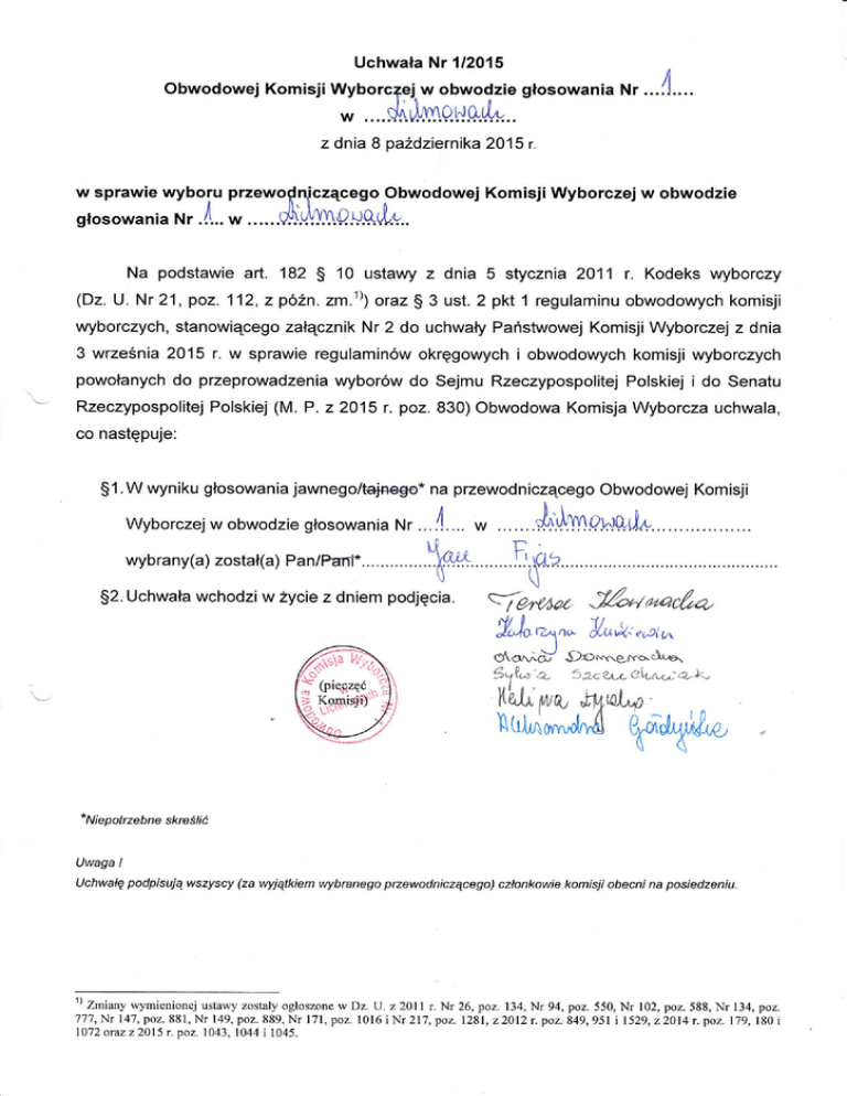 Obwodowej w sprawie wyboru przewoflĘczącego Obwodowej Komisji Wyborczej w obwodzie głosowan ia 1.1, . lł...,," ..,.,.Q!\.łW.\.,9].'.ądł,. Na podstawie art. 182 § ,10 ustawy z dnia 5 stycznia 2011 r. Kodeks wyborczy (Dz. U. Nr 21, poz. 112, z późn. zm.'\1 oraz § 3 ust. 2 pkt 1 regulaminu obwodowych komisji wyborczych, stanowiącego załącznik Nr 2 do uchwały Państwowej Komisji WyborczĄ z dnia 3 września20'15 r. w sprawie regulaminów okręgovvych i obwodowych komisji wyborczych powołanych do przeprowadzenia wyborów do Sejmu Rzeczypospolitej Polskiej i do Senatu Rzeczypospolitej Polskiej (M. P, z 2015 r, poz.830) Obwodowa Komisja Wyborcza uchwala, co następuje: §l.W wyniku głosowania jawnego/taj+łego- na przewodniczącego Obwodowej Komisji Wyborczej w obwodzie głosowania rul. wybrany(a) został(a) Pan/ffi ... l.... r, Wr* § §2. Uchwała wchodzi w życie z dniem podjęcia. ....,. .JO.'ir^Pldad^ T].].tCł9 q \ /eł%aŁ ..%ąo,ąńą, !,Jo,7n łoą,,uą^ Cdor.,,.a,J 9_0r."".p,r..'. 3r|u'ą_ 12c &ę, ?Ą_r_ C|L^,<,.' ą Ł- nti,,i*ilłó 0ufi,łil,o (( * Niepotrzebne skrcślić Uwaga ! Uchwałę podpisująwszyscy (za Wjątkiem Wbranego przewodniczącego) członkowie komisji obecni na posiedzeniu. 1) Zmiany wymienionej ustawy zo§tały ogłoszone w Dz. U. z 2011 r. Nr 26, poz. l34, Nr 94, poz. 55o, Nr l02, poz. 588, Nr t34, poz. 111,Nr I41, poz.88|, Nr l49, poz.889,NI 171, poz. l0lóiNr2t7,poz. l28l, z20l2 r. poz.849,95l i1529,z20l4 r. poz. l79, l80 i 10'72 oraz z 2015 l. poz. 1043, 1044 i 1045.