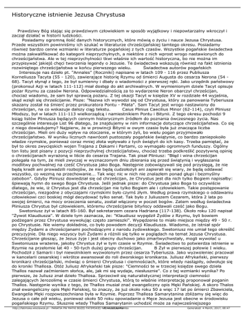 Historyczne istnienie Jezusa Chrystusa Prawdziwy Bóg stając się prawdziwym człowiekiem w sposób wyjątkowy i niepowtarzalny wkroczył i zaczął działać w historii ludzkości. Posiadamy ogromną ilość danych historycznych, które mówią o życiu i nauce Jezusa Chrystusa. Przede wszystkim powinniśmy ich szukać w literaturze chrześcijańskiej tamtego okresu. Posiadamy również bardzo cenne wzmianki w literaturze pogańskiej z tych czasów. Wszystkie pogańskie świadectwa można zakwalifikować do kategorii nieprzychylnych, a niektóre z nich wprost wrogo nastawionych do chrześcijaństwa. Ale w tej nieprzychylności tkwi właśnie ich wartość historyczna, bo nie można im przypisywać jakiejś chęci tworzenia legendy o Jezusie. Te świadectwa wskazują również na fakt istnienia rozwiniętego chrześcijaństwa w końcu pierwszego wieku. Świadectwa autorów pogańskich Interesuje nas dzieło pt. "Annales" (Roczniki) napisane w latach 109 - 116 przez Publiusza Korneliusza Tacyta (55 - 120), zawierające historię Rzymu od śmierci Augusta do cesarza Nerona (54 68). Tacyt słynął z tego, że był sumienny i dbały o wiadomości z pierwszej ręki. Jako urzędnik państwowy (prokonsul Azji w latach 111-112) miał dostęp do akt archiwalnych. W wymienionym dziele Tacyt opisuje pożar Rzymu za czasów Nerona. Odpowiedzialnością za to wydarzenie Neron obarczył chrześcijan, chociaż wiadomo, że sam był sprawcą pożaru. Z tej okazji Tacyt w księdze XV w rozdziale 44 wyjaśnia, skąd wzięli się chrześcijanie. Pisze: "Nazwa ich wywodzi się od Chrystusa, który za panowania Tyberiusza skazany został na śmierć przez prokuratora Pontu - Piłata". Sam Tacyt jest wrogo nastawiony do chrześcijan, na co wskazuje dalszy ciąg tekstu. Caius Plinius Caecilius Minor (62-114), czyli Pliniusz Młodszy, był w latach 111-113 wielkorządcą i namiestnikiem Pontu i Bitynii. Z tego okresu pochodzi 9 ksiąg listów Pliniusza będących cennym historycznym źródłem do poznania ówczesnego życia. Nas szczególnie interesuje List 96 dlatego, że znajdujemy w nim informacje dotyczące chrześcijaństwa. Co się z niego dowiadujemy? Najpierw, że w prowincji Bitynii w owym czasie była już znacząca liczba chrześcijan. Mieli oni duży wpływ na otoczenie, w którym żyli, bo wielu pogan przyjmowało chrześcijaństwo. W wyniku licznych nawróceń pustoszały pogańskie świątynie, co bardzo zaniepokoiło władze rzymskie, ponieważ coraz mniej złota wpływało z tych świątyń do ich kasy. Trzeba pamiętać, że był to okres zwycięskich wojen Trajana z Dakami i Partami, co wymagało ogromnych funduszy. Ogólny ton listu jest pisany z pozycji nieprzychylnej chrześcijaństwu, chociaż trzeba podkreślić pozytywną opinię o chrześcijanach wyrażoną w liście do cesarza Trajana. Tak pisał Pliniusz: "Błąd i wina chrześcijan polegała na tym, że mieli zwyczaj w wyznaczonym dniu zbierania się przed świątynią i wygłaszania modlitwy pochwalnej na cześć Chrystusa jako Boga. Następnie zobowiązywali się pod przysięgą, że nie będą kradli ani prowadzili rozbojów, że nie będą cudzołożyli ani zapierali się wiary, że będą oddawać wszystko, co wezmą na przechowanie... Tak więc nic w nich nie znalazłem ponad głupi i bezmyślny zabobon". Gdyby Pliniusz dowiedział się od chrześcijan, że Chrystus jest dla nich tylko Bogiem napisałby: śpiewają hymn do swego Boga Chrystusa. Jeśli jednak pisze: do Chrystusa jako Boga to oczywiście dlatego, że wie, iż Chrystus jest dla chrześcijan nie tylko Bogiem ale i człowiekiem. Takie postępowanie chrześcijan, niezgodne z obyczajami rzymskimi było czymś złym. Według prawa rzymskiego o oddawaniu człowiekowi czci boskiej mógł decydować tylko senat. Tak było z Juliuszem Cezarem, która 2 lata po swojej śmierci, na mocy orzeczenia senatu, został włączony w poczet bogów. Zatem według świadectwa Pliniusza Chrystus był człowiekiem, któremu chrześcijanie bityńscy oddawali cześć jako Bogu. Swetoniusz żył w latach 85-160. Był sekretarzem cezara Hadriana (117-138). Około roku 120 napisał "Żywot Klaudiusza". W dziele tym zaznacza, że: "Klaudiusz wypędził Żydów z Rzymu, byli bowiem podżegani przez Chrystusa wywołując często zamieszki". Wypędzenie to miało miejsce między 49 - 50 r. po Chrystusie. Nie wiemy dokładnie, co było powodem decyzji Klaudiusza. Wiadomo, że istniał spór między Żydami a chrześcijanami pochodzącymi z narodu żydowskiego. Swetoniusz nie umiał tego określić precyzyjnie. Dla niego wszyscy byli Żydami a różnili się tylko w poglądach na temat Jezusa Chrystusa. Chrześcijanie głosząc, że Jezus żyje i jest obecny duchowo jako zmartwychwstały, mogli wywołać u Swetoniusza wrażenie, jakoby Chrystus żył w tym czasie w Rzymie. Świadectwo to potwierdza istnienie w Rzymie na przełomie lat 40 - 50-tych dużej grupy chrześcijan. B Żył w pierwszej połowie I wieku. Pochodził z Samarii i był niewolnikiem wyzwolonym przez cesarza Tyberiusza. Jako wyzwoleniec pracował w kancelarii cesarskiej i wkrótce awansował do roli dworskiego kronikarza. Juliusz Afrykański, pierwszy kronikarz chrześcijański, mówiąc o śmierci Chrystusa i ciemnościach, które wtedy nastąpiły, odwołuje się do kroniki Thallosa. Otóż Juliusz Afrykański tak pisze: "Ciemności te w trzeciej księdze swego dzieła Thallos nazwał zaćmieniem słońca, ale, jak mi się wydaje, niesłusznie". Co z tej wzmianki wynika? Po pierwsze, że Juliusz znał dzieło Thallosa. Sprzeciwił się naturalistycznej interpretacji ciemności zalegających Jerozolimę w czasie śmierci Chrystusa, którą to właśnie interpretację proponował poganin Thallos. Następnie wynika z tego, że Thallos musiał znać ewangeliczny opis Męki Pańskiej. A skoro Thalos znał ewangeliczny opis Męki Pańskiej, to znaczy, że już około roku 50 a więc 17 lat po śmierci Zbawiciela, Ewangelia Męki r