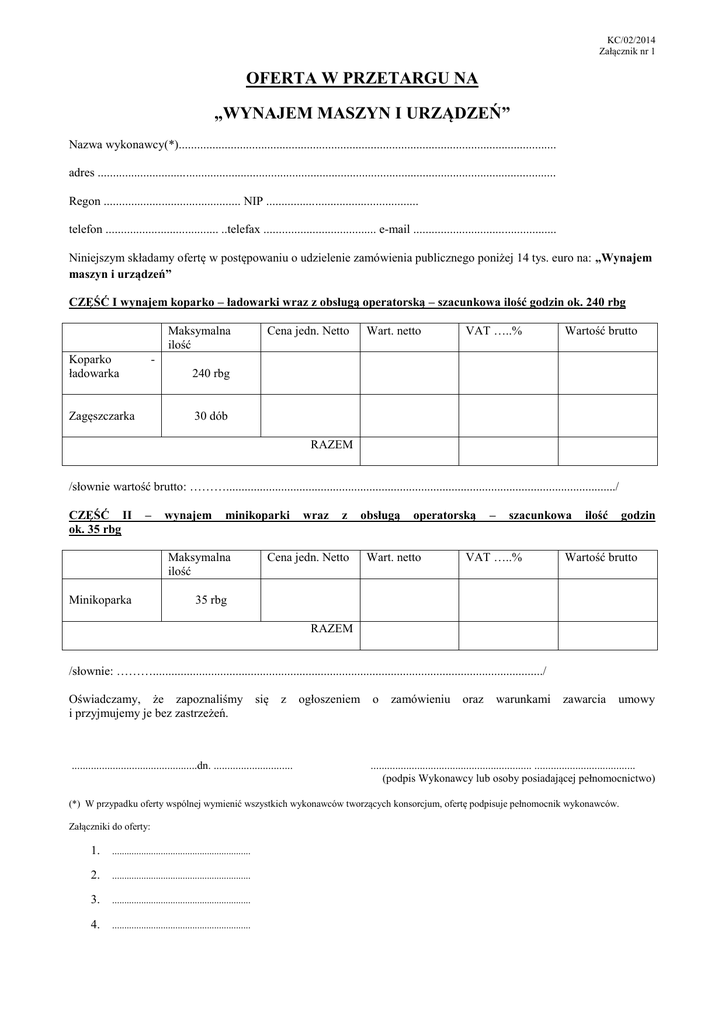 KC/02/2014 Załącznik nr 1 OFERTA W PRZETARGU NA „WYNAJEM MASZYN I URZĄDZEŃ” Nazwa wykonawcy(*)............................................................................................................................ adres ....................................................................................................................................................... Regon ............................................. NIP .................................................. telefon ..................................... ..telefax ..................................... e-mail ............................................... Niniejszym składamy ofertę w postępowaniu o udzielenie zamówienia publicznego poniżej 14 tys. euro na: „Wynajem maszyn i urządzeń” CZĘŚĆ I wynajem koparko – ładowarki wraz z obsługą operatorską – szacunkowa ilość godzin ok. 240 rbg Maksymalna ilość Koparko ładowarka Cena jedn. Netto Wart. netto VAT …..% Wartość brutto 240 rbg Zagęszczarka 30 dób RAZEM /słownie wartość brutto: ………................................................................................................................................/ CZĘŚĆ II ok. 35 rbg – wynajem minikoparki Maksymalna ilość Minikoparka wraz z Cena jedn. Netto obsługą operatorską Wart. netto – szacunkowa VAT …..% ilość godzin Wartość brutto 35 rbg RAZEM /słownie: ………................................................................................................................................/ Oświadczamy, że zapoznaliśmy i przyjmujemy je bez zastrzeżeń. się z ..............................................dn. ............................. ogłoszeniem o zamówieniu oraz warunkami zawarcia umowy ........................................................... ..................................... (podpis Wykonawcy lub osoby posiadającej pełnomocnictwo) (*) W przypadku oferty wspólnej wymienić wszystkich wykonawców tworzących konsorcjum, ofertę podpisuje pełnomocnik wykonawców. Załączniki do oferty: 1. ......................................................... 2. ......................................................... 3. ......................................................... 4. ......................................................... KC/02/2014 Załącznik nr 2 ………………………………. (pieczęć Wykonawcy) WYKAZ JEDNOSTEK SPRZĘTOWYCH WYKONAWCY OFEROWANYCH DO WYNAJMU ORAZ OSOB BIORĄCYCH UDZIAŁ W REALIZACJI ZAMÓWIENIA (operator) DO WYNAJMU OFERUJEMY:* Dla części I KOPARKO - ŁADOWARKA m-ka ………………..………… typ…………………..……….. model……………….……………… Oświadczamy, że w/w jednostka sprzętowa jest zgodna z Wymaganiami Zamawiającego, podanymi w rozdz. II pkt.2A ogłoszenia o zamówieniu tj. posiada: - Moc - ……………….. KM - pojemność łyżki przedniej …………… - wymienne łyżki tylne ………………… - zasięg tylnej łyżki …………………… - szerokość łyżki do skarpowania ……………… Dla części I ZAGĘSZCZARKA m-ka ………………………………… typ ………………………….. model……………………………… Oświadczamy, że w/w jednostka sprzętowa jest zgodna z wymaganiami Zamawiającego, podanymi w rozdz. II pkt. 2A ogłoszenia. Dla części II MINIKOPARKA m-ka ………………………………… typ ………………………….. model……………………………… Oświadczamy, że w/w jednostka sprzętowa jest zgodna z wymaganiami Zamawiającego, podanymi w rozdz. II pkt. 2B ogłoszenia. WYKAZ OSÓB BIORĄCYCH UDZIAŁ W POSTĘPOWANIU (dla części I i II)* Imię i Nazwisko oraz posiadane uprawnienia *dołączyć kserokopie dokumentów wskazanych w dziale II pkt.2 a i b ..............................................dn. ............................. ................................................................................................ (podpis Wykonawcy lub osoby posiadającej pełnomocnictwo)