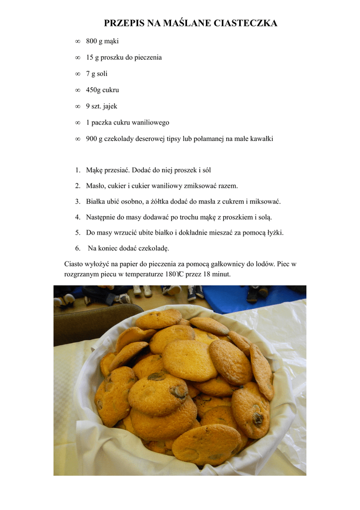 PRZEPIS NA MAŚLANE CIASTECZKA • 800 g mąki • 15 g proszku do pieczenia • 7 g soli • 450g cukru • 9 szt. jajek • 1 paczka cukru waniliowego • 900 g czekolady deserowej tipsy lub połamanej na małe kawałki 1. Mąkę przesiać. Dodać do niej proszek i sól 2. Masło, cukier i cukier waniliowy zmiksować razem. 3. Białka ubić osobno, a żółtka dodać do masła z cukrem i miksować. 4. Następnie do masy dodawać po trochu mąkę z proszkiem i solą. 5. Do masy wrzucić ubite białko i dokładnie mieszać za pomocą łyżki. 6. Na koniec dodać czekoladę. Ciasto wyłożyć na papier do pieczenia za pomocą gałkownicy do lodów. Piec w rozgrzanym piecu w temperaturze 180°C przez 18 minut.