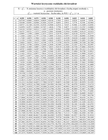 Wartości krytyczne rozkładu chi-kwadrat X ~ χ2ν - X zmienna losowa o rozkładzie chi-kwadrat z liczbą stopni swobody ν, α - poziom istotności, 2 χ α, ν - wartość krytyczna - liczba taka, Ŝe P(X > χ2 α, ν ) = α ν \ a 1 2 3 4 5 6 7 8 9 10 11 12 13 14 15 16 17 18 19 20 21 22 23 24 25 26 27 28 29 30 31 32 33 34 35 36 37 38 39 40 45 50 55 60 65 70 75 80 85 90 95 100 0,995 0,04393 0,0100 0,0717 0,2070 0,4118 0,6757 0,9893 1,3444 1,7349 2,1558 2,6032 3,0738 3,5650 4,0747 4,6009 5,1422 5,6973 6,2648 6,8439 7,4338 8,0336 8,6427 9,2604 9,8862 10,5196 11,1602 11,8077 12,4613 13,1211 13,7867 14,4577 15,1340 15,8152 16,5013 17,1917 17,8868 18,5859 19,2888 19,9958 20,7066 24,3110 27,9908 31,7349 35,5344 39,3832 43,2753 47,2061 51,1719 55,1695 59,1963 63,2495 67,3275 0,990 0,0002 0,0201 0,1148 0,2971 0,5543 0,8721 1,2390 1,6465 2,0879 2,5582 3,0535 3,5706 4,1069 4,6604 5,2294 5,8122 6,4077 7,0149 7,6327 8,2604 8,8972 9,5425 10,1957 10,8563 11,5240 12,1982 12,8785 13,5647 14,2564 14,9535 15,6555 16,3622 17,0735 17,7891 18,5089 19,2326 19,9603 20,6914 21,4261 22,1642 25,9012 29,7067 33,5705 37,4848 41,4436 45,4417 49,4751 53,5400 57,6339 61,7540 65,8983 70,0650 0,975 0,0010 0,0506 0,2158 0,4844 0,8312 1,2373 1,6899 2,1797 2,7004 3,2470 3,8157 4,4038 5,0087 5,6287 6,2621 6,9077 7,5642 8,2307 8,9065 9,5908 10,2829 10,9823 11,6885 12,4011 13,1197 13,8439 14,5734 15,3079 16,0471 16,7908 17,5387 18,2908 19,0467 19,8062 20,5694 21,3359 22,1056 22,8785 23,6543 24,4331 28,3662 32,3574 36,3981 40,4817 44,6030 48,7575 52,9419 57,1532 61,3888 65,6466 69,9249 74,2219 0,950 0,0039 0,1026 0,3518 0,7107 1,1455 1,6354 2,1673 2,7326 3,3251 3,9403 4,5748 5,2260 5,8919 6,5706 7,2609 7,9616 8,6718 9,3904 10,1170 10,8508 11,5913 12,3380 13,0905 13,8484 14,6114 15,3792 16,1514 16,9279 17,7084 18,4927 19,2806 20,0719 20,8665 21,6643 22,4650 23,2686 24,0749 24,8839 25,6954 26,5093 30,6123 34,7642 38,9581 43,1880 47,4496 51,7393 56,0541 60,3915 64,7494 69,1260 73,5198 77,9294 0,900 0,0158 0,2107 0,5844 1,0636 1,6103 2,2041 2,8331 3,4895 4,1682 4,8652 5,5778 6,3038 7,0415 7,7895 8,5468 9,3122 10,0852 10,8649 11,6509 12,4426 13,2396 14,0415 14,8480 15,6587 16,4734 17,2919 18,1139 18,9392 19,7677 20,5992 21,4336 22,2706 23,1102 23,9522 24,7966 25,6433 26,4921 27,3430 28,1958 29,0505 33,3504 37,6886 42,0596 46,4589 50,8829 55,3289 59,7946 64,2778 68,7771 73,2911 77,8184 82,3581 0,100 2,7055 4,6052 6,2514 7,7794 9,2363 10,6446 12,0170 13,3616 14,6837 15,9872 17,2750 18,5493 19,8119 21,0641 22,3071 23,5418 24,7690 25,9894 27,2036 28,4120 29,6151 30,8133 32,0069 33,1962 34,3816 35,5632 36,7412 37,9159 39,0875 40,2560 41,4217 42,5847 43,7452 44,9032 46,0588 47,2122 48,3634 49,5126 50,6598 51,8050 57,5053 63,1671 68,7962 74,3970 79,9730 85,5270 91,0615 96,5782 102,0789 107,5650 113,0377 118,4980 0,050 3,8415 5,9915 7,8147 9,4877 11,0705 12,5916 14,0671 15,5073 16,9190 18,3070 19,6752 21,0261 22,3620 23,6848 24,9958 26,2962 27,5871 28,8693 30,1435 31,4104 32,6706 33,9245 35,1725 36,4150 37,6525 38,8851 40,1133 41,3372 42,5569 43,7730 44,9853 46,1942 47,3999 48,6024 49,8018 50,9985 52,1923 53,3835 54,5722 55,7585 61,6562 67,5048 73,3115 79,0820 84,8206 90,5313 96,2167 101,8795 107,5217 113,1452 118,7516 124,3421 0,025 5,0239 7,3778 9,3484 11,1433 12,8325 14,4494 16,0128 17,5345 19,0228 20,4832 21,9200 23,3367 24,7356 26,1189 27,4884 28,8453 30,1910 31,5264 32,8523 34,1696 35,4789 36,7807 38,0756 39,3641 40,6465 41,9231 43,1945 44,4608 45,7223 46,9792 48,2319 49,4804 50,7251 51,9660 53,2033 54,4373 55,6680 56,8955 58,1201 59,3417 65,4101 71,4202 77,3804 83,2977 89,1772 95,0231 100,8393 106,6285 112,3933 118,1359 123,8580 129,5613 0,010 6,6349 9,2104 11,3449 13,2767 15,0863 16,8119 18,4753 20,0902 21,6660 23,2093 24,7250 26,2170 27,6882 29,1412 30,5780 31,9999 33,4087 34,8052 36,1908 37,5663 38,9322 40,2894 41,6383 42,9798 44,3140 45,6416 46,9628 48,2782 49,5878 50,8922 52,1914 53,4857 54,7754 56,0609 57,3420 58,6192 59,8926 61,1620 62,4281 63,6908 69,9569 76,1538 82,2920 88,3794 94,4220 100,4251 106,3929 112,3288 118,2356 124,1162 129,9725 135,8069 0,005 7,8794 10,5965 12,8381 14,8602 16,7496 18,5475 20,2777 21,9549 23,5893 25,1881 26,7569 28,2997 29,8193 31,3194 32,8015 34,2671 35,7184 37,1564 38,5821 39,9969 41,4009 42,7957 44,1814 45,5584 46,9280 48,2898 49,6450 50,9936 52,3355 53,6719 55,0025 56,3280 57,6483 58,9637 60,2746 61,5811 62,8832 64,1812 65,4753 66,7660 73,1660 79,4898 85,7491 91,9518 98,1049 104,2148 110,2854 116,3209 122,3244 128,2987 134,2466 140,1697