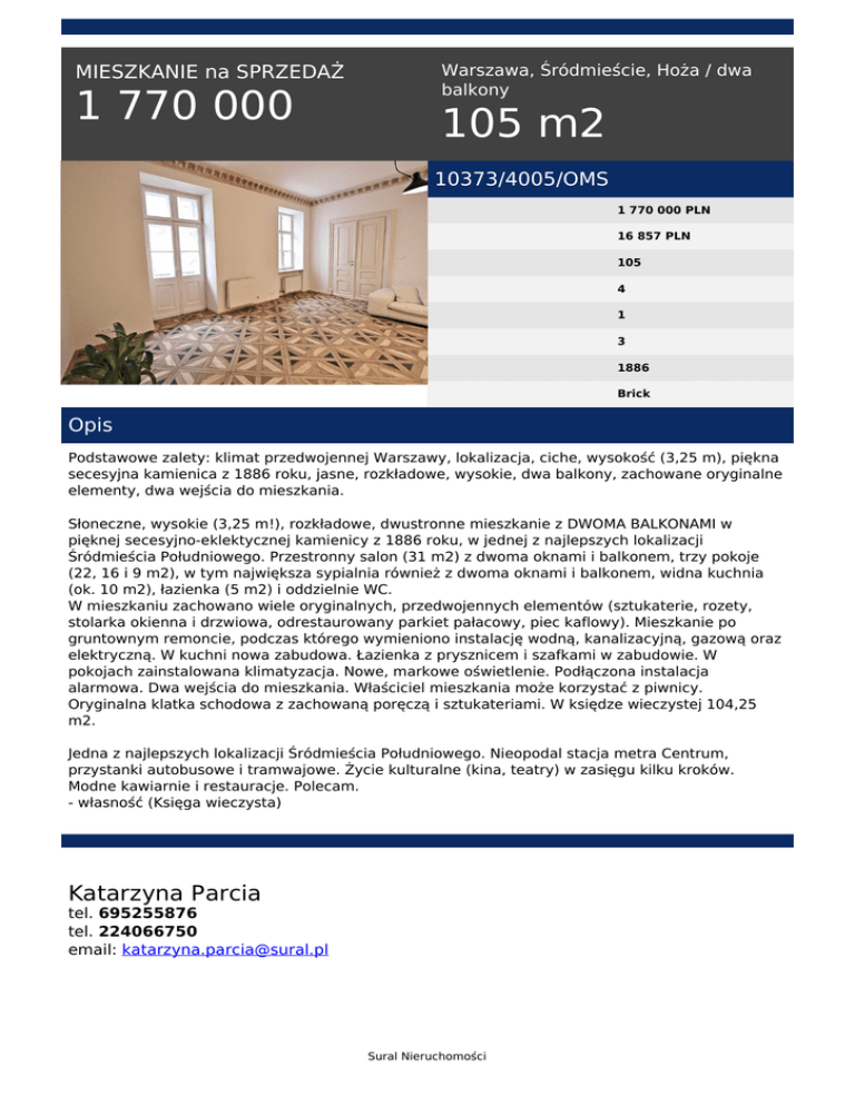 MIESZKANIE na SPRZEDAŻ 1 770 000 Warszawa, Śródmieście, Hoża / dwa balkony 105 m2 10373/4005/OMS 1 770 000 PLN 16 857 PLN 105 4 1 3 1886 Brick Opis Podstawowe zalety: klimat przedwojennej Warszawy, lokalizacja, ciche, wysokość (3,25 m), piękna secesyjna kamienica z 1886 roku, jasne, rozkładowe, wysokie, dwa balkony, zachowane oryginalne elementy, dwa wejścia do mieszkania. Słoneczne, wysokie (3,25 m!), rozkładowe, dwustronne mieszkanie z DWOMA BALKONAMI w pięknej secesyjno-eklektycznej kamienicy z 1886 roku, w jednej z najlepszych lokalizacji Śródmieścia Południowego. Przestronny salon (31 m2) z dwoma oknami i balkonem, trzy pokoje (22, 16 i 9 m2), w tym największa sypialnia również z dwoma oknami i balkonem, widna kuchnia (ok. 10 m2), łazienka (5 m2) i oddzielnie WC. W mieszkaniu zachowano wiele oryginalnych, przedwojennych elementów (sztukaterie, rozety, stolarka okienna i drzwiowa, odrestaurowany parkiet pałacowy, piec kaflowy). Mieszkanie po gruntownym remoncie, podczas którego wymieniono instalację wodną, kanalizacyjną, gazową oraz elektryczną. W kuchni nowa zabudowa. Łazienka z prysznicem i szafkami w zabudowie. W pokojach zainstalowana klimatyzacja. Nowe, markowe oświetlenie. Podłączona instalacja alarmowa. Dwa wejścia do mieszkania. Właściciel mieszkania może korzystać z piwnicy. Oryginalna klatka schodowa z zachowaną poręczą i sztukateriami. W księdze wieczystej 104,25 m2. Jedna z najlepszych lokalizacji Śródmieścia Południowego. Nieopodal stacja metra Centrum, przystanki autobusowe i tramwajowe. Życie kulturalne (kina, teatry) w zasięgu kilku kroków. Modne kawiarnie i restauracje. Polecam. - własność (Księga wieczysta) Katarzyna Parcia tel. 695255876 tel. 224066750 email: [email protected] Sural Nieruchomości Powered by TCPDF (www.tcpdf.org)
