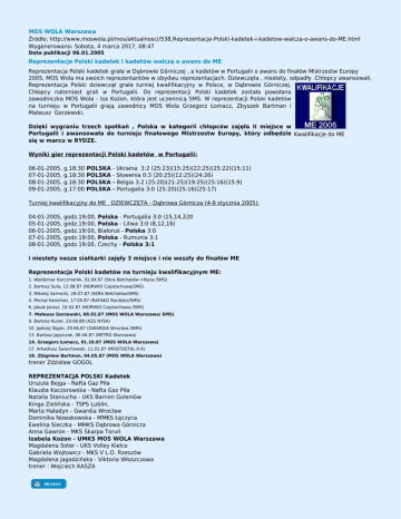 MOS WOLA Warszawa Źródło: http://www.moswola.pl/mos/aktualnosci/538,Reprezentacje-Polski-kadetek-i-kadetow-walcza-o-awans-do-ME.html Wygenerowano: Sobota, 4 marca 2017, 08:47 Data publikacji 06.01.2005 Reprezentacje Polski kadetek i kadetów walczą o awans do ME Reprezentacja Polski kadetek grała w Dąbrowie Górniczej , a kadetów w Portugalii o awans do finałów Mistrzostw Europy 2005. MOS Wola ma swoich reprezentantów w obydwu reprezentacjach. Dziewczęta , niestety, odpadły .Chłopcy awansowali. Reprezentacja Polski dziewcząt grała turniej kwalifikacyjny w Polsce, w Dąbrowie Górniczej. Chłopcy natomiast grali w Portugalii. Do reprezentacji Polski kadetek została powołana zawodniczka MOS Wola - Iza Kożon, która jest uczennicą SMS. W reprezentacji Polski kadetów na turnieju w Portugalii grają zawodnicy MOS Wola Grzegorz Łomacz, Zbyszek Bartman i Mateusz Gorzewski. Dzięki wygraniu trzech spotkań , Polska w kategorii chłopców zajęła II miejsce w Portugalii i awansowała do turnieju finałowego Mistrzostw Europy, który odbędzie Kwalifikacje do ME się w marcu w RYDZE. Wyniki gier reprezentacji Polski kadetów w Portugalii: 06-01-2005, g.18:30 POLSKA - Ukraina 3:2 (25:23)(15:25)(22:25)(25:22)(15:11) 07-01-2005, g.18:30 POLSKA - Słowenia 0:3 (20:25)(12:25)(24:26) 08-01-2005, g.18:30 POLSKA - Belgia 3:2 (25:20)(21:25)(19:25)(25:16)(15:9) 09-01-2005, g.17:00 POLSKA - Portugalia 3:0 (25:20)(25:16)(25:17) Turniej kwalifikacyjny do ME DZIEWCZĘTA - Dąbrowa Górnicza (4-8 stycznia 2005): 04-01-2005, godz.19:00, Polska - Portugalia 3:0 (15,14,220 05-01-2005, godz.19:00, Polska - Litwa 3:0 (8,12,16) 06-01-2005, godz.19:00, Białoruś - Polska 3:0 07-01-2005, godz.19:00, Polska - Rumunia 3:1 08-01-2005, godz.19:00, Czechy - Polska 3:1 i niestety nasze siatkarki zajęły 3 miejsce i nie weszły do finałów ME Reprezentacja Polski kadetów na turnieju kwalifikacyjnym ME: 1. Waldemar Karczmarek, 02.04.87 (Skra Bełchatów->Nysa /SMS) 2. Bartosz Sufa, 11.08.87 (NORWID Częstochowa/SMS) 3. Mikołaj Sarnecki, 29.07.87 (SKRA Bełchatów/SMS) 4. Michał Kamiński, 17.05.87 (RAFAKO Racibórz/SMS) 6. Jakub Jarosz, 10.02.87 (NORWID Częstochowa./SMS) 7. Mateusz Gorzewski, 08.02.87 (MOS WOLA Warszawa/ SMS) 9. Bartosz Kurek, 29.08.88 (AZS NYSA) 10. Jędrzej Śląski, 29.06.87 (GWARDIA Wrocław./SMS) 13. Bartosz Jajszczak, 06.04.87 (METRO Warszawa) 14. Grzegorz Łomacz, 01.10.87 (MOS WOLA Warszawa) 17. Arkadiusz Świechowski, 11.01.87 (MOSTOSTAL K-K) 18. Zbigniew Bartman, 04.05.87 (MOS WOLA Warszawa) trener Zdzisław GOGOL REPREZENTACJA POLSKI Kadetek Urszula Bejga - Nafta Gaz Piła Klaudia Kaczorowska - Nafta Gaz Piła Natalia Staniucha - UKS Barnim Goleniów Kinga Zielińska - TSPS Lublin, Marta Haładyn - Gwardia Wrocław Dominika Nowakowska - MMKS Łęczyca Ewelina Sieczka - MMKS Dąbrowa Górnicza Anna Gawron - MKS Skarpa Toruń Izabela Kożon - UMKS MOS WOLA Warszawa Magdalena Soter - UKS Volley Kielce Gabriela Wojtowicz - MKS V L.O. Rzeszów Magdalena Jagodzińska - Viktoria Włoszczowa trener : Wojciech KASZA Komentarz (0) dodaj komentarz Brak komentarzy dodaj komentarz