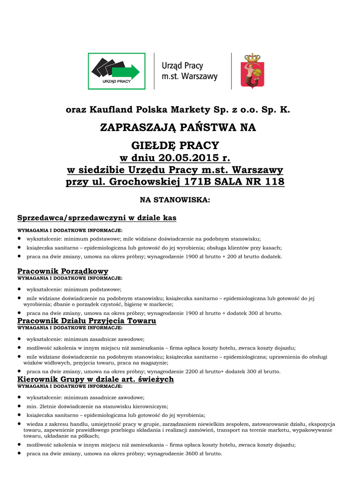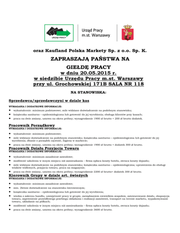 oraz Kaufland Polska Markety Sp. z o.o. Sp. K. ZAPRASZAJĄ PAŃSTWA NA GIEŁDĘ PRACY w dniu 20.05.2015 r. w siedzibie Urzędu Pracy m.st. Warszawy przy ul. Grochowskiej 171B SALA NR 118 NA STANOWISKA: Sprzedawca/sprzedawczyni w dziale kas WYMAGANIA I DODATKOWE INFORMACJE: • • • wykształcenie: minimum podstawowe; mile widziane doświadczenie na podobnym stanowisku; książeczka sanitarno – epidemiologiczna lub gotowość do jej wyrobienia; obsługa klientów przy kasach; praca na dwie zmiany, umowa na okres próbny; wynagrodzenie 1900 zł brutto + 200 zł brutto dodatek. Pracownik Porządkowy WYMAGANIA I DODATKOWE INFORMACJE: • • wykształcenie: minimum podstawowe; mile widziane doświadczenie na podobnym stanowisku; książeczka sanitarno – epidemiologiczna lub gotowość do jej wyrobienia; dbanie o porządek czystość, higienę w markecie; • praca na dwie zmiany, umowa na okres próbny; wynagrodzenie 1900 zł brutto + dodatek 300 zł brutto. Pracownik Działu Przyjęcia Towaru WYMAGANIA I DODATKOWE INFORMACJE: • • • wykształcenie: minimum zasadnicze zawodowe; możliwość szkolenia w innym miejscu niż zamieszkania – firma opłaca koszty hotelu, zwraca koszty dojazdu; mile widziane doświadczenie na podobnym stanowisku; książeczka sanitarno – epidemiologiczna; uprawnienia do obsługi wózków widłowych, przyjęcia towaru, praca na magazynie; • praca na dwie zmiany, umowa na okres próbny; wynagrodzenie 2200 zł brutto+ dodatek 300 zł brutto. Kierownik Grupy w dziale art. świeżych WYMAGANIA I DODATKOWE INFORMACJE: • • • • • • wykształcenie: minimum zasadnicze zawodowe; min. 2letnie doświadczenie na stanowisku kierowniczym; książeczka sanitarno – epidemiologiczna lub gotowość do jej wyrobienia; wiedza z zakresu handlu, umiejętność pracy w grupie, zarządzaniem niewielkim zespołem, zatowarowanie działu, ekspozycja towaru, zapewnienie prawidłowego przebiegu składania i realizacji zamówień, transport na terenie marketu, wypakowywanie towaru, układanie na półkach; możliwość szkolenia w innym miejscu niż zamieszkania – firma opłaca koszty hotelu, zwraca koszty dojazdu; praca na dwie zmiany, umowa na okres próbny; wynagrodzenie 3600 zł brutto. Pracownik Informacji WYMAGANIA I DODATKOWE INFORMACJE: • • • • wykształcenie: minimum zasadnicze zawodowe; doświadczenie mile widziane na podobnym stanowisku; książeczka sanitarno – epidemiologiczna lub gotowość do jej wyrobienia; umiejętność obsługi komputera, obsługa klientów, rozpatrywanie reklamacji, dokonywanie zwrotów; obsługa centrali komunikacyjnej; • możliwość szkolenia w innym miejscu niż zamieszkania – firma opłaca koszty hotelu, zwraca koszty dojazdu; • praca na dwie zmiany, umowa na okres próbny; wynagrodzenie 2200 zł brutto. Kierownik Grupy w dziale art. spożywczych WYMAGANIA I DODATKOWE INFORMACJE: • • • • • • wykształcenie: minimum zasadnicze zawodowe; warunek konieczny doświadczenie na stanowisku kierowniczym; książeczka sanitarno – epidemiologiczna lub gotowość do jej wyrobienia; możliwość szkolenia w innym miejscu niż zamieszkania – firma opłaca koszty hotelu, zwraca koszty dojazdu; wiedza nt. towaru, umiejętność pracy w grupie, kierowanie grupą , zarządzanie niewielkim zespołem ludzi, zapewnienie zatowarowania działu, ekspozycja towarów, zapewnienie prawidłowego przebiegu składania realizacji zamówień. ; praca na dwie zmiany, umowa na okres próbny; wynagrodzenie 2900 zł brutto. Wszystkie osoby zainteresowane prosimy o zgłaszanie się do pośredników pracy w siedzibie Urzędu przy ul. Ciołka 10a w pokojach nr 203, 204, 212, 213, 215, 216, 217 oraz w siedzibie Urzędu przy ul. Grochowskiej 171b na stanowiskach: 2-17.