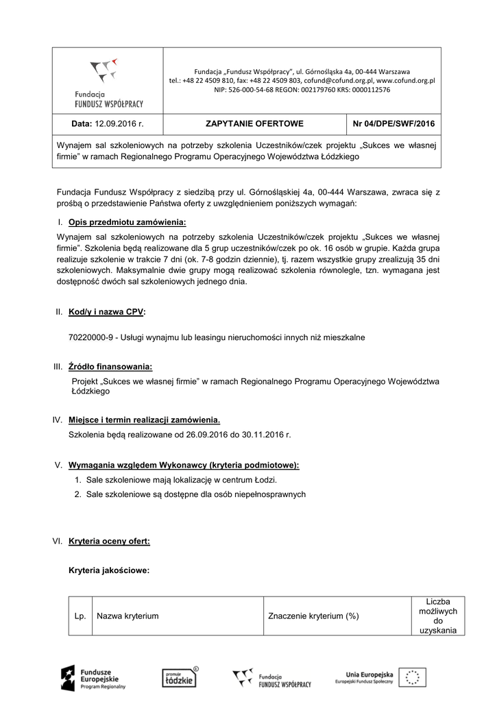 Fundacja „Fundusz Współpracy”, ul. Górnośląska 4a, 00-444 Warszawa tel.: +48 22 4509 810, fax: +48 22 4509 803, [email protected], www.cofund.org.pl NIP: 526-000-54-68 REGON: 002179760 KRS: 0000112576 Data: 12.09.2016 r. ZAPYTANIE OFERTOWE Nr 04/DPE/SWF/2016 Wynajem sal szkoleniowych na potrzeby szkolenia Uczestników/czek projektu „Sukces we własnej firmie” w ramach Regionalnego Programu Operacyjnego Województwa Łódzkiego Fundacja Fundusz Współpracy z siedzibą przy ul. Górnośląskiej 4a, 00-444 Warszawa, zwraca się z prośbą o przedstawienie Państwa oferty z uwzględnieniem poniższych wymagań: I. Opis przedmiotu zamówienia: Wynajem sal szkoleniowych na potrzeby szkolenia Uczestników/czek projektu „Sukces we własnej firmie”. Szkolenia będą realizowane dla 5 grup uczestników/czek po ok. 16 osób w grupie. Każda grupa realizuje szkolenie w trakcie 7 dni (ok. 7-8 godzin dziennie), tj. razem wszystkie grupy zrealizują 35 dni szkoleniowych. Maksymalnie dwie grupy mogą realizować szkolenia równolegle, tzn. wymagana jest dostępność dwóch sal szkoleniowych jednego dnia. II. Kod/y i nazwa CPV: 70220000-9 - Usługi wynajmu lub leasingu nieruchomości innych niż mieszkalne III. Źródło finansowania: Projekt „Sukces we własnej firmie” w ramach Regionalnego Programu Operacyjnego Województwa Łódzkiego IV. Miejsce i termin realizacji zamówienia. Szkolenia będą realizowane od 26.09.2016 do 30.11.2016 r. V. Wymagania względem Wykonawcy (kryteria podmiotowe): 1. Sale szkoleniowe mają lokalizację w centrum Łodzi. 2. Sale szkoleniowe są dostępne dla osób niepełnosprawnych VI. Kryteria oceny ofert: Kryteria jakościowe: Lp. Nazwa kryterium Znaczenie kryterium (%) Liczba możliwych do uzyskania punktów 1. Kryterium: odległość od biura projektu „Sukces we własnej firmie”, zlokalizowanego w centrum miasta, przy ul. Wólczańskiej 51 w Łodzi. Odległość liczona jest wg Google Map. 10 pkt - Wykonawca oferuje sale szkoleniowe w odległości do 1500 m drogi pieszej od biura projektu. 30 20 pkt. - Wykonawca oferuje sale szkoleniowe w odległości do 1000 m drogi pieszej od biura projektu. 30 pkt. - Wykonawca oferuje sale szkoleniowe w odległości do 500 m drogi pieszej od biura projektu. Kryterium - cena Punkty za kryterium „Cena” zostaną obliczone według wzoru: maksymalną liczbę punktów w tym kryterium otrzymuje oferta zawierająca najniższą cenę spośród wszystkich ważnych i nieodrzuconych ofert. Pozostałe oferty będą oceniane zgodnie z poniższym wzorem: Cena oferty najtańszej --------------------------------- x 70 = liczba punktów Cena oferty badanej Zamówienie zostanie udzielone na realizację usług dla Wykonawcy, który zdobył najwyższą liczbę punktów. Lp. 1. Nazwa kryterium Kryteria jakościowe Kryterium - cena Łącznie Znaczenie kryterium (%) 30 70 100% Liczba możliwych do uzyskania punktów 30 70 100 W toku badania i oceny ofert Zamawiający może żądać od oferentów wyjaśnień dotyczących treści złożonych ofert. Z możliwości realizacji zamówienia wykluczone są podmioty powiązane osobowo lub kapitałowo z Zamawiającym lub z osobami upoważnionymi do zaciągania zobowiązań w imieniu Zamawiającego lub z osobami wykonującymi w imieniu Zamawiającego czynności związane z przygotowaniem i przeprowadzeniem procedury wyboru Wykonawcy, w szczególności poprzez: Uczestnictwo w spółce jako wspólnik spółki cywilnej lub spółki osobowej, Posiadanie udziałów lub co najmniej 10% akcji, Pełnienie funkcji członka organu nadzorczego lub zarządzającego, prokurenta, pełnomocnika Pozostawanie w związku małżeńskim, w stosunku pokrewieństwa lub powinowactwa w linii prostej, bocznej drugiego stopnia lub w stosunku przysposobienia, opieki lub kurateli. VII. Sposób przygotowania oferty: Ofertę należy złożyć na formularzu ofertowym stanowiącym Załącznik nr 1 do niniejszego zapytania. Oferta powinna być wypełniona na komputerze i w języku polskim. Podane w ofercie ceny muszą uwzględniać wszystkie koszty związane z realizacją zamówienia i nie mogą ulec zmianie w trakcie trwania umowy. Cena powinna być wyrażona w kwocie brutto. Wykonawca zapewnia salę szkoleniową wyposażoną w ekran oraz rzutnik, flipchart oraz dostęp do internetu Wykonawcy zobowiązani są zapoznać się dokładnie z informacjami zawartymi w zapytaniu ofertowym i załącznikach i przygotować ofertę zgodnie z wymaganiami określonymi w tym dokumencie. Oferty przygotowane niezgodnie z wymaganiami niniejszego zapytania, złożone na innym druku, niekompletne lub po terminie nie będą podlegać ocenie. Wykonawcy ponoszą wszelkie koszty własne związane z przygotowaniem i złożeniem oferty, niezależnie od wyniku postępowania. VIII. Dokumenty wymagane od Wykonawcy: Ofertę wg wzoru – załącznik nr 1 IX. Osoba z FFW uprawniona do kontaktu: Pan Radosław Płużyński tel. 22 4509 831, adres e-mail: rpluzynski(at)cofund.org.pl X. Ofertę należy przekazać w terminie do: 16 września 2016 r. XI. Ofertę można: a. przesłać pocztą (w tym kurierem) na adres: Fundacja „Fundusz Współpracy”, ul. Górnośląska 4a, 00-444 Warszawa - decyduje data i godzina wpływu do Fundacji. b. przesłać e-mailem na adres: rpluzynski(at)cofund.org.pl – decyduje data wyświetlenia wiadomości na komputerze odbiorcy. c. XII. dostarczyć osobiście do Kancelarii FFW na adres: Fundacja Fundusz Współpracy, ul. Górnośląska 4a, 00-444 Warszawa - decyduje data i godzina wpływu do Fundacji. Inne postanowienia a. Zamawiający dokona wyboru oferty, w oparciu o kryteria oceny ofert. b. Niniejsze Zapytanie Ofertowe nie stanowi zobowiązania Fundacji Fundusz Współpracy do zawarcia umowy. c. Termin związania ofertą: 60 dni od zakończenia terminu składania ofert. d. Zamawiający zastrzega sobie prawo do unieważnienia prowadzonego zapytania bez podania przyczyny w każdym czasie, również po złożeniu i roz