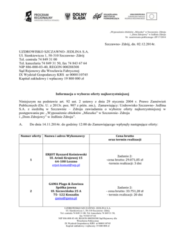 „Wyposażenie obiektów „Mieszko” w Szczawnie- Zdroju i „Dom Zdrojowy” w Jedlinie Zdroju Nr zamówienia publicznego: ZP/17/2014 Szczawno- Zdrój, dn. 02.12.2014r. UZDROWISKO SZCZAWNO- JEDLINA S.A. Ul. Sienkiewicza 1, 58-310 Szczawno- Zdrój Tel. centrala 74 849 31 00 Tel. kancelaria 74 849 31 50, fax 74 843 67 64 NIP 886-000-03-40, REGON 000288308 Sąd Rejonowy dla Wrocławia Fabrycznej IX Wydział Gospodarczy KRS nr 0000110745 Kapitał zakładowy i wpłacony 19 800 000 zł Informacja o wyborze oferty najkorzystniejszej Niniejszym na podstawie art. 92 ust. 2 ustawy z dnia 29 stycznia 2004 r. Prawo Zamówień Publicznych (Dz. U. z 2013r. poz. 907 z późn. zm.), Zamawiający: Uzdrowisko Szczawno- Jedlina S.A. z siedzibą w Szczawnie – Zdroju zawiadamia o wyborze oferty najkorzystniejszej w postępowaniu pn: „Wyposażenie obiektów „Mieszko” w Szczawnie- Zdroju i „Dom Zdrojowy” w Jedlinie Zdroju”. A. Do dnia 14.11.2014r. do godziny 12:00 do Zamawiającego wpłynęły następujące oferty: Numer oferty Nazwa i adres Wykonawcy Cena brutto oraz termin realizacji 1 ERJOT Ryszard Kośniewski Ul. Armii Krajowej 15 64-100 Leszno [email protected] Zadanie 2: -cena brutto: 29.071,05 zł -termin realizacji: 3 dni 2 GAMA Plago & Zawisza Spółka jawna Ul. Szczecińska 25 A 75- 122 Koszalin [email protected] Zadanie 2: - cena brutto: 33.751,20 zł - termin realizacji: 20 dni UZDROWISKO SZCZAWNO- JEDLINA S.A. Ul. Sienkiewicza 1, 58-310 Szczawno- Zdrój Tel. centrala 74 849 31 00, Tel. kancelaria 74 849 31 50, fax 74 843 67 64 NIP 886-000-03-40, REGON 000288308 Sąd Rejonowy dla Wrocławia Fabrycznej IX Wydział Gospodarczy KRS nr 0000110745 Kapitał zakładowy i wpłacony 19 800 000 zł 3 4 B. GASTRO-POL Sylwia Nowak Ul. Narciarska 4 67- 200 Głogów [email protected] Zadanie 2: - cena brutto: 29.436,00 zł - termin realizacji: 20 dni ADER MEBLE BIUROWE I HOTELOWE Piotr Pietryka Ul. Prześwit 18 54- 618 Wrocław [email protected] Zadanie 1: - cena brutto: 170.433,69 zł - termin realizacji: 20 dni Zadanie 3: - cena brutto: 27.550,70 zł - termin realizacji: 20 dni Zadanie 4: - cena brutto: 191.719,01 zł - termin realizacji: 20 dni Stosując następujący algorytm obliczenia punktacji: Cena najniższa Liczba punktów oferty ocenianej = --------------------------------- x 90 pkt + punktacja wg kryterium „termin realizacji” Cena oferty ocenianej Zamawiający przyznał następującą punktację: Numer oferty Nazwa i adres Wykonawcy 1 Przyznana punktacja wg kryterium: cena brutto oraz termin realizacji ERJOT Ryszard Kośniewski Ul. Armii Krajowej 15 64-100 Leszno [email protected] UZDROWISKO SZCZAWNO- JEDLINA S.A. Ul. Sienkiewicza 1, 58-310 Szczawno- Zdrój Tel. centrala 74 849 31 00, Tel. kancelaria 74 849 31 50, fax 74 843 67 64 NIP 886-000-03-40, REGON 000288308 Sąd Rejonowy dla Wrocławia Fabrycznej IX Wydział Gospodarczy KRS nr 0000110745 Kapitał zakładowy i wpłacony 19 800 000 zł Zadanie 2: 100 pkt 2 GAMA Plago & Zawisza Spółka jawna Ul. Szczecińska 25 A 75- 122 Koszalin [email protected] Zadanie 2: 87,52 pkt 3 GASTRO-POL Sylwia Nowak Ul. Narciarska 4 67- 200 Głogów [email protected] Zadanie 2: 98,88 pkt 4 ADER MEBLE BIUROWE I HOTELOWE Piotr Pietryka Ul. Prześwit 18 54- 618 Wrocław [email protected] Zadanie 1: 100 pkt Zadanie 3: 100 pkt Zadanie 4: 100 pkt w ramach kryteriów oceny ofert: C. Zamawiający dokonał wyboru oferty Wykonawcy: - dla zadania nr 1 -„Mieszko” - dostawa i montaż mebli do pokoi hotelowych, pomieszczeń ogólnodostępnych, jadalni i wyposażenia łazienek: ADER MEBLE BIUROWE I HOTELOWE Piotr Pietryka Ul. Prześwit 18 54- 618 Wrocław - dla zadania nr 2 - „Mieszko” – dostawa i montaż mebli i sprzętu do sekcji technologicznej bazy żywieniowej: ERJOT Ryszard Kośniewski Ul. Armii Krajowej 15 64-100 Leszno UZDROWISKO SZCZAWNO- JEDLINA S.A. Ul. Sienkiewicza 1, 58-310 Szczawno- Zdrój Tel. centrala 74 849 31 00, Tel. kancelaria 74 849 31 50, fax 74 843 67 64 NIP 886-000-03-40, REGON 000288308 Sąd Rejonowy dla Wrocławia Fabrycznej IX Wydział Gospodarczy KRS nr 0000110745 Kapitał zakładowy i wpłacony 19 800 000 zł - dla zadania nr 3 - „Mieszko” – dostawa i montaż mebli i sprzętów do gabinetów medycznych i zabiegowych: ADER MEBLE BIUROWE I HOTELOWE Piotr Pietryka Ul. Prześwit 18 54- 618 Wrocław - dla zadania nr 4 - „Dom Zdrojowy” w Jedlinie – Zdroju – dostawa i montaż mebli do pokoi hotelowych oraz wyposażenia łazienek: ADER MEBLE BIUROWE I HOTELOWE Piotr Pietryka Ul. Prześwit 18 54- 618 Wrocław W postępowaniu przetargowym uczestniczyło 4 Wykonawców. Wybrane oferty częściowe zostały sporządzone prawidłowo, treść dokumentów oraz ich daty odpowiadają wymogom określonym w specyfikacji istotnych warunków zamówienia. Oferty częściowe w myśl przyjętego kryterium oceny ofert otrzymały 100 pkt i tym samym Zamawiający wybrał wyżej wymienionych Wykonawców do realizacji zamówienia. D. Zamawiający nie odrzucił żadnej oferty z postępowania. E. Zamawiający nie wykluczył z postępowania żadnego Wykonawcy. F. Zamawiający informuje, że zgodnie z art. 94 ust. 2 pkt 1 lit „a” oraz art. 94 ust. 2 pkt 3 lit „a” Ustawy Prawo Zamówień Publicznych umowa w sprawie niniejszego zamówienia może zostać zawarta z pominięciem terminów o których mowa w art. 94 ust. 1 pkt. 1 tej Ustawy. O planowanym terminie zawarcia umowy wybrany wykonawca zostanie poinformowany odrębnym pismem. G. Zamawiający jednocześnie informuje, iż wobec czynności podjętych przez Zamawiającego w toku postępowania można wnieść środki ochrony prawnej przewidziane w Dziale VI Ustawy z dnia 29 stycznia 2004r. Prawo Zamówień Publicznych (Dz. U. z 2013r. poz. 907). Zatwierdzam: ……………………………………….. Kierownik Zamawiającego UZDROWISKO SZCZAWNO- JEDLINA S.A. Ul. Sienkiewicza 1, 58-310 Szczawno- Zdrój Tel. centrala 74 849 31 00, Tel. kancelaria 74 849 31 50, fax 74 843 67 64 NIP 88