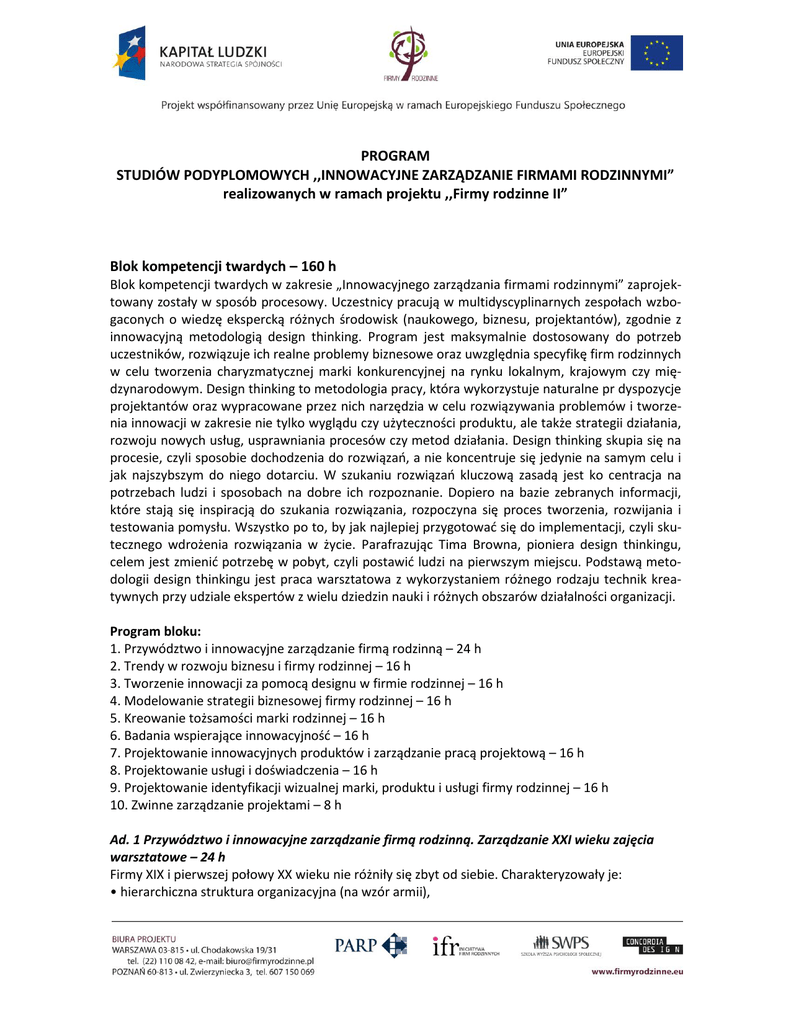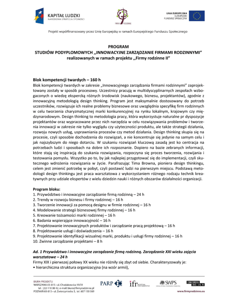 PROGRAM STUDIÓW PODYPLOMOWYCH ,,INNOWACYJNE ZARZĄDZANIE FIRMAMI RODZINNYMI” realizowanych w ramach projektu ,,Firmy rodzinne II” Blok kompetencji twardych – 160 h Blok kompetencji twardych w zakresie „Innowacyjnego zarządzania firmami rodzinnymi” zaprojektowany zostały w sposób procesowy. Uczestnicy pracują w multidyscyplinarnych zespołach wzbogaconych o wiedzę ekspercką różnych środowisk (naukowego, biznesu, projektantów), zgodnie z innowacyjną metodologią design thinking. Program jest maksymalnie dostosowany do potrzeb uczestników, rozwiązuje ich realne problemy biznesowe oraz uwzględnia specyfikę firm rodzinnych w celu tworzenia charyzmatycznej marki konkurencyjnej na rynku lokalnym, krajowym czy międzynarodowym. Design thinking to metodologia pracy, która wykorzystuje naturalne pr dyspozycje projektantów oraz wypracowane przez nich narzędzia w celu rozwiązywania problemów i tworzenia innowacji w zakresie nie tylko wyglądu czy użyteczności produktu, ale także strategii działania, rozwoju nowych usług, usprawniania procesów czy metod działania. Design thinking skupia się na procesie, czyli sposobie dochodzenia do rozwiązań, a nie koncentruje się jedynie na samym celu i jak najszybszym do niego dotarciu. W szukaniu rozwiązań kluczową zasadą jest ko centracja na potrzebach ludzi i sposobach na dobre ich rozpoznanie. Dopiero na bazie zebranych informacji, które stają się inspiracją do szukania rozwiązania, rozpoczyna się proces tworzenia, rozwijania i testowania pomysłu. Wszystko po to, by jak najlepiej przygotować się do implementacji, czyli skutecznego wdrożenia rozwiązania w życie. Parafrazując Tima Browna, pioniera design thinkingu, celem jest zmienić potrzebę w pobyt, czyli postawić ludzi na pierwszym miejscu. Podstawą metodologii design thinkingu jest praca warsztatowa z wykorzystaniem różnego rodzaju technik kreatywnych przy udziale ekspertów z wielu dziedzin nauki i różnych obszarów działalności organizacji. Program bloku: 1. Przywództwo i innowacyjne zarządzanie firmą rodzinną – 24 h 2. Trendy w rozwoju biznesu i firmy rodzinnej – 16 h 3. Tworzenie innowacji za pomocą designu w firmie rodzinnej – 16 h 4. Modelowanie strategii biznesowej firmy rodzinnej – 16 h 5. Kreowanie tożsamości marki rodzinnej – 16 h 6. Badania wspierające innowacyjność – 16 h 7. Projektowanie innowacyjnych produktów i zarządzanie pracą projektową – 16 h 8. Projektowanie usługi i doświadczenia – 16 h 9. Projektowanie identyfikacji wizualnej marki, produktu i usługi firmy rodzinnej – 16 h 10. Zwinne zarządzanie projektami – 8 h Ad. 1 Przywództwo i innowacyjne zarządzanie firmą rodzinną. Zarządzanie XXI wieku zajęcia warsztatowe – 24 h Firmy XIX i pierwszej połowy XX wieku nie różniły się zbyt od siebie. Charakteryzowały je: • hierarchiczna struktura organizacyjna (na wzór armii), Strona Ad. 2 Trendy w rozwoju biznesu i firmy rodzinnej zajęcia warsztatowe – 16 h Trendwatching to skomplikowany proces stałej obserwacji większości gałęzi przemysłu i światowego rynku. Umiejętność obserwacji i analizy wniosków to zawód, który wymaga wieloletniego doświadczenia, dużej wiedzy oraz ciągłego monitoringu. Większość firm i projektantów myli trendy masowej sprzedaży (to, co obecnie jest w sklepie i to, co konsument uważa za trend) z trendami, które są potrzebne, aby zbudować strategię marki i produktu. Podczas dwóch bardzo intensywnych dni uczestnicy zajęć będą ćwiczyć umiejętności obserwacji, analizy oraz wdrażania trendów na trzech poziomach operacyjnych: na poziomie Mega Trendów (poszukiwanie możliwości), na poziomie Trendów Strategicznych (wpływ możliwości na przyszłość firmy, jej wartości, biznesu i przyszłego produktu, a także pozycjonowanie firmy w krajobrazie niedalekiej przyszłości) oraz na poziomie Trendów Implementacji (jakich najważniejszych zmian należy dokonać dzisiaj, aby firma osiągnęła swoje cele strategiczne). Duży nacisk będzie położony na wartość trendu dla MSP oraz firm rodzinnych. Słuchacze zapoznają się z językiem i nomenklaturą trendów i dizajnu. Zajęcia warsztatowe z anatomii trendu rozwiną umiejętności analizowania trendów branżowych, poszukiwania idei nowych produktów i formułowania wytycznych projektowych. Treści programowe: Teoria. Poziomy trendów: • Mega Trends – definicja i umiejętność obserwacji • Consumer Trends – definicja, obserwacja • Warsztaty (analiza, mapping, wartość słowa) • Design Trends – definicja, obserwacja, warsztaty (analiza, klastry oraz wdrożenie, możliwość pracy w terenie) Marka Tłumaczenie Mega Trends i Consumer Trends na potrzeby: • marki, firmy • scenariusza rozwoju (teoria + warsztaty) 2 • droga do jakości przez eliminację produktów wadliwych, • motywowanie korzyściami materialnymi, • komunikacja przy pomocy kanałów komunikacyjnych. Druga połowa XX wieku przyniosła fundamentalne zmiany tego modelu, które będą dominować w wieku XXI: • procesowa (niehierarchiczna) struktura organizacyjna, • droga do jakości przez eliminowanie źródeł powstawania wad, • motywowanie godnościowe, • platformy komunikacyjne uzupełniające kanały. Celem zajęć jest przedstawienie słuchaczom nowych paradygmatów zarządzania, które nierzadko stoją w sprzeczności z paradygmatami obowiązującymi dziś w wielu firmach i organizacjach. Treści programowe: • Wprowadzenie do TQM – podstawowe idee i narzędzia, • Zarządzanie godnościowe – budowanie zespołu w oparciu o zasadę partnerstwa i przez odwoływanie się do godnościowych potrzeb człowieka. Samodyscyplina w miejsce kontroli, kar i nagród, • Zarządzanie procesowe i zarządzanie wiedzą, • Dwie idee paradygmatu „Firma 2.0“ – rynki prognostyczne i platformy komunikacji Strona Ad. 3 Tworzenie innowacji za pomocą designu w firmie rodzinnej zaj