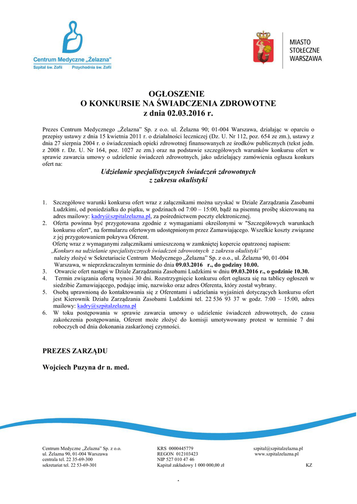 OGŁOSZENIE O KONKURSIE NA ŚWIADCZENIA ZDROWOTNE z dnia 02.03.2016 r. Prezes Centrum Medycznego „Żelazna” Sp. z o.o. ul. Żelazna 90; 01-004 Warszawa, działając w oparciu o przepisy ustawy z dnia 15 kwietnia 2011 r. o działalności leczniczej (Dz. U. Nr 112, poz. 654 ze zm.), ustawy z dnia 27 sierpnia 2004 r. o świadczeniach opieki zdrowotnej finansowanych ze środków publicznych (tekst jedn. z 2008 r. Dz. U. Nr 164, poz. 1027 ze zm.) oraz na podstawie szczegółowych warunków konkursu ofert w sprawie zawarcia umowy o udzielenie świadczeń zdrowotnych, jako udzielający zamówienia ogłasza konkurs ofert na: Udzielanie specjalistycznych świadczeń zdrowotnych z zakresu okulistyki 1. 2. 3. 4. 5. 6. Szczegółowe warunki konkursu ofert wraz z załącznikami można uzyskać w Dziale Zarządzania Zasobami Ludzkimi, od poniedziałku do piątku, w godzinach od 7:00 – 15:00, bądź na pisemną prośbę skierowaną na adres mailowy: [email protected], za pośrednictwem poczty elektronicznej. Oferta powinna być przygotowana zgodnie z wymaganiami określonymi w "Szczegółowych warunkach konkursu ofert", na formularzu ofertowym udostępnionym przez Zamawiającego. Wszelkie koszty związane z jej przygotowaniem pokrywa Oferent. Ofertę wraz z wymaganymi załącznikami umieszczoną w zamkniętej kopercie opatrzonej napisem: „Konkurs na udzielanie specjalistycznych świadczeń zdrowotnych z zakresu okulistyki” należy złożyć w Sekretariacie Centrum Medycznego „Żelazna” Sp. z o.o., ul. Żelazna 90, 01-004 Warszawa, w nieprzekraczalnym terminie do dnia 09.03.2016 r., do godziny 10.00. Otwarcie ofert nastąpi w Dziale Zarządzania Zasobami Ludzkimi w dniu 09.03.2016 r., o godzinie 10.30. Termin związania ofertą wynosi 30 dni. Rozstrzygnięcie konkursu ofert ogłasza się na tablicy ogłoszeń w siedzibie Zamawiającego, podając imię, nazwisko oraz adres Oferenta, który został wybrany. Osobą uprawnioną do kontaktowania się z Oferentami i udzielania wyjaśnień dotyczących konkursu ofert jest Kierownik Działu Zarządzania Zasobami Ludzkimi tel. 22 536 93 37 w godz. 7:00 – 15:00, adres mailowy: [email protected] W toku postępowania w sprawie zawarcia umowy o udzielenie świadczeń zdrowotnych, do czasu zakończenia postępowania, Oferent może złożyć do komisji umotywowany protest w terminie 7 dni roboczych od dnia dokonania zaskarżonej czynności. PREZES ZARZĄDU Wojciech Puzyna dr n. med. Centrum Medyczne „Żelazna” Sp. z o.o. ul. Żelazna 90, 01-004 Warszawa centrala tel. 22 35-69-300 sekretariat tel. 22 53-69-301 KRS 0000445779 REGON 012103423 NIP 527 010 47 46 Kapitał zakładowy 1 000 000,00 zł 1 [email protected] www.szpitalzelazna.pl KZ