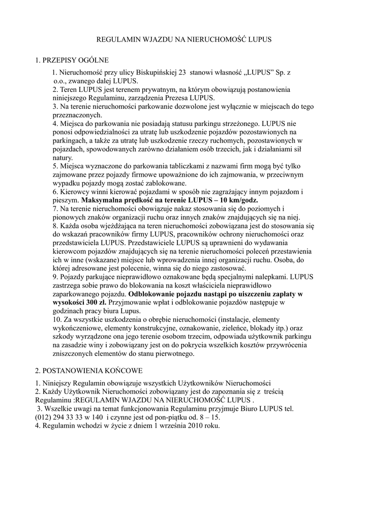 REGULAMIN WJAZDU NA NIERUCHOMOŚĆ LUPUS 1. PRZEPISY OGÓLNE 1. Nieruchomość przy ulicy Biskupińskiej 23 stanowi własność „LUPUS” Sp. z o.o., zwanego dalej LUPUS. 2. Teren LUPUS jest terenem prywatnym, na którym obowiązują postanowienia niniejszego Regulaminu, zarządzenia Prezesa LUPUS. 3. Na terenie nieruchomości parkowanie dozwolone jest wyłącznie w miejscach do tego przeznaczonych. 4. Miejsca do parkowania nie posiadają statusu parkingu strzeżonego. LUPUS nie ponosi odpowiedzialności za utratę lub uszkodzenie pojazdów pozostawionych na parkingach, a także za utratę lub uszkodzenie rzeczy ruchomych, pozostawionych w pojazdach, spowodowanych zarówno działaniem osób trzecich, jak i działaniami sił natury. 5. Miejsca wyznaczone do parkowania tabliczkami z nazwami firm mogą być tylko zajmowane przez pojazdy firmowe upoważnione do ich zajmowania, w przeciwnym wypadku pojazdy mogą zostać zablokowane. 6. Kierowcy winni kierować pojazdami w sposób nie zagrażający innym pojazdom i pieszym. Maksymalna prędkość na terenie LUPUS – 10 km/godz. 7. Na terenie nieruchomości obowiązuje nakaz stosowania się do poziomych i pionowych znaków organizacji ruchu oraz innych znaków znajdujących się na niej. 8. Każda osoba wjeżdżająca na teren nieruchomości zobowiązana jest do stosowania się do wskazań pracowników firmy LUPUS, pracowników ochrony nieruchomości oraz przedstawiciela LUPUS. Przedstawiciele LUPUS są uprawnieni do wydawania kierowcom pojazdów znajdujących się na terenie nieruchomości poleceń przestawienia ich w inne (wskazane) miejsce lub wprowadzenia innej organizacji ruchu. Osoba, do której adresowane jest polecenie, winna się do niego zastosować. 9. Pojazdy parkujące nieprawidłowo oznakowane będą specjalnymi nalepkami. LUPUS zastrzega sobie prawo do blokowania na koszt właściciela nieprawidłowo zaparkowanego pojazdu. Odblokowanie pojazdu nastąpi po uiszczeniu zapłaty w wysokości 300 zł. Przyjmowanie wpłat i odblokowanie pojazdów następuje w godzinach pracy biura Lupus. 10. Za wszystkie uszkodzenia o obrębie nieruchomości (instalacje, elementy wykończeniowe, elementy konstrukcyjne, oznakowanie, zieleńce, blokady itp.) oraz szkody wyrządzone ona jego terenie osobom trzecim, odpowiada użytkownik parkingu na zasadzie winy i zobowiązany jest on do pokrycia wszelkich kosztów przywrócenia zniszczonych elementów do stanu pierwotnego. 2. POSTANOWIENIA KOŃCOWE 1. Niniejszy Regulamin obowiązuje wszystkich Użytkowników Nieruchomości 2. Każdy Użytkownik Nieruchomości zobowiązany jest do zapoznania się z treścią Regulaminu :REGULAMIN WJAZDU NA NIERUCHOMOŚĆ LUPUS . 3. Wszelkie uwagi na temat funkcjonowania Regulaminu przyjmuje Biuro LUPUS tel. (012) 294 33 33 w 140 i czynne jest od pon-piątku od. 8 – 15. 4. Regulamin wchodzi w życie z dniem 1 września 2010 roku.