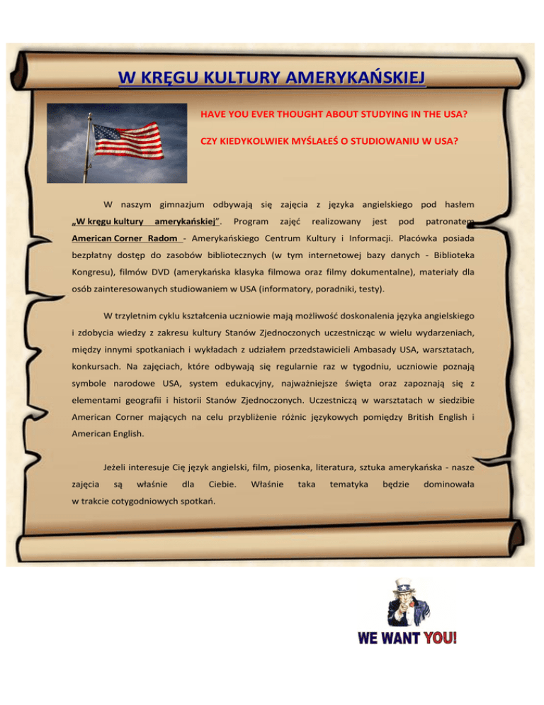 W KRĘGU KULTURY AMERYKAŃSKIEJ HAVE YOU EVER THOUGHT ABOUT STUDYING IN THE USA? CZY KIEDYKOLWIEK MYŚLAŁEŚ O STUDIOWANIU W USA? W naszym gimnazjum odbywają się zajęcia z języka angielskiego pod hasłem „W kręgu kultury amerykańskiej”. Program zajęć realizowany jest pod patronatem American Corner Radom - Amerykańskiego Centrum Kultury i Informacji. Placówka posiada bezpłatny dostęp do zasobów bibliotecznych (w tym internetowej bazy danych - Biblioteka Kongresu), filmów DVD (amerykańska klasyka filmowa oraz filmy dokumentalne), materiały dla osób zainteresowanych studiowaniem w USA (informatory, poradniki, testy). W trzyletnim cyklu kształcenia uczniowie mają możliwość doskonalenia języka angielskiego i zdobycia wiedzy z zakresu kultury Stanów Zjednoczonych uczestnicząc w wielu wydarzeniach, między innymi spotkaniach i wykładach z udziałem przedstawicieli Ambasady USA, warsztatach, konkursach. Na zajęciach, które odbywają się regularnie raz w tygodniu, uczniowie poznają symbole narodowe USA, system edukacyjny, najważniejsze święta oraz zapoznają się z elementami geografii i historii Stanów Zjednoczonych. Uczestniczą w warsztatach w siedzibie American Corner mających na celu przybliżenie różnic językowych pomiędzy British English i American English. Jeżeli interesuje Cię język angielski, film, piosenka, literatura, sztuka amerykańska - nasze zajęcia są właśnie dla Ciebie. w trakcie cotygodniowych spotkań. Właśnie taka tematyka będzie dominowała