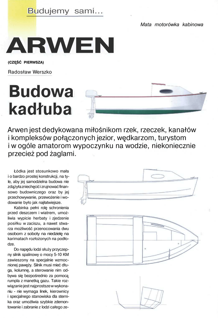 Budujemy sami... Mata motorówka kabinowa ARWEN (CZĘŚĆ PIERWSZA) Radosław Werszko Budowa kadłuba Arwen jest dedykowana miłośnikom rzek, rzeczek, kanałów i kompleksów połączonych jezior, wędkarzom, turystom i w ogóle amatorom wypoczynku na wodzie, niekoniecznie przecież pod żaglami. Łódka jest stosunkowo mała i o bardzo prostej konstrukcji, na tyle, aby jej samodzielna budowa nie zdążyła zniechęcić i zrujnować finansowo budowniczego oraz by jej przechowywanie, przewożenie i wodowanie było jak najłatwiejsze. Kabinka pełni rolę schronienia przed deszczem i wiatrem, umożliwia wypicie herbaty i zjedzenie posiłku w zaciszu, a nawet stwarza możliwość przenocowania dwu osobom z soboty na niedzielę na karimatach rozłożonych na podłodze. Do napędu lodzi służy przyczepny silnik spalinowy o mocy 5-10 KM zawieszony na specjalnie wzmocnionej pawęży. Silnik musi mieć długa, kolumnę, a sterowanie nim odbywa się bezpośrednio za pomocą rumpla z manetką gazu. Takie rozwiązanie jest najprostsze w wykonaniu - nie wymaga linek, kierownicy i specjalnego stanowiska dla sternika oraz umożliwia szybkie zdemontowanie i zabranie z lodzi całego ze- społu napędowego. Do łodzi można użyć także wioseł szalupowych opartych w dulkach. Arwen zaprojektowana jest do budowy ze sklejki znana, metodę szycia i klejenia, polegającą na wstępnym zszyciu przygotowanych wcześniej, płaskich elementów cienkim miedzianym drutem, a następnie na obustronnym zaklejeniu powstałych złączeń pasem maty szklanej przesączonym żywicą epoksydową lub poliestrową. Plywalność awaryjna, potrzebna w przypadku przewrócenia lub przedziurawienia lodzi, została zapewniona dzięki drewnianym materiałom użytym do budowy oraz płytom tworzywa piankowego umieszczonym pod ławkami. Łączna nadwyżka plywalności zalanego kadłuba wynosi co najmniej 85 kg, co z powodzeniem umożliwia uniesienie silnika i wyposażenia ruchomego. OPIS BUDOWY 1. Przygotowania. Budowę lodzi rozpoczynamy od zgromadzenia materiałów, skompletowania narzędzi i przygotowania pomieszczenia odpowiedniej wielkości. Pomieszczenie do budowy powinno być przynajmniej 1 m szersze i 1 m dłuższe od budowanej lodzi. Należy pamiętać także o konieczności wyniesienia gotowej łodzi z pomieszczenia. Do budowy nie będzie potrzebna ława montażowa, ale ze wzgle ZESTAWIENIE PODSTAWOWYCH MATERIAŁÓW (uwzględniono przeciętną ilość odpadów) 1. Sklejka liściasta wodoodporna grubości 6 mm - 23-25 m2 (np. 9 ark. 2,13x1,25 m) 2. Sklejka liściasta wodoodporna grubości 8 mm na podłogi 3. Listwy sosnowe 30x18 mm - 44 m, 45x18 mm 20 m 4. Listwy dębowe lub sosnowe 30x18 mm - 11 m 5. Deski dębowe lub sosnowe na wzmocnienie pawęży pod silnik 1800x100x25 mm, 1000x100x25 mm 6. Listwy świerkowe lub sosnowe na wiosła, 45x45 mm - 2.5 m, 2 szt., 0,8 m, 4 szt. 7. Żywica epoksydowa lub poliestrowa do laminowania - 10 kg 8. Mata szklana do laminowania o gramaturze 450 g/m7 - 9 m7 9. Klej wodoodporny do drewna 10. Gwoździe mosiężne (1.5 x 20 mm) 11. Wkręty mosiężne (4.5 x 30 mm do drewna) oraz śruby, nakrętki i podkładki szerokie ze siali kwasoodpornej lub ocynkowane ze zwykłej stali do mocowania okuć 12. Lakier i farba, poliuretanowe lub ftalowe do pomalowania 37 m2 13. Polimetakrylan metylu lub poliwęglan na okienka i sztorcklapę, barwiony grubości 6 mm du na wygodę (schylanie się) łódź warto budować na dwóch kozłach wysokości około 0,5 m. 2. Łączenie pasów sklejki. Łódź może być budowana ze sklejki wodoodpornej liściastej grubości 6 mm w arkuszach o dowolnych wymiarach. Arkusze należy porozcinać i połączyć w taki sposób, aby powstały pasy sklejki o długości i szerokości odpowiedniej do wycięcia z nich poszczególnych elementów łodzi, pokazanych na rysunkach traserskich. Należy przy tym zadbać, aby słoje na zewnętrznych obłogach sklejki biegły zawsze wzdłuż łodzi a także, aby poprzeczne łączenia sklejki na sąsiednich elementach (np. na burcie i obie, na oble i dnie. itp.) były przesunięte i nie wypadały naprzeciw siebie. Połączenia sklejki najlepiej wykonać metodą zukosowania brzegów na szerokości równej dziesięciu grubościom sklejki i sklejenia zukosowanych części. Struganie obydwu brzegów, które będą potem sklejone, wykonujemy jednocześnie przy pomocy przenośnej strugarki elektrycznej lub bardzo ostrego struga prowadzonego ukośnie do krawędzi. Podczas klejenia zukosowane brzegi ściskamy między dwoma gru- bymi deskami zbitymi razem poprzez sklejkę. Otworami w sklejce, pozostałymi po wyciągnięciu gwoździ, nie należy się martwić - łatwo będzie je zaszpachlować przy wykańczaniu łodzi, a taka metoda gwarantuje naprawdę duży i równomierny docisk sklejanych powierzchni. Należy także pamiętać o podłożeniu pasów folii polietylenowej by uniknąć niepożądanego sklejenia klejem wyciśniętym ze spoiny. Do klejenia wszystkich elementów łodzi używamy kleju wodoodpornego sprawdzonej jakości. W przypadku wątpliwości najlepiej wykonać próbę klejenia na ścinkach drewna i sklejki. Próbka taka powinna wytrzymać gotowanie w wodzie przez 6 godzin i stygnięcie w niej przez dalsze 18 godzin. 3. Trasowanie elementów wy cinanych ze sklejki. Trasowanie rozpoczynamy od naniesienia punktów tworzących zarys poszczególnych elementów według wymiarów podanych na rysunkach traserskich. Linie krzywe wykreślamy przy pomocy cienkiej, równej listwy o przekroju około 10 x 20 mm i odpowiedniej długości. Listwę opieramy o gwoździe wbite w naniesione punkty. Elementy występujące podwójnie (burty, obła, połówki pokładu) trasujemy tylko raz. 4. Wycinanie elementów ze sklejki. Pasy, z których będą wycięte takie same elementy, składamy razem i zbijamy w kilku miejscach w obrębie zarysu wycinanych części. Wycinanie najlepiej wykonać wyrzynarką elektryczną lub ręcznie - otwornicą. Rys . Radosław W
