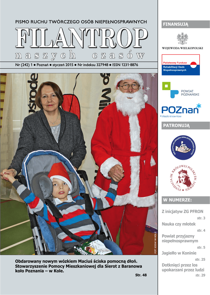 PISMO RUCHU TWÓRCZEGO OSÓB NIEPEŁNOSPRAWNYCH FINANSUJĄ Nr (242) 1 Poznań styczeń 2015 Nr indeksu 327948 ISSN 1231-8876 PATRONUJĄ W NUMERZE: Z inicjatyw ZG PFRON str. 3 FOT. SOSW W KOLE Nauka czy młotek Obdarowany nowym wózkiem Maciuś ściska pomocną dłoń. Stowarzyszenie Pomocy Mieszkaniowej dla Sierot z Baranowa koło Poznania – w Kole. Str. 48 str. 4 Powiat przyjazny niepełnosprawnym str. 5 Jagiełło w Koninie str. 25 Dotknięci przez los upokarzani przez ludzi str. 29 2 STRONA D ziennikarze wielkopolskich mediów na zaproszenie Poseł do Parlamentu Europejskiego Krystyny Łybackiej 19 grudnia wzięli udział w spotkaniu świątecznym. Było ono okazją do ciekawych rozmów. Posłanka opowiadała o swojej pracy w Europarlamencie. STYCZEŃ 2015 Spotkanie z mediami W 2014 roku Poseł Krystyna Łybacka sprawowała patronat honorowy nad konkursem FOT. KAROLINA KASPRZAK Spotkanie odbyło się w Biurze Poselskim przy ulicy Piekary 17 w Poznaniu. Na działalność dr Krystyny Łybackiej w Parlamencie Europejskim składają się m.in. prace w tzw. integrupach. Dwie z intergrup koncentrują swoje działania wokół wolontariatu europejskiego i spraw związanych ze zwalczaniem ubóstwa. Krystyna Łybacka w rozmowie z dziennikarzami. poetyckim dla osób niepełnosprawnych z regionu konińskiego „Miłość wiosną – niepełnosprawni przełamują bariery i stereotypy” oraz przedsięwzięciami o charakterze kulturalnym i sportowo-rekreacyjnym. Współpracowała organizacyjnie w wydarzeniu pod nazwą „Europejski Mikołaj”, organizowanym przez Szkolny Klub Europejski Specjalnego Ośrodka Szkolno-Wychowawczego w Rydzynie. Była m.in. prelegentką III Wielkopolskiego Kongresu Kobiet, o którym pisaliśmy w grudniowym wydaniu „Filantropa Naszych” na stronie 12 i 13. KAROLINA KASPRZAK XII OGÓLNOPOLSKI KONKURS PLASTYCZNY PFRON Sztuka osób niepełnosprawnych D o uczestników uroczystości podsumowania XI edycji konkursu PFRON „Otwarte drzwi”, o którym pisaliśmy w grudniowym wydaniu „Filantropa”, trafił katalog z pracami nagrodzonymi w XII edycji innego konkursu PFRON „Sztuka osób niepełnosprawnych – piękno natury” i prezentowanymi na wystawie pokonkursowej. Celem tego konkursu było m.in. promowanie wartości edukacyjnych codziennego życia osób niepełnosprawnych, mobilizowanie osób niepełnosprawnych do prezentacji dorobku twórczego, integracja społeczna i przełamywanie barier, promocja osiągnięć artystycznych osób niepełnosprawnych, przezwyciężanie stereotypów, upowszechnianie wiedzy o możliwościach osób niepełnosprawnych. Każdego roku w ośrodkach terapeutycznych – warsztatach terapii zajęciowej, środowiskowych domach samopomocy czy innych tego typu placówkach powstaje wiele wartościowych prac plastycznych. Dzięki konkursowi PFRON ich autorzy mogą zaprezentować swój dorobek publiczności. Twórczość osób niepełnosprawnych wychodzi na światło dzienne i pozwala społeczeństwu przekonywać się, że ograniczenia nie stanowią przeszkody w rozwija- niu oraz popularyzacji talentów twórczych. – Po raz pierwszy w historii konkursu „Sztuka osób niepełnosprawnych” zwróciliśmy się do adresatów naszego przedsięwzięcia z prośbą o zgłaszanie propozycji tematu przewodniego XII edycji konkursu. Odzew był ogromny, propozycje znakomite, a wybór niezwykle trudny. Ostatecznie zwyciężył temat „Piękno natury” zgłoszony przez Warsztat Terapii Zajęciowej przy Miejskim Ośrodku Pomocy Społecznej w Augustowie oraz Warsztat Terapii Zajęciowej przy Towarzystwie Wsparcia Rozwoju Powiatu „Wszechnica Konecka” w Końskich – pisze we wspomnianym katalogu Teresa Hernik, prezes Zarządu Głównego PFRON, przewodnicząca komisji konkursowej. W kategorii „Malarstwo i witraż” I nagrodę zdobył Michał Kruszniewski z WTZ przy Centrum Pomocowym „Caritas” im. św. Ojca Pio w Gdyni za pracę „W dżungli”. W kategorii „Rysunek i grafika” I nagrodę otrzymała Agnieszka Artwik z WTZ przy Stowarzyszeniu Na Rzecz Pomocy Osobom Niepełnosprawnym „Tratwa” w Sandomierzu za pracę „Zebry”. W kategorii „Rzeźba kameralna i płaskorzeźba” I nagrodę zdobył Zbigniew Golon z WTZ Polskiego Stowarzyszenia Na Rzecz Osób z Upośledzeniem Umysłowym – Koło w Biskupcu za pracę „Kot”. W kategorii „Tkanina i aplikacja” I nagrodę otrzymała Dorota Wałach z WTZ PSOUU – Koło w Rymanowie za pracę „Sianokosy”. W każdej z kategorii przyznano także II i III nagrody oraz wyróżnienia. Miło nam poinformować, że wśród nagrodzonych znalazły się również osoby z Poznania, powiatu poznańskiego i województwa wielkopolskiego. Janusz Pietrzak z WTZ Stowarzyszenia Przyjaciół Niewidomych i Słabowidzących w Poznaniu zdobył wyróżnienie w kategorii „Malarstwo i witraż” za pracę „Podhalańskie ukojenie”. W tej samej kategorii wyróżnienie przyznano Rafałowi Kwiatkowskiemu z WTZ we Wrześni za pracę „Wypas”. Wyróżnienie w kategorii „Tkanina i aplikacja” za pracę „Morski świat” zdobyła Ewa Jankowska z WTZ Wiel- kopolskiego Związku Inwalidów Narządu Ruchu – Koło w Owińskach. W kategorii „Rysunek i grafika” za pracę „Śmieszny jeż, ptak i pawie piórka” wyróżnienie otrzymała Urszula Galińska z WTZ Stowarzyszenia Osób Niepełnosprawnych i Ich Rodzin „Roktar” w Baranowie. Pracę zbiorową „Każdy widzi swoje” uczestników Środowiskowego Domu Samopomocy Kórnickiego Stowarzyszenia Pomocy Osobom z Niepełnosprawnością Intelektualną i Ruchową „Klaudynka” eksponowano na wystawie pokonkursowej. Możemy podziwiać te niezwykłe dzieła w katalogu „Piękno natury”. Ich autorzy nie ulegają stereotypom ani współczesnym trendom w sztuce. Ukazują odbiorcom rzeczywistość widzianą własnymi oczami. Nie byłoby nagrodzonych dzieł, gdyby nie wsparcie terapeutów zajęciowych, opiekunów, asystentów i rodziców osób niepełnosp