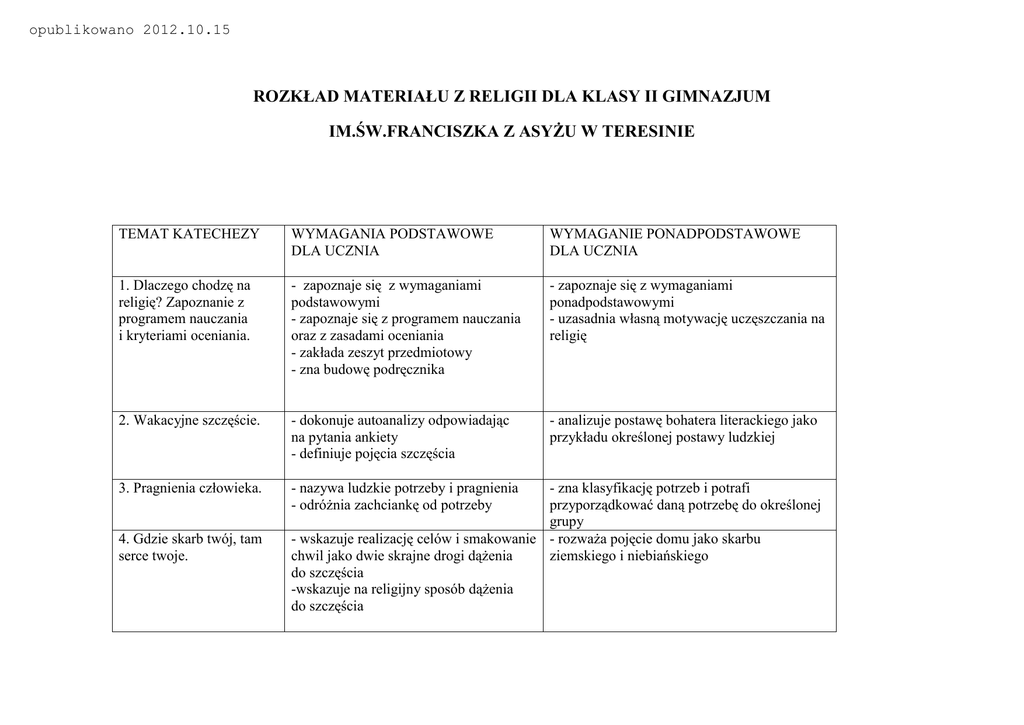 opublikowano 2012.10.15 ROZKŁAD MATERIAŁU Z RELIGII DLA KLASY II GIMNAZJUM IM.ŚW.FRANCISZKA Z ASYŻU W TERESINIE TEMAT KATECHEZY WYMAGANIA PODSTAWOWE DLA UCZNIA WYMAGANIE PONADPODSTAWOWE DLA UCZNIA 1. Dlaczego chodzę na religię? Zapoznanie z programem nauczania i kryteriami oceniania. - zapoznaje się z wymaganiami podstawowymi - zapoznaje się z programem nauczania oraz z zasadami oceniania - zakłada zeszyt przedmiotowy - zna budowę podręcznika - zapoznaje się z wymaganiami ponadpodstawowymi - uzasadnia własną motywację uczęszczania na religię 2. Wakacyjne szczęście. - dokonuje autoanalizy odpowiadając na pytania ankiety - definiuje pojęcia szczęścia - analizuje postawę bohatera literackiego jako przykładu określonej postawy ludzkiej 3. Pragnienia człowieka. - nazywa ludzkie potrzeby i pragnienia - odróżnia zachciankę od potrzeby 4. Gdzie skarb twój, tam serce twoje. - zna klasyfikację potrzeb i potrafi przyporządkować daną potrzebę do określonej grupy - wskazuje realizację celów i smakowanie - rozważa pojęcie domu jako skarbu chwil jako dwie skrajne drogi dążenia ziemskiego i niebiańskiego do szczęścia -wskazuje na religijny sposób dążenia do szczęścia 5. Niespokojne jest serce człowieka… - zna pochodzenie cytatu będącego tematem katechezy -umie ten cytat dokończyć i skomentować - wyjaśnia określenia słodkie jarzmo i lekkie brzemię 6. Samowola człowieka. - rozumie pojęcia:„ prehistoria biblijna” „grzech pierworodny”, - interpretuje biblijną opowieść o grzechu pierworodnym -interpretuje symbole zawarte w opowieści o wygnaniu z raju -wyjaśnia, dlaczego Bóg nie udaremnił decyzji pierwszych ludzi, - wskazuje biblijny cytat będący zapowiedzią zwycięstwa dobra nad złem i opieki Boga nad ludźmi mimo ich grzechu 7. Zazdrość, która zabija. -interpretuje cytat biblijny (człowiek ma władzę panować nad grzechem) - rozumie zazdrość jako grzech przeciw bliźniemu -tłumaczy zależność między wolnością a poszanowaniem wolności drugiego człowieka. 8.Obietnica nowej ludzkości. -wyjaśnia znaczenie potopu w prehistorii biblijnej, -wskazuje podobieństwo między Adamem a Noem -interpretuje symbole biblijne (gołębica, gałązka oliwna, tęcza) -charakteryzuje relację Bóg-człowiek -wskazuje na religijne znaczenie wody (potop i chrzest) 9. Budowanie świata bez Boga. -rozumie symboliczne znaczenie wieży Babel - wyjaśnia mechanizm rozprzestrzeniania się zła na świecie -wyjaśnia niemożliwość pełni człowieczeństwa bez Boga -rozumie nadrzędną pozycję prawa Bożego nad prawem ludzkim - charakteryzuje relację Bóg-człowiek 10. Władca tego świata? - zna prawdę wiary o istnieniu szatana - opowiada o kuszeniu Jezusa na pustyni - rozumie aktualność słów Pisma Świętego o kuszeniu 11. Powtórzenie wiadomości z działu: ,, Szczęście na własną rękę”. - interpretuje biblijną opowieść o grzechu pierworodnym -rozumie symboliczne znaczenie wieży Babel -definiuje pojęcia szczęścia -wskazuje na religijne znaczenie wody -wyjaśnia, dlaczego Bóg nie udaremnił decyzji pierwszych ludzi, 12. Ludzkie zło i Boże dobro. - opowiada historię Józefa Egipskiego -rozumie znaczenie Bożego prowadzenia w życiu człowieka - dokonuje autoanalizy pod kątem obecności Opatrzności Bożej w swoim życiu 13. Wyzwoliciel- historia Mojżesza. - opowiada historię Mojżesza -podaje argumenty za i przeciw powołaniu Mojżesza - wskazuje na przyczynę skuteczności działań Mojżesza 14. Droga ku wolności. - opowiada o okolicznościach wyjścia ludu izraelskiego z Egiptu - wymienia cechy Bożego wybawienia 15. Drogowskazy wolności. -wyjaśnia istotę zakazu i nakazu etycznego -wyjaśnia związek między wolnością człowieka a przestrzeganiem prawa 16. Potomek Abrahama. -definiuje pojęcie apokryfu -wyjaśnia zwyczaj nadawania imienia - zna nazwę języka, którym mówił Jezus 17. Oczekiwany Mesjasz. - opowiada o ofiarowaniu Jezusa w świątyni - interpretuje postawę i słowa Symeona 18. Wierny syn przykazania. - opowiada o znalezieniu Jezusa w świątyni - interpretuje słowa Jezusa w świątyni 19. Działalność Jezusa. - zna przebieg misji Jezusa -opowiada o cudzie w Kanie - określa wpływ Jezusa na historię 20.21. Podobne jest Królestwo Niebieskie… - opowiada wybraną przez siebie przypowieść o Królestwie Bożym -wie, co to jest przypowieść - potrafi uaktualnić przypowieści 22. Wiara czyni cuda. -podaje znaczenie cudu dla chrześcijaństwa - zna akcję,, Nie wstydzę się Jezusa” 23. Zmienić tor życia. - opowiada historię o dobrym i złym łotrze -rozumie różnicę między nawróceniem a poprawą - rozumie nawrócenie jako proces życiowy 24. Modlitwa – rozmową z Bogiem. -rozumie sens modlitwy Ojcze nasz -zna rodzaje modlitwy - rozumie istotę Modlitwy Pańskiej jako streszczenia Ewangelii 25. Utrwalenie wiadomości z działu: ,,Zobacz i uwierz”. -podaje znaczenie cudu -opowiada o cudzie w Kanie -wie, co to jest przypowieść -zna akcję,, Nie wstydzę się Jezusa” 26. Boże tajemnice szczęścia. - wyjaśnia znaczenie słowa błogosławiony -wylicza rodzaje ubóstwa - interpretuje postawę bogatego młodzieńca 27. Szczęśliwi smutni? - umie powiązać drugie błogosławieństwo z problemem cierpienia - podaje przykłady cierpienia 28. Każdy potrzebuje miłosierdzia. - zna źródło cytatu: ,,zło dobrem zwyciężaj” - podaje przykłady osób, które postąpiły miłosiernie 29. Czyste serce lustrem Boga. -wie, co to jest czystość - zna szóste błogosławieństwo z Kazania na Górze - zna grzechy przeciwko cnocie czystości. 30. Nie tak jak daje świat. - zna stanowisko Kościoła na temat czystości -zna świadectwa osób żyjących w czystości 31, 32. Prześladowana sprawiedliwość. - zapoznaje się z życiorysem ks. Jerzego Popiełuszki - potrafi wskazać wartości, dla których można oddać życie - kieruje się w postępowaniu zasadą ,, zło dobrem