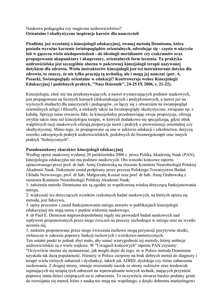 Naukowa pedagogika czy magiczne uzdrowicielstwo? Orientalne i okultystyczne inspiracje kursów dla nauczycieli Pisaliśmy już wcześniej o kinezjologii edukacyjnej, zwanej metodą Dennisona, która posiada wyraźne korzenie światopoglądów orientalnych, odwołując się - często w ukryciu lub w gąszczu wielu niedopowiedzeń - do ideologii meridianów czy czakramów oraz propagowania akupunktury i akupresury, orientalnych form leczenia. Ta praktyka uzdrowicielska jest szczególnie obecna w pokrewnej kinezjologii terapii nazywanej dotykiem dla zdrowia. Wielu instruktorów kinezjologii jest też instruktorami dotyku dla zdrowia, to znaczy, że nie tylko pracują tą techniką, ale i mogą jej nauczać (por. A. Posacki, Światopoglądy orientalne w edukacji? Kontrowersje wobec Kinezjologii Edukacyjnej i podobnych praktyk, "Nasz Dziennik", 24-25 IX 2006, s. 21-22). Kinezjologia, choć nie ma przekonywających, a nawet wystarczających podstaw naukowych, jest propagowana na licznych kursach (dokształcających i podyplomowych, a nawet już na wyższych studiach) dla nauczycieli i pedagogów, co łączy się z otwarciem na światopogląd orientalnych religii i filozofii, a niekiedy także na światopoglądy okultystyczne, związane np. z kabałą. Sprzyja temu otwarciu fakt, że kinezjolodzy przedstawiając swoje propozycje, oferują zwykle także inne niż kinezjologia terapie, w których dodatkowo się specjalizują, gdzie obok wątpliwych racji naukowych oferują propozycje teorii i praktyk o proweniencji orientalnej czy okultystycznej. Mimo tego, że propagowane są one w sektorze edukacji i szkolnictwa, dotyczą szeroko zakrojonych praktyk uzdrowicielskich, podobnych do bioenergoterapii oraz innych praktyk "holistycznych". Pseudonaukowy charakter kinezjologii edukacyjnej Według opinii naukowej wydanej 20 października 2006 r. przez Polską Akademię Nauk (PAN), kinezjologia edukacyjna nie ma podstaw naukowych. Oto wnioski końcowe raportu opracowanego przez prof. dr hab. Annę Grabowską na zlecenie Komitetu Neurobiologii Polskiej Akademii Nauk. Dokument został podpisany przez prezesa Polskiego Towarzystwa Badań Układu Nerwowego, prof. dr hab. Małgorzatę Kossut oraz prof. dr hab. Annę Grabowską z ramienia Komitetu Neurobiologii Polskiej Akademii Nauk: 1. założenia metody Dennisona nie są zgodne ze współczesną wiedzą dotyczącą funkcjonowania mózgu, 2. większość tez dotyczących wyników rzekomych badań naukowych, na których opiera się metoda, jest fałszywa, 3. opisy procesów i zasad funkcjonowania mózgu zawarte w publikacjach kinezjologii edukacyjnej nie mają sensu z punktu widzenia naukowego, 4. dr Paul E. Dennison najprawdopodobniej nigdy nie prowadził badań naukowych nad wpływem proponowanych przez niego ćwiczeń na procesy zachodzące w mózgu oraz na wyniki uczenia się, 5. niektóre proponowane przez niego ćwiczenia ruchowe mogą przynosić pozytywne skutki, zwłaszcza w zakresie poprawy funkcji ruchowych i wzrokowo-motorycznych. Ten ostatni punkt to jednak zbyt mało, aby uznać wiarygodność tej metody, której ambicje uzdrowicielskie są o wiele większe. W "Uwagach końcowych" raportu PAN czytamy: "Oczywiście można się zastanawiać, jak mogło dojść do tego, że w Polsce metoda Dennisona uzyskała tak dużą popularność. Niestety w Polsce cierpimy na brak dobrych metod do diagnozy i terapii wielu różnych zaburzeń i dysfunkcji, takich jak ADHD, dysleksja czy różne zaburzenia zachowania. Z drugiej strony, istnieje zrozumiały nacisk ze strony rodziców oraz środowisk zajmujących się terapią tych zaburzeń na wprowadzanie nowych technik, mających przynieść poprawę stanu dzieci cierpiących na te zaburzenia. To oczywiście stwarza bardzo podatny grunt do rozwijania się metod, które z nauką nie mają nic wspólnego, a dzięki dobremu marketingowi 2 oraz stosowaniu pseudonaukowego języka znajdują chętnych do ich opanowywania i stosowania. Takie przykłady pokazują, jak ważne jest, by państwo przeznaczało znacznie większe sumy na badania naukowe oraz oparty na tych badaniach proces opracowywania i wdrażania dobrych metod diagnostycznych i terapeutycznych. Ma to bowiem kluczowe znaczenie społeczne. Wszystkie działania zmierzające do opracowania tych metod powinny być prowadzone we współpracy z naukowcami zajmującymi się badaniami nad funkcjonowaniem mózgu, by uniknąć wprowadzania do obiegu społecznego procedur o żenująco niskich podstawach naukowych" (pełny tekst znajduje się na stronach internetowych PAN lub mojej książce "Psychologia i okultyzm", Gdańsk 2007). Podobnie druzgocąco negatywna jest opinia prof. dr hab. Ewy Pisuli z Wydziału Psychologii na Uniwersytecie Warszawskim, dla której "upowszechnianie sposobu myślenia o przyczynach zaburzonego funkcjonowania dzieci z problemami rozwojowymi oraz postulowanych sposobów postępowania obecnych w opracowaniach Paula Dennisona i Gail Dennison oraz w polskich opracowaniach dotyczących kinezjologii edukacyjnej, ma więcej wspólnego z 'cudownymi', magicznymi kuracjami niż rzetelną wiedzą i rzeczywistymi możliwościami pomocy osobom z autyzmem i innymi zaburzeniami rozwoju. Na próżno szukalibyśmy terminów takich, jak 'neurokinezjologia' czy choćby 'integracja mózgu' w bazach bibliograficznych zawierających poddane empirycznej weryfikacji opracowania na temat autyzmu. Nie sposób też trafić na prace Paula Dennisona, zawierające tezy obecne w jego opracowaniach wydanych w Polsce w uznanych, kierujących się zasadami obiektywnego poznania i rzetelnego dokumentowania formułowanych sądów pismach z dziedziny psychologii czy neurobiologii. Lektura wydanych w języku polskim prac P. Dennisona i G. Dennison budzi ogromne wątpliwości. Jest w nich wiele kontrowersyjnych sformułowań, o których w najlepszym wypadku można powiedzieć, że są niejasne. Nie brakuje też jednak stwierdzeń, które w świetle współczesnej wiedzy z zakresu