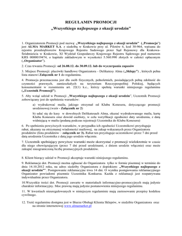 REGULAMIN PROMOCJI „Wszystkiego najlepszego z okazji urodzin” 1. Organizatorem Promocji pod nazwą: „Wszystkiego najlepszego z okazji urodzin” („Promocja”) jest ALMA MARKET S.A. z siedzibą w Krakowie przy ul. Pilotów 6, kod 30-964, wpisana do rejestru przedsiębiorców Krajowego Rejestru Sadowego przez Sąd Rejonowy dla KrakowaŚródmieścia w Krakowie, XI Wydział Gospodarczy Krajowego Rejestru Sądowego pod numerem KRS 0000019474, o kapitale zakładowym w wysokości 5.560.990 złotych w całości opłaconym („Organizator”). 2. Czas trwania Promocji: od 26.08.12. do 30.09.12. lub do wyczerpania zapasów 3. Miejsce Promocji: placówki handlowe Organizatora - Delikatesy Alma („Sklepy”) , których pełna lista stanowi Załącznik nr 1 do regulaminu. 4. Promocja przeznaczona jest dla osób fizycznych, pełnoletnich, posiadających pełną zdolność do czynności prawnych, zamieszkałych na terytorium Rzeczypospolitej Polskiej, będących konsumentami w rozumieniu art. 22(1) k.c., którzy spełnią warunki niniejszego regulaminu („Uczestnik Promocji”). 5. Aby wziąć udział w Promocji „Wszystkiego najlepszego z okazji urodzin”, Uczestnik Promocji zobowiązany jest do spełnienia warunków: a) wydrukować maila, jakiego otrzymał od Klubu Konesera, dotyczącego promocji urodzinowej (wzór - Załącznik nr 2) b) udać się do kasy w dowolnych Delikatesach Alma, okazać wydrukowanego maila, kartę Klubu Konesera oraz dowód osobisty, w celu weryfikacji zgodności daty urodzenia, z datą widniejącą w mailu (podaną podczas rejestracji Uczestnika do Klubu Konesera) 6. Po spełnieniu powyższych warunków, w przypadku ich zgodności Uczestnikowi przysługuje rabat, ukazany na otrzymanej wiadomości mailowej, na zakup wskazanych przez Organizatora produktów (lista produktów – załącznik nr 3). Rabat ten przysługuje uczestnikowi przez 7 dni przed datą urodzenia Uczestnika z datą jego urodzin włącznie. 7. Uczestnik spełniający powyższe warunki może skorzystać z promocji wielokrotnie w czasie dla niego obowiązującym (przez 7 dni przed urodzinami, z dniem urodzin włącznie) oraz może zakupić nieograniczoną liczbę promocyjnych produktów. 8. Klient biorący udział w Promocji akceptuje warunki niniejszego regulaminu. 9. Reklamacje dot. Promocji można zgłaszać do Organizatora tylko w formie pisemnej w terminie do dnia 14.10.2012 roku, na adres siedziby Organizatora z dopiskiem: „Wszystkiego najlepszego z okazji urodzin””. Postępowanie reklamacyjne trwa 14 dni. O wyniku postępowania reklamacyjnego Organizator powiadomi pisemnie Uczestnika Konkursu. Każda z reklamacji jest rozpatrywana indywidualnie przez Organizatora. 10.Wszystkie treści dot. Promocji zawarte w materiałach informacyjno-promocyjnych mają jedynie charakter informacyjny. Moc prawną mają jedynie postanowienia niniejszego regulaminu. 11. W kwestiach nieuregulowanych w niniejszym regulaminie mają zastosowanie przepisy kodeksu cywilnego. 12. Treść regulaminu dostępna jest w Biurze Obsługi Klienta Sklepów, w siedzibie Organizatora oraz na stronie internetowej www.almamarket.pl Załącznik nr 1 1. 2. 3. 4. 5. 6. 7. 8. 9. 10. 11. 12. 13. 14. 15. 16. 17. 18. 19. 20. 21. 22. 23. 24. 25. 26. 27. Bydgoszcz, Focus Mall, ul. Jagiellońska 39-47, Poniedziałek - Niedziela 9:00 - 21:00 Częstochowa, Galeria Jurajska, Al. Wojska Polskiego 207, Poniedziałek - Sobota 10:00 - 22:00, Niedziela 10:00 - 20:00 Gdynia, ul. Redłowska 41, Poniedziałek - Sobota 8:00 - 22:00, Niedziela 10:00 - 20:00 Katowice, Hala Parkowa, ul. Kościuszki 90, Poniedziałek - Sobota 9:00 - 21:00, Niedziela 10:00 - 20:00 Kraków, ul. Kościuszki 71, Poniedziałek - Sobota 8:00 - 21:00, Niedziela 9:00 - 20:00 Kraków, Galeria Kazimierz, ul. Podgórska 34, Poniedziałek - Sobota 10:00 - 22:00, Niedziela 10:00 - 20:00 Kraków, ul. Pilotów 6, Poniedziałek - Sobota 8:00 - 22:00, Niedziela 9:00 - 20:00 Kraków, ul. Stańczyka 14/2, 30-126 Kraków, Poniedziałek - Sobota 8:00 - 22:00, Niedziela 9:00 - 21:00 Lubin, Cuprum Arena, ul. Sikorskiego 20, Poniedziałek - Czwartek 8:00 - 21:00, Piątek - Sobota 8:00 - 22:00, Niedziela 9:00 - 21:00 Lublin, Galeria Olimp, Al. Spółdzielczości Pracy 34, Poniedziałek - Sobota 9:00 21:00, Niedziela 9:00 - 20:00 Łódź, ul. Kilińskiego 122 – 128 , Poniedziałek - Sobota 8:00 - 21:00, Niedziela 9:00 20:00 Łódź, Manufaktura, ul. Ogrodowa19A, Poniedziałek - Sobota 9:00 - 22:00, Niedziela 9:00 - 21:00 Nowy Targ, ul. Szafarska 174, Poniedziałek - Piątek 9:00 - 21:00, Sobota 8:00 - 21:00, Niedziela 10:00 - 19:00 Opole, Solaria Center, Pl. Kopernika 16, Poniedziałek - Sobota 8:00 - 22:00, Niedziela 9:00 - 21:00 Piaseczno, ul. Wojska Polskiego 17, Poniedziałek - Sobota 8:00 - 22:00, Niedziela 10:00 - 20:00 Poznań, City Park, ul. Wyspiańskiego 26, Poniedziałek - Sobota 8:00 - 22:00, Niedziela 9:00 - 20:00 Poznań, Stary Browar, ul. Półwiejska 42, Poniedziałek - Sobota 8:00 - 22:00, Niedziela 9:00 - 21:00 Pruszków, ul. Sprawiedliwości 4, Poniedziałek - Sobota 8:00 - 22:00, Niedziela 10:00 - 20:00 Rybnik, Focus Mall, ul. Chrobrego 1, Poniedziałek - Niedziela 9:00 - 21:00 Rzeszów, Capital Park, ul. Rejtana 23, Poniedziałek - Sobota 8:00 - 22:00, Niedziela 10:00 - 20:00 Sopot, ul. Sikorskiego 8/10, Poniedziałek - Sobota 8:00 - 22:00, Niedziela 10:00 20:00 Tarnów, ul. Dąbrowskiego 10, Poniedziałek - Sobota 8:00 - 22:00, Niedziela 10:00 20:00 Warszawa, C.H. Promenada, ul. Ostrobramska 75C, Poniedziałek - Sobota 9:00 22:00, Niedziela 10:00 - 20:00 Warszawa, C.H Srokosze, ul. Gen. Sławoja Składkowskiego 4, Poniedziałek - Sobota 10:00 - 21:00, Niedziela 10:00 - 20:00 Warszawa, ul. Zwycięzców 40, Poniedziałek - Sobota 8:00 - 22:00, Niedziela 10:00 20:00 Wrocław, Arkady Wrocławskie, ul. Powstańców Śląskich 2 – 4 , Poniedziałek Sobota 8:00 - 22:00, Niedziela 9:00 - 21:00 Wrocław, Park Handlowy Bielany, ul. Czekoladowa 9, Poniedziałek - Sobota 9:00 2