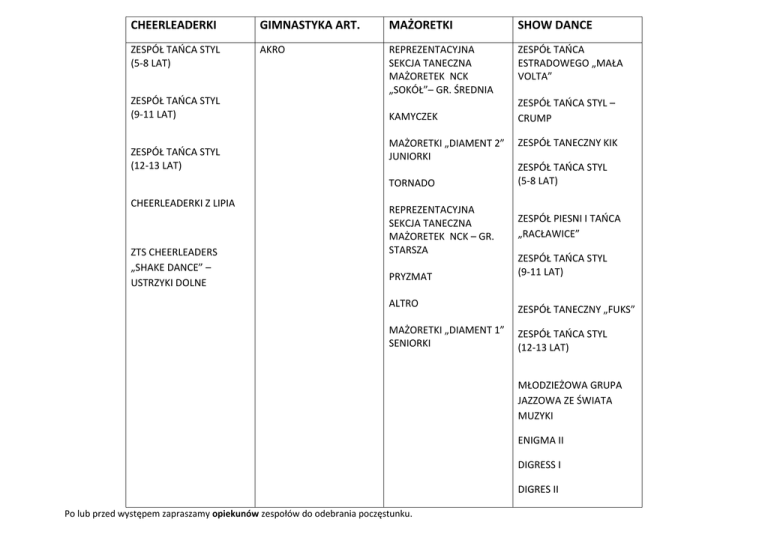 CHEERLEADERKI GIMNASTYKA ART. MAŻORETKI SHOW DANCE ZESPÓŁ TAŃCA STYL (5-8 LAT) AKRO REPREZENTACYJNA SEKCJA TANECZNA MAŻORETEK NCK „SOKÓŁ”– GR. ŚREDNIA ZESPÓŁ TAŃCA ESTRADOWEGO „MAŁA VOLTA” ZESPÓŁ TAŃCA STYL (9-11 LAT) ZESPÓŁ TAŃCA STYL (12-13 LAT) KAMYCZEK MAŻORETKI „DIAMENT 2” JUNIORKI TORNADO CHEERLEADERKI Z LIPIA ZTS CHEERLEADERS „SHAKE DANCE” – USTRZYKI DOLNE REPREZENTACYJNA SEKCJA TANECZNA MAŻORETEK NCK – GR. STARSZA PRYZMAT ALTRO MAŻORETKI „DIAMENT 1” SENIORKI ZESPÓŁ TAŃCA STYL – CRUMP ZESPÓŁ TANECZNY KIK ZESPÓŁ TAŃCA STYL (5-8 LAT) ZESPÓŁ PIESNI I TAŃCA „RACŁAWICE” ZESPÓŁ TAŃCA STYL (9-11 LAT) ZESPÓŁ TANECZNY „FUKS” ZESPÓŁ TAŃCA STYL (12-13 LAT) MŁODZIEŻOWA GRUPA JAZZOWA ZE ŚWIATA MUZYKI ENIGMA II DIGRESS I DIGRES II Po lub przed występem zapraszamy opiekunów zespołów do odebrania poczęstunku.
