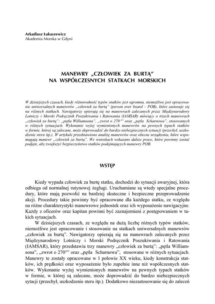 Arkadiusz Łukaszewicz Akademia Morska w Gdyni MANEWRY „CZŁOWIEK ZA BURTĄ” NA WSPÓŁCZESNYCH STATKACH MORSKICH W dzisiejszych czasach, kiedy różnorodność typów statków jest ogromna, niemożliwe jest opracowanie uniwersalnych manewrów „człowiek za burtą” (person over board – POB), które zastosuje się na różnych statkach. Nawigatorzy opierają się na manewrach zalecanych przez Międzynarodowy Lotniczy i Morski Podręcznik Poszukiwania i Ratowania (IAMSAR) mówiący o trzech manewrach „człowiek za burtą”: „pętla Williamsona”, „zwrot o 270°” oraz „pętla Scharnowa”, stosowanych w różnych sytuacjach. Wykonanie wyżej wymienionych manewrów na pewnych typach statków w formie, której są zalecane, może doprowadzić do bardzo niebezpiecznych sytuacji (przechył, uszkodzenie steru itp.). W artykule przedstawiono analizę manewrów oraz obecne urządzenia, które wspomagają manewr „człowiek za burtą”. We wnioskach wskazano dalsze prace, które powinny zostać podjęte, aby zwiększyć bezpieczeństwo statków podejmujących manewry POB. WSTĘP Kiedy wypada człowiek za burtę statku, dochodzi do sytuacji awaryjnej, która odbiega od normalnej rutynowej żeglugi. Uruchamiane są wtedy specjalne procedury, które mają pozwolić na bardziej skuteczne i bezpieczne przeprowadzenie akcji. Procedury takie powinny być opracowane dla każdego statku, ze względu na różne charakterystyki manewrowe jednostek oraz ich wyposażenie nawigacyjne. Każdy z oficerów oraz kapitan powinni być zaznajomieni z postępowaniem w takich sytuacjach. W dzisiejszych czasach, ze względu na dużą liczbę różnych typów statków, niemożliwe jest opracowanie i stosowanie na statkach uniwersalnych manewrów „człowiek za burtą”. Nawigatorzy opierają się na manewrach zalecanych przez Międzynarodowy Lotniczy i Morski Podręcznik Poszukiwania i Ratowania (IAMSAR), który przedstawia trzy manewry „człowiek za burtą”: „pętla Williamsona”, „zwrot o 270°” oraz „pętla Scharnowa”, stosowane w różnych sytuacjach. Manewry te zostały opracowane w I połowie XX wieku, kiedy konstrukcja statków, ich prędkości oraz wyposażenie było zupełnie inne niż współczesnych statków. Wykonanie wyżej wymienionych manewrów na pewnych typach statków w formie, w której są zalecane, może doprowadzić do bardzo niebezpiecznych sytacji (przechył, uszkodzenie steru itp.). Dodatkowo niezastosowanie się do zaleceń 42 ZESZYTY NAUKOWE AKADEMII MORSKIEJ W GDYNI, nr 77, grudzień 2012 IMO może okazać się zgubne w konsekwencjach dla kapitana, który wykonał własne manewry, szczególnie kiedy akcja zakończy się niepowodzeniem. Zasadne wydaje się więc opracowanie takich procedur dla poszczególnych statków, które pozwolą w sytuacji „człowiek za burtą” na bezpieczne i efektywne wykonanie manewrów. Parametrami, które determinują manewr, mogą być: minimalny czas powrotu do pozycji POB (person over board) oraz maksymalny kąt przechyłu statku. 1. MANEWRY „CZŁOWIEK ZA BURTĄ” WEDŁUG IAMSAR W akcjach poszukiwania człowieka, który wypadł za burtę, największe znaczenie ma dotarcie do miejsca wypadku w jak najkrótszym czasie. Manewry, które zaleca IAMSAR, pozwalają na takie właśnie manewry, jednak nie uwzględniają one innych czynników, które mogą znacząco wpływać na bezpieczeństwo statku: • charakterystyki manewrowe statku, • kierunek i stan morza, • możliwość operacji silnikiem oraz sterem. Manewrami tymi są: pętla Williamsona, zwrot o 270°, pętla Scharnowa. Stosuje się je w trzech różnych sytuacjach: • akcja natychmiastowa – człowiek za burtą został zauważony z mostka i akcja została podjęta natychmiast; • akcja opóźniona – informacja o wypadnięciu człowieka za burtę została przekazana na mostek przez świadka i akcję podjęto z opóźnieniem; • zaginięcie osoby – na mostek przekazano informację o zaginięciu osoby. a) b) c) Rys. 1. Manewry człowiek za burtą: a) pętla Williamsona, b) zwrot o 270°, c) pętla Scharnova [2] Fig. 1. Man Over Board manoeuvres: a) Williamson Turn, b) 270° Turn, c) Scharnov Turn [2] A. Łukaszewicz, Manewry „człowiek za burtą”, na współczesnych statkach morskich 43 Pętla Williamsona Nieskomplikowany manewr (rys. 1a), który pozwala na wejście dokładnie na kontrkurs, jednak statek odchodzi dosyć daleko od miejsca wypadku, a przy tym zajmuje to stosunkowo dużo czasu. Wykonanie pętli Williamsona: • wyłożyć ster na burtę, z której wypadł człowiek; • po zmianie kursu o 60° przełożyć ster na burtę przeciwną; • po osiągnięciu kursu o 20° mniejszego od kontrkursu położyć ster na środek. Zwrot o 270° Stosunkowo trudny manewr (rys. 1b), szczególnie dla statków jednośrubowych o dużym promieniu cyrkulacji, jednak bardzo szybki. Wykonanie zwrotu o 270°: • wyłożyć ster na burtę, z której wypadł człowiek; • po zmianie kursu początkowego o 250° przełożyć ster na środek i rozpocząć manewr zatrzymania statku. Pętla Scharnowa Szybki manewr (rys. 1c), który wprowadza statek z powrotem w jego tor, pozwalając przebyć mniejszą drogę. Wykonanie pętli Scharnowa: • wyłożyć ster na burtę; • po zmianie kursu początkowego o 240° wyłożyć ster na burtę przeciwną; • kiedy statek osiągnie kurs o 20° mniejszy niż kontrkurs, przełożyć ster na środek tak, aby statek położył się na kontrkurs. Wyżej opisane manewry zostały opracowane w czasach, kiedy brakowało narzędzi do natychmiastowego zaznaczenia pozycji rozbitka, a najważniejszym czynnikiem był powrót do miejsca wypadku na podstawie jedynie prawidłowo wykonanego manewru. 1.1. Akcja natychmiastowa Akcja natychmiastowa ma miejsce, kiedy z mostka nawigacyjnego zostanie zauważony człowiek za burtą. W takiej sytuacji zalecane są dwa manewry: pętla Williamsona oraz zwrot o 270°. Zarówno w pierwszym, jak i drugim pr