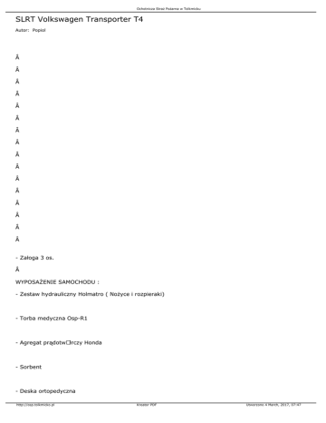 Ochotnicza Straż Pożarna w Tolkmicku SLRT Volkswagen Transporter T4 Autor: Popiol                 - Załoga 3 os.  WYPOSAŻENIE SAMOCHODU : - Zestaw hydrauliczny Holmatro ( Nożyce i rozpieraki) - Torba medyczna Osp-R1 - Agregat prądotwÃłrczy Honda - Sorbent - Deska ortopedyczna http://osp.tolkmicko.pl Kreator PDF Utworzono 4 March, 2017, 07:47 Ochotnicza Straż Pożarna w Tolkmicku - Sprzęt do znakowania miejsca zdarzenia - Piła do cięcia betonu i stali Stihl TS 400 - Koce  - Siekiera  - Taśma ostrzegawcza  - 2 Gaśnice  - Szyny Kramera  - Łom  - Płyn owadobÃłjczy Detmol  NUMER OPERACYJNY: 349n54    Kierowcą i opiekunem samochodu jest                 Daniel Pawłowski  http://osp.tolkmicko.pl Kreator PDF Utworzono 4 March, 2017, 07:47