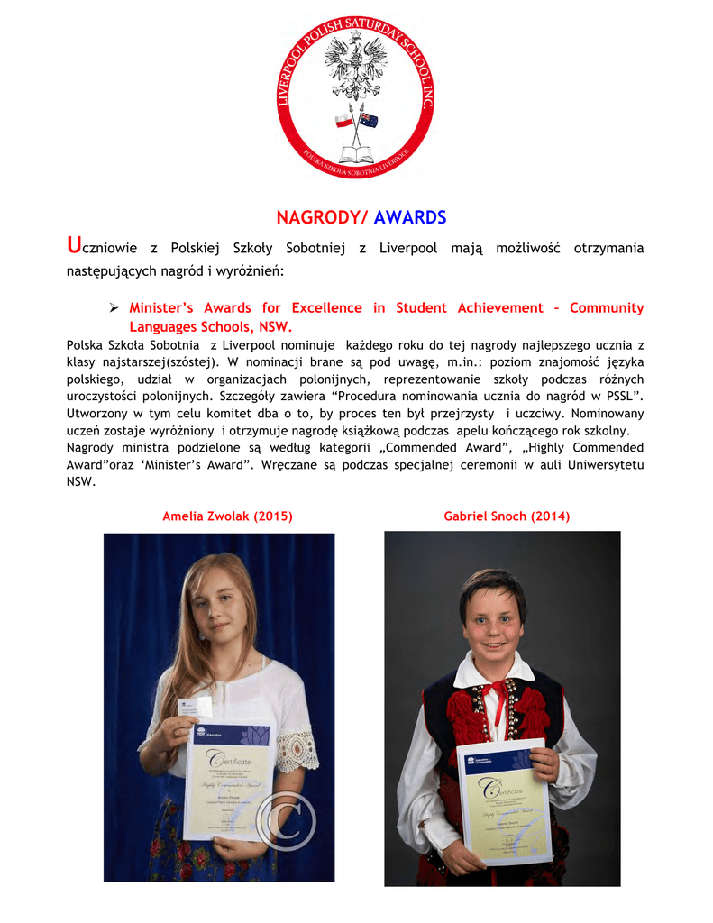 NAGRODY/ AWARDS Uczniowie z Polskiej Szkoły Sobotniej z Liverpool mają możliwość otrzymania następujących nagród i wyróżnień: Ø Minister’s Awards for Excellence in Student Achievement – Community Languages Schools, NSW. Polska Szkoła Sobotnia z Liverpool nominuje każdego roku do tej nagrody najlepszego ucznia z klasy najstarszej(szóstej). W nominacji brane są pod uwagę, m.in.: poziom znajomość języka polskiego, udział w organizacjach polonijnych, reprezentowanie szkoły podczas różnych uroczystości polonijnych. Szczegóły zawiera “Procedura nominowania ucznia do nagród w PSSL”. Utworzony w tym celu komitet dba o to, by proces ten był przejrzysty i uczciwy. Nominowany uczeń zostaje wyróżniony i otrzymuje nagrodę książkową podczas apelu kończącego rok szkolny. Nagrody ministra podzielone są według kategorii „Commended Award”, „Highly Commended Award”oraz ‘Minister’s Award”. Wręczane są podczas specjalnej ceremonii w auli Uniwersytetu NSW. Amelia Zwolak (2015) Gabriel Snoch (2014) Paulina Siewicz (2013) Uczniowi wyróżnieni Nagrodą Ministra Edukacji dla najlepszych uczniów szkół etnicznych 2002 2003 2004 2005 Sonia Jagodzińska Sandra Szubert Arkadiusz Bryl Paula Jagodzińska 2006 2007 2008 2009 Antoni Nocon Sylwia Malicki Michal Buchta Szczepan Glewicz 2010 _ 2011 2012 Izabella Majewski Monika Chorobski 2013 Paulina Siewicz 2014 Gabriel Snoch 2015 Amelia Zwolak Ø Nagroda im. Harcmistrza Witolda Szupryczyńskiego Każdego roku Polska Szkoła Sobotnia z Liverpool nominuje ucznia, w kategorii junior do nagrody im. Harcmistrza Witolda Szupryczyńskiego. W nominacji brane są pod uwagę: udział ucznia w organizacjach polonijnych, konkursach ogłaszanych przez organizacje polskie, reprezentowanie szkoły na zewnątrz, poziom znajomość języka polskiego. Wyróżniony uczeń otrzymuje nagrodę książkową podczas uroczystych obchodów 3 Majowych w Polskim Klubie w Ashfield. Utworzony w tym celu komitet dba o to, by proces ten był przejrzysty i uczciwy. Jacek Majewski (2013) Tomasz Kawa (2014) Ø Izabela Kotarski (z mamą) 2015 Ø Emilia Michalak (2016) Ø Nagrody dla najlepszych czytelników. Uczniowie, którzy systematycznie korzystają ze szkolnej biblioteki zostają wyróżnieni podczas uroczystości zakończenia roku szkolnego. Najlepsi czytelnicy otrzymują dyplomy i drobne upominki. Nagrodzeni uczniowie paniami bibliotekarkami (2014). STUDENTS’ AWARDS The Liverpool Polish Saturday School is committed to encouraging and motivating student learning through the issuing of Awards for excellence and achievement. The following Awards are presented each year: Ø Minister’s Awards for Excellence in Student Achievement – Community Languages Schools, NSW. Every year up students from the various community languages schools are recognised for their hard work and excellence through the Minister’s Awards for Excellence in Student Achievement. The awards and certificates for students who are highly commenced and commended are presented at a special awards ceremony. Liverpool Polish Saturday School nominates one student per year for the Junior Category. The nominated student is selected from Year 6 through an extensive assessment process. A committee ensures that the process is fair, transparent and appropriate. The assessment takes into account: accomplishment in language, achievement and fluency, appreciation of cultural background and demonstration of intercultural understanding. The nominated student is presented with a certificate and gift at the End of Year Concert. Ø The Award of Witold Szupryczyński Each year, Liverpool Polish School nominates a student from the school for the junior category of the Witold Szupryczyński Award. This award recognises students who have performed outstandingly in representing the school and values the Polish culture. The student is also acknowledged for their excellent Polish language abilities and strong overall academic performance. The award is presented to the selected student at the 3rd May Academe at Ashfield Polish Club. Ø Library Achievement Award - Liverpool Polish Saturday School The Liverpool Polish Saturday School has a library available for children to utilise. The library assists students in developing learning strategies that equip them to appreciate and enjoy a rich literary heritage. Students are able to borrow books each week. Books may be borrowed for up to two weeks. A list of books that are borrowed is maintained and the student who reads the most books is awarded by the school at the end of year with a certificate and gift. Minister’s Awards for Excellence Community Languages Schools 2002 2003 2004 2005 Sonia Jagodzinska Sandra Szubert Arkadiusz Bryl Paula Jagodzinska 2006 2007 2008 2009 Antoni Nocon Sylwia Malicki Michal Buchta Szczepan Glewicz 2010 _ 2011 2012 Izabella Majewski Monika Chorobski 2013 Paulina Siewicz 2014 Gabriel Snoch 2015 Amelia Zwolak