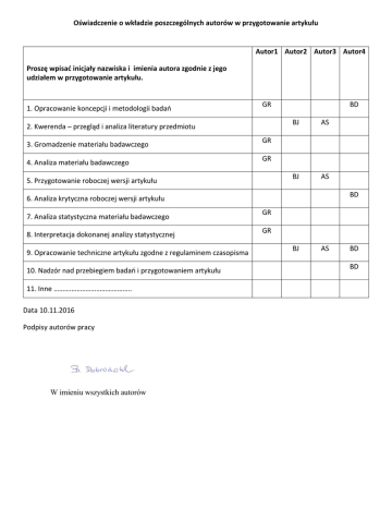 Oświadczenie o wkładzie poszczególnych autorów w przygotowanie artykułu Autor1 Autor2 Autor3 Autor4 Proszę wpisać inicjały nazwiska i imienia autora zgodnie z jego udziałem w przygotowanie artykułu. 1. Opracowanie koncepcji i metodologii badań GR 2. Kwerenda – przegląd i analiza literatury przedmiotu 3. Gromadzenie materiału badawczego 4. Analiza materiału badawczego BD BJ AS BJ AS GR GR 5. Przygotowanie roboczej wersji artykułu BD 6. Analiza krytyczna roboczej wersji artykułu 7. Analiza statystyczna materiału badawczego 8. Interpretacja dokonanej analizy statystycznej 9. Opracowanie techniczne artykułu zgodne z regulaminem czasopisma 10. Nadzór nad przebiegiem badań i przygotowaniem artykułu 11. Inne …………………………………….. Data 10.11.2016 Podpisy autorów pracy W imieniu wszystkich autorów GR GR BJ AS BD BD
