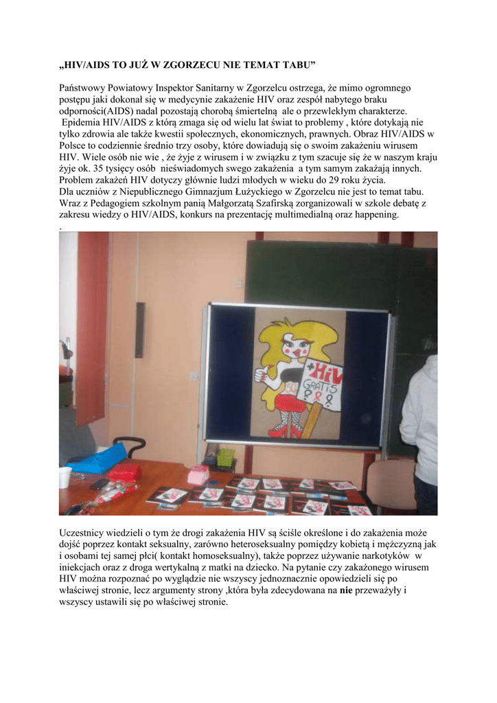„HIV/AIDS TO JUŻ W ZGORZECU NIE TEMAT TABU” Państwowy Powiatowy Inspektor Sanitarny w Zgorzelcu ostrzega, że mimo ogromnego postępu jaki dokonał się w medycynie zakażenie HIV oraz zespół nabytego braku odporności(AIDS) nadal pozostają chorobą śmiertelną ale o przewlekłym charakterze. Epidemia HIV/AIDS z którą zmaga się od wielu lat świat to problemy , które dotykają nie tylko zdrowia ale także kwestii społecznych, ekonomicznych, prawnych. Obraz HIV/AIDS w Polsce to codziennie średnio trzy osoby, które dowiadują się o swoim zakażeniu wirusem HIV. Wiele osób nie wie , że żyje z wirusem i w związku z tym szacuje się że w naszym kraju żyje ok. 35 tysięcy osób nieświadomych swego zakażenia a tym samym zakażają innych. Problem zakażeń HIV dotyczy głównie ludzi młodych w wieku do 29 roku życia. Dla uczniów z Niepublicznego Gimnazjum Łużyckiego w Zgorzelcu nie jest to temat tabu. Wraz z Pedagogiem szkolnym panią Małgorzatą Szafirską zorganizowali w szkole debatę z zakresu wiedzy o HIV/AIDS, konkurs na prezentację multimedialną oraz happening. . Uczestnicy wiedzieli o tym że drogi zakażenia HIV są ściśle określone i do zakażenia może dojść poprzez kontakt seksualny, zarówno heteroseksualny pomiędzy kobietą i mężczyzną jak i osobami tej samej płci( kontakt homoseksualny), także poprzez używanie narkotyków w iniekcjach oraz z droga wertykalną z matki na dziecko. Na pytanie czy zakażonego wirusem HIV można rozpoznać po wyglądzie nie wszyscy jednoznacznie opowiedzieli się po właściwej stronie, lecz argumenty strony ,która była zdecydowana na nie przeważyły i wszyscy ustawili się po właściwej stronie. Państwowy Powiatowy Inspektor Sanitarny w Zgorzelcu gratuluje pani pedagog Małgorzacie Szafirskiej oraz jej uczniom działań, które z pewnością przełożą się na dobre wybory życiowe, podniesienie świadomości i brak ryzykownych zachowań seksualnych co w konsekwencji będzie skutkowało zmniejszeniem zakażeń wśród tej grupy wiekowej.. Działania podnoszące wiedzę i świadomość zaoszczędzą w przyszłości wiele bólu ich najbliższym oraz poczucia odrzucenia i naznaczenia. Opracowała G. Niedziela