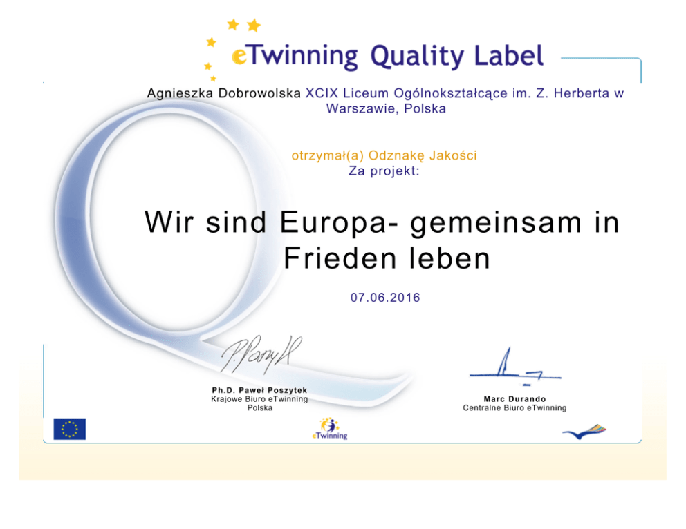 Agnieszka Dobrowolska XCIX Liceum Ogólnokształcące im. Z. Herberta w Warszawie, Polska otrzymał(a) Odznakę Jakości Za projekt: Wir sind Europa- gemeinsam in Frieden leben 07.06.2016 Ph.D. Paweł Poszytek Krajowe Biuro eTwinning Polska Marc Durando Centralne Biuro eTwinning