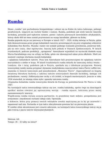 Szkoła Tańca w Londynie Rumba Słowo „rumba” jest pochodzenia hiszpańskiego i odnosi się na Kubie do tańca ludowego, pełnego gwałtownych, wijących się ruchów bioder i ramion. Rumba, podobnie jak wiele tańców Ameryki łacińskiej, powstała pod wpływem rytmów, pieśni i tańców pierwszych niewolników afrykańskich, którzy około 400 lat temu zostali przywiezieni na wyspy karaibskie, głównie na Kubę. Rumba pojawiła się po raz pierwszy w Europie w latach 1927 – 1929, ściślej mówiąc w Paryżu, gdzie była demonstrowana przez grupę kubańskich tancerzy prezentujących się przy oryginalnej orkiestrze kubańskiej Don Baretta. Muzyka i taniec nie zyskały godnego wzmianki powodzenia, ponieważ były, jak na owe czasy, zbyt egzotyczne. Inaczej było jednak w Stanach Zjednoczonych. W latach trzydziestych, podczas prohibicji, „spragnieni” Amerykanie wyjeżdżali na wycieczki dookoła wysp Morza Karaibskiego oraz na urlopy na Kubę, gdzie nie obowiązywał zakaz picia alkoholu. Mieli oni możność częstego słuchania muzyki kubańskiej i oglądania kubańskich tańców. Poza tym Amerykanie byli przyzwyczajeni do oglądania tańców murzyńskich u siebie w kraju. W latach trzydziestych rumba dotarła do tanecznej stolicy świata – Londynu. Ale i tutaj, podobnie jak w Paryżu, spotkała się z chłodnym przyjęciem. Rozwój towarzyskiej rumby można przypisać słynnemu londyńskiemu nauczycielowi tańca Pierre Laffite’owi, znanemu w świecie tanecznym pod pseudonimem „Monsieur Pierre”. Zapoczątkował on bogatą światową literaturę fachową z zakresu tańców towarzyskich Ameryki łacińskiej, badając ich pochodzenie, rozwój i folklorystyczne cechy u ich źródeł, w krajach macierzystych. Jeszcze w roku 1934 stwierdził, że istnieją różne style i sposoby tańczenia rumby. Oryginalna kubańska rumba towarzyska dotarła do Europy za pośrednictwem Mr Pierra w roku 1947. Na turniejach tańca towarzyskiego tańczy się tzw. rumbę kubańską, oprócz tego na dancingach spotkać można również jej uproszczoną wersję – rumbę square, tańczoną przez mniej zaawansowanych tancerzy. Współczesna rumba wyraża uczucia partnerów, to prawdziwy teatr miłości, przepełniona jest erotyzmem i zmysłowymi ruchami całego ciała. Opowiada o kobiecie, która przy pomocy swoich wdzięków uwodzi mężczyznę po to by go zniewolić i zapanować nad nim. Partnerka w tym tańcu zdecydowanie powinna być na pierwszym planie. W rumbie silnie akcentowane jest czwarte uderzenie, na turniejach tańca towarzyskiego tańczy się ją jako trzecią z pięciu tańców latynoamerykańskich. Metrum: 4/4 Tempo: 26 – 32 takty na minut?
