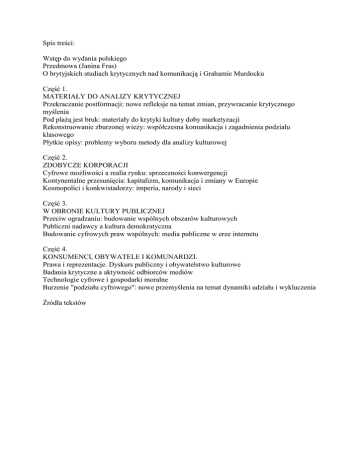 Spis treści: Wstęp do wydania polskiego Przedmowa (Janina Fras) O brytyjskich studiach krytycznych nad komunikacją i Grahamie Murdocku Część 1. MATERIAŁY DO ANALIZY KRYTYCZNEJ Przekraczanie postformacji: nowe refleksje na temat zmian, przywracanie krytycznego myślenia Pod plaŜą jest bruk: materiały do krytyki kultury doby marketyzacji Rekonstruowanie zburzonej wieŜy: współczesna komunikacja i zagadnienia podziału klasowego Płytkie opisy: problemy wyboru metody dla analizy kulturowej Część 2. ZDOBYCZE KORPORACJI Cyfrowe moŜliwości a realia rynku: sprzeczności konwergencji Kontynentalne przesunięcia: kapitalizm, komunikacja i zmiany w Europie Kosmopolici i konkwistadorzy: imperia, narody i sieci Część 3. W OBRONIE KULTURY PUBLICZNEJ Przeciw ogradzaniu: budowanie wspólnych obszarów kulturowych Publiczni nadawcy a kultura demokratyczna Budowanie cyfrowych praw wspólnych: media publiczne w erze internetu Część 4. KONSUMENCI, OBYWATELE I KOMUNARDZI. Prawa i reprezentacje. Dyskurs publiczny i obywatelstwo kulturowe Badania krytyczne a aktywność odbiorców mediów Technologie cyfrowe i gospodarki moralne Burzenie "podziału cyfrowego": nowe przemyślenia na temat dynamiki udziału i wykluczenia Źródła tekstów