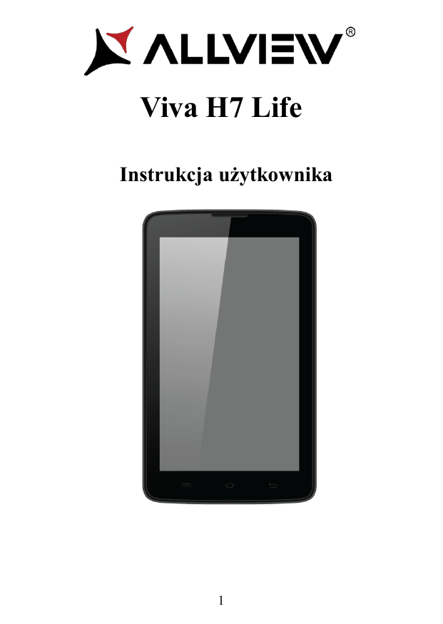 Viva H7 Life Instrukcja użytkownika 1 1 Przycisk zasilania 2 Przycisk głośności 3 Złącze słuchawek 4 Aparat tylni 5 Złącze karty SIM 6 Złącze karty MicroSD 7 Głośnik 8 Złącze micro USB 9 Mikrofon 2 Instrukcja użytkownika Allview Viva H7 Life Wstęp Dziękujemy za zakup naszego produktu. Niniejsza instrukcja obsługi ma pomóc użytkownikowi w szybkim i wygodnym korzystaniu z produktu. Prosimy o uważne zapoznanie się z danym dokumentem. Urządzenie to jest wyspecjalizowanym, przenośnym produktem najwyższej jakości, wyposażonym w szereg unikalnych i zaawansowanych funkcji. Informujemy, że wszelkie zmiany w treści tego dokumentu nie będą podawane do publicznej wiadomości. Producent będzie nadal dostarczać nowych funkcji dla rozwoju tego produktu, jednak nie będzie nigdzie umieszczał oddzielnej informacji w przypadku jakichkolwiek zmian w jego wydajności i funkcjach. Urządzenie jest używane jako przenośne, służące do przechowywania informacji, dlatego producent nie ponosi odpowiedzialności za bezpieczeństwo plików zapisanych na jego dysku. Jeżeli rzeczywista konfiguracja produktu i metody jego zastosowania nie są identyczne z tymi, jakie przedstawiono w poniższej instrukcji obsługi, zaleca się odwiedzić stronę internetową producenta w celu uzyskania aktualnych informacji o produkcie. 3 Kluczowe funkcje Pojemnościowy ekran dotykowy z obsługą multi-touch; Obsługa Wi-Fi, obsługa sieci komórkowej 3G; Dwa zintegrowane aparaty: przedni 1 Mpx, tylni 3Mpx Sieciowe rozmowy wideo i obsługa funkcji fotografii. Posiada system Android 4.2 Jelly Bean; Obsługa automatycznej rotacji ekranu: w poziomie lub w pione; Obsługa przeglądarki internetowej, czatów online, strumieniowania wideo, gier online, pobierania plików itd.; Obsługa dziesięciu tysięcy gier i programów gotowych do pobrania i instalacji; Wsparcie dla synchronicznego wyświetlania tekstów piosenek; Obsługa odtwarzania wideo z plików o maksymalnej rozdzielczości 1080p; Obsługa przeglądania zdjęć w wielu formatach; Obsługa funkcji e-book, odtwarzanie w wielu formatach. Szybka transmisja danych USB 2.0; Wbudowany mikrofon, długi czasu rejestracji dźwięku; Wsparcie aktualizacji oprogramowania; Obsługa kart microSD; Obsługa funkcji OTG; Możliwość rozszerzenia pamięci urządzenia. 4 Podstawowe operacje Włączanie zasilania Podczas, gdy urządzenie będzie wyłączone, naciśnij dłużej przycisk zasilania. Wyłączanie zasilania Podczas, gdy tablet będzie włączony, naciśnij przycisk zasilania przez około 3 sekund, do momentu pojawienia się okienka z menu opcji, wybierz "Wyłącz", aby wyłączyć urządzenie. Uśpienie Podczas normalnego użytkowania urządzenia, krótko naciśnij przycisk zasilania w celu przejścia w stan hibernacji. Ekran zostanie wyłączony. Ponowne krótkie naciśnięcie przycisku zasilania spowoduje wybudzenie i wznowienie pracy tabletu. Produkt można ustawić tak, aby wszedł w tryb uśpienia automatycznie po żądanym czasie bezczynności. Ponowne uruchamianie urządzenia Jeśli zauważysz, że urządzenie pracuje wolniej niż zwykle przy normalnym użytkowaniu, możesz wyłączyć jego zasilanie, a następnie uruchomić je ponownie w celu zrestartowania system operacyjnego. Wygaszacz ekranu Jeśli nie korzystasz z urządzenia przez określony czas, ani nie używasz jego przycisków, ekran zostanie automatycznie wyłączony. Jeśli konieczna jest dezaktywacja funkcji wygaszacza ekranu, możesz to zrobić wyłączając opcję [Wygaszacz ekranu], znajdującą się zakładce [Wyświetlacz] menu [Ustawienia]. Używanie karty microSD Po podłączeniu tabletu do komputera, znajdziesz dwa dyski przenośne. Pierwszym z nich jest wbudowanym dyskiem pamięci urządzenia, drugi zaś jest dyskiem karty microSD. Jeśli karta nie jest włożona, drugi dysk nie może zostać otwarty. Urządzenie obsługuje karty microSD o pojemności od 128MB do 64GB. 5 Wkładanie i wyciąganie karty microSD. Wkładanie: Ustaw kartę microSD stroną z napisami skierowaną do góry, następnie lekko wsuń ją w gniazdo karty. Teraz możesz otworzyć zawartość karty microSD na urządzeniu. Wyciąganie: Delikatnie naciśnij kartę microSD, spowoduje to zwolnienie karty z zaczepu. Wyciągnij kartę z gniazda. Uwaga: Czynności wyciągania lub wkładania karty microSD przeprowadzaj na wyłączonym urządzeniu! W przeciwnym razie, może to prowadzić do utraty lub uszkodzenia danych zapisanych na urządzeniu! W przypadku braku włożonej karty microSD, komputer nie będzie w stanie wykonywać operacji odczytu lub zapisu danych na dysku. Akumulator: Urządzenie to wykorzystuje polimerowy akumulator o dużej pojemności. Czas działania tabletu na akumulatorze bez konieczności ładowania zależy od ustawionego poziomu głośności, typów odtwarzanych plików oraz działania akumulatora. Zmień ustawienia wyświetlacza w celu oszczędzania energii. Ładowanie: To urządzenie może być ładowane za pomocą złącza USB lub ładowarki sieciowej: - Wyjmij ładowarkę sieciową z zestawu, podłącz ją do gniazdka sieci niskiego napięcia AC 220V/50Hz (prąd wyjściowy 1A, napięcie wyjściowe 5V~5.2V), następnie podłącz wtyczkę ładowania do złącza USB urządzenia. Ostrzeżenia dotyczące ładowania: Nowy akumulator może być pusty oraz nienaładowany. Jeśli urządzenie nie jest używane przez dłuższy okres czasu należy je całkowicie naładować, co 2-3 miesiące podczas przechowywania. Zasilacz jest kluczowym elementem tabletu, który pełni główną role w utrzymywaniu normalnego funkcjonowania urządzenia oraz bezpieczeństwa podczas jego użytkowania. Długoterminowe badania klientów oraz usług posprzedażowych wykazały, że nieprawidłowe funkcjonowanie sprzętu, w wielu przypadkach było spowodowane użyciem nieprawidłowych akcesoriów, w szczególności zasilacza. 6 Korzystanie z niskiej jakości zasilacza powoduje znaczne skrócenie żywotności table