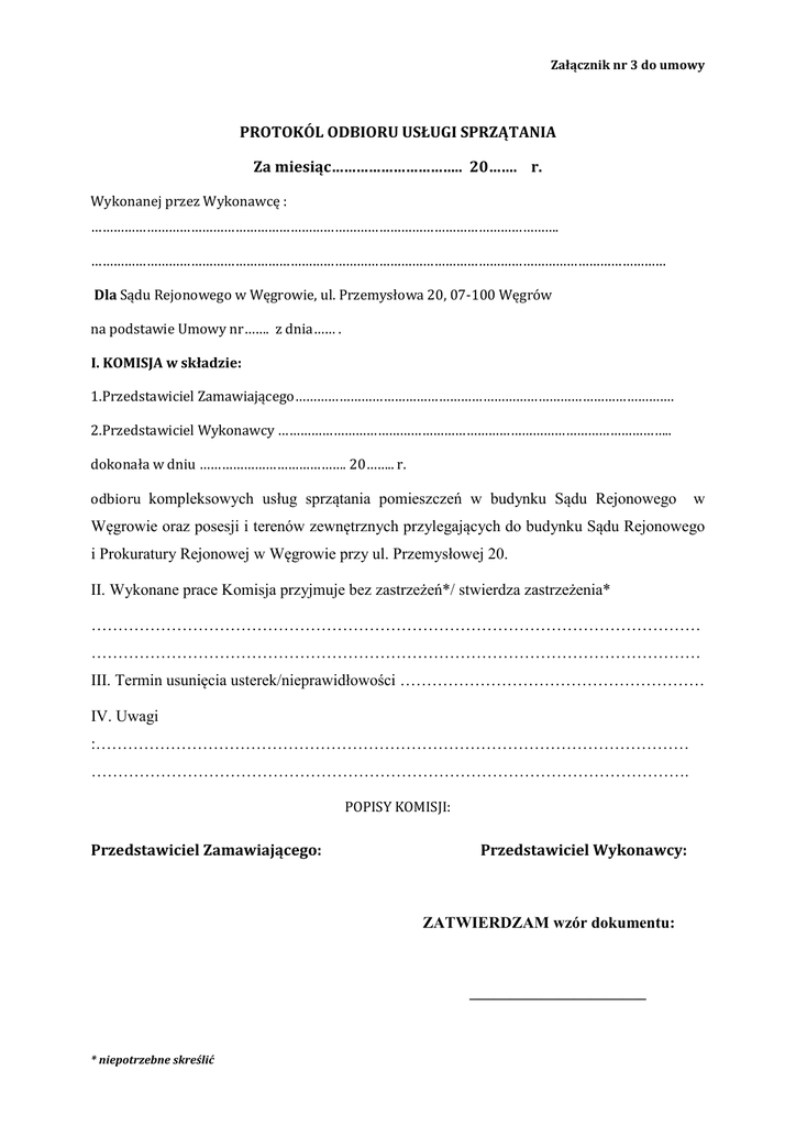 Załącznik nr 3 do umowy PROTOKÓL ODBIORU USŁUGI SPRZĄTANIA Za miesiąc………………………….. 20……. r. Wykonanej przez Wykonawcę : ………………………………………………………………………………………………………………. ………………………………………………………………………………………………………………………………………… Dla Sądu Rejonowego w Węgrowie, ul. Przemysłowa 20, 07-100 Węgrów na podstawie Umowy nr……. z dnia…… . I. KOMISJA w składzie: 1.Przedstawiciel Zamawiającego…………………………………………………………………………………………. 2.Przedstawiciel Wykonawcy …………………………………………………………………………………………….. dokonała w dniu …………………………………. 20…….. r. odbioru kompleksowych usług sprzątania pomieszczeń w budynku Sądu Rejonowego w Węgrowie oraz posesji i terenów zewnętrznych przylegających do budynku Sądu Rejonowego i Prokuratury Rejonowej w Węgrowie przy ul. Przemysłowej 20. II. Wykonane prace Komisja przyjmuje bez zastrzeżeń*/ stwierdza zastrzeżenia* …………………………………………………………………………………………………… …………………………………………………………………………………………………… III. Termin usunięcia usterek/nieprawidłowości ………………………………………………… IV. Uwagi :………………………………………………………………………………………………… …………………………………………………………………………………………………. POPISY KOMISJI: Przedstawiciel Zamawiającego: Przedstawiciel Wykonawcy: ZATWIERDZAM wzór dokumentu: ______________________ * niepotrzebne skreślić