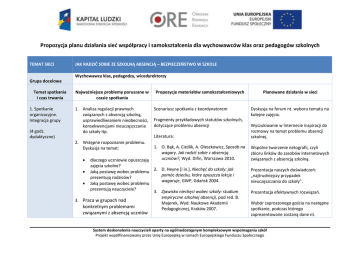 Propozycja planu działania sied współpracy i samokształcenia dla wychowawców klas oraz pedagogów szkolnych TEMAT SIECI JAK RADZID SOBIE ZE SZKOLNĄ ABSENCJĄ – BEZPIECZEŃSTWO W SZKOLE Wychowawcy klas, pedagodzy, wicedyrektorzy Grupa docelowa Temat spotkania i czas trwania 1. Spotkanie organizacyjne. Integracja grupy (4 godz. dydaktyczne) Najważniejsze problemy poruszane w czasie spotkania 1. Analiza regulacji prawnych związanych z absencją szkolną, usprawiedliwianiem nieobecności, konsekwencjami nieuczęszczania do szkoły itp. 2. Wstępne rozpoznanie problemu. Dyskusja na temat: Propozycje materiałów samokształceniowych Scenariusz spotkania z koordynatorem Fragmenty przykładowych statutów szkolnych, dotyczące problemu absencji Dyskusja na forum nt. wyboru tematu na kolejne zajęcia. Literatura: Wyszukiwanie w Internecie inspiracji do rozmowy na temat problemu absencji szkolnej. 1. O. Bąk, A. Cieślik, A. Oleszkowicz, Sposób na wagary. Jak radzid sobie z absencją uczniów?, Wyd. Difin, Warszawa 2010. Wspólne tworzenie netografii, czyli zbioru linków do zasobów internetowych związanych z absencją szkolną. dlaczego uczniowie opuszczają zajęcia szkolne? Jaką postawę wobec problemu 2. D. Heyne [i in.], Niechęd do szkoły: jak pomóc dziecku, które opuszcza lekcje i prezentują rodziców? wagaruje, GWP, Gdaosk 2004. Jaką postawę wobec problemu prezentują nauczyciele? 3. Zjawisko niechęci wobec szkoły: studium empiryczne szkolnej absencji, pod red. B. 3. Praca w grupach nad Majerek, Wyd. Naukowe Akademii konkretnym problemami Pedagogicznej, Kraków 2007. związanymi z absencją uczniów Planowane działania w sieci Prezentacja naszych doświadczeo: „najtrudniejszy przypadek nieuczęszczania do szkoły”. Prezentacja efektywnych rozwiązao. Wybór zaproszonego gościa na następne spotkanie, podczas którego zaprezentowane zostaną dane nt. System doskonalenia nauczycieli oparty na ogólnodostępnym kompleksowym wspomaganiu szkół Projekt współfinansowany przez Unię Europejską w ramach Europejskiego Funduszu Społecznego np. motywowanie uczniów, regulacje prawne, problem bezpieczeostwa w szkole. 4. M. Stamm, Absencja szkolna w Szwajcarii: przełamanie tabu, *w:+ „Gazeta Szkolna” 36/2007. uczęszczania do szkoły uczniów w poprzednim roku szkolnym. 5. Badania warszawskich gimnazjalistów : wagary, agresja, wykroczenia i substancje psychoaktywne, [w:] „Świat Problemów” 3/ 2010. 2. Absencja – poszukiwanie źródeł problemu (4 godz. dydaktyczne) 1. Analiza uczęszczania do szkoły uczniów wybranej szkoły w poprzednim roku szkolnym – w formie raportu. Wnioski z monitorowania frekwencji w tej placówce. Analizę przedstawia zaproszony gośd, pedagog szkolny czy wicedyrektor (przykład szkoły spoza naszego powiatu/gminy). 2. Rozmowa i dyskusja z zaproszonym gościem. 3. Praca w grupach oraz dyskusja nad tematami: przyczyny absencji, zdefiniowanie pojęcia i nazwanie problemu (liczby, powody etc.), wewnętrzne i pozaszkolne przyczyny absencji, konsekwencje absencji, najważniejszych obszary problemowe. Scenariusz spotkania z koordynatorem Jak wyżej oraz Raport z analizy uczęszczania do szkoły uczniów Wymiana materiałów na temat sposobów radzenia sobie z uczniami opuszczającymi zajęcia lekcyjne. Literatura: 1. O. Bąk, A. Cieślik, A. Oleszkowicz, Sposób na wagary. Jak radzid sobie z absencją uczniów?, Wyd. Difin, Warszawa 2010. Dyskusja na forum na temat źródeł szkolnej absencji. 2. D. Heyne [i in.], Niechęd do szkoły: jak pomóc dziecku, które opuszcza lekcje i wagaruje, GWP, Gdaosk 2004. 3. Zjawisko niechęci wobec szkoły: studium empiryczne szkolnej absencji, pod red. B. Majerek, Wyd. Naukowe Akademii Pedagogicznej, Kraków 2007. 4. M. Stamm, Absencja szkolna w Szwajcarii: przełamanie tabu, [w:+ „Gazeta Szkolna” System doskonalenia nauczycieli oparty na ogólnodostępnym kompleksowym wspomaganiu szkół Projekt współfinansowany przez Unię Europejską w ramach Europejskiego Funduszu Społecznego 36/2007. 5. Badania warszawskich gimnazjalistów: wagary, agresja, wykroczenia i substancje psychoaktywne, [w:] „Świat Problemów” 3/ 2010. 3. Diagnoza wewnątrzszkolnych przyczyn absencji (4 godz. dydaktyczne) 1. Praca indywidualna lub w parach: analiza regulacji wewnątrzszkolnych dotyczących absencji w mojej szkole; jakie obszary szkolnej codzienności mogą podnosid współczynnik absencji? 2. Po analizie prezentacja efektów pracy. 3. Praca w grupach: wypracowanie narzędzi do diagnozy zjawiska absencji, wg pomysłu poszczególnych grup. 4. Przygotowanie uczestników sieci do innych niż ankietowe badao absencji, np. fokus, wywiad, rozmowy. Scenariusz spotkania z koordynatorem Dyskusja na forum na temat wewnątrzszkolnych przyczyn absencji. Literatura: 1. O. Bąk, A. Cieślik, A. Oleszkowicz, Sposób na wagary. Jak radzid sobie z absencją uczniów?, Wyd. Difin, Warszawa 2010. 2. D. Heyne [i in.], Niechęd do szkoły: jak pomóc dziecku, które opuszcza lekcje i wagaruje, GWP, Gdaosk 2004. 3. Zjawisko niechęci wobec szkoły: studium empiryczne szkolnej absencji, pod red. B. Majerek, Wyd. Naukowe Akademii Pedagogicznej, Kraków 2007. 4. M. Stamm, Absencja szkolna w Szwajcarii: przełamanie tabu, *w:+ „Gazeta Szkolna” 36/2007. Porównywanie różnych zapisów wewnątrzszkolnych regulacji dotyczących absencji. Prezentacja na forum eksperta, który poprowadzi warsztaty podczas następnego spotkania. Każdy z uczestników sieci dokonuje własnej analizy frekwencji uczniów jego szkoły czy jego klasy. Zamieszcza ten materiał na forum i przesyła ekspertowi prowadzącemu warsztaty na następnym spotkaniu. 5. Badania warszawskich gimnazjalistów: wagary, agresja, wykroczenia i substancje psychoaktywne, [w:] „Świat Problemów” 3/ 2010. System doskonalenia nauczycieli oparty na ogólnodostępnym kompleksowym wspomaganiu szkół Projekt współfinansowany przez Unię Europejską w ramach Europejskiego F