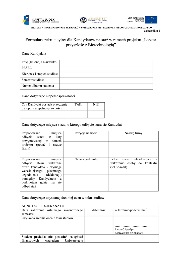 PROJEKT WSPÓŁFINANSOWANY ZE ŚRODKÓW UNII EUROPEJSKIEJ I EUROPEJSKIEGO FUNDUSZU SPOŁECZNEGO załącznik n 1 Formularz rekrutacyjny dla Kandydatów na staż w ramach projektu „Lepsza przyszłość z Biotechnologią” Dane Kandydata Imię (Imiona) i Nazwisko PESEL Kierunek i stopień studiów Semestr studiów Numer albumu studenta Dane dotyczące niepełnosprawności Czy Kandydat posiada orzeczenie o stopniu niepełnosprawności TAK NIE Dane dotyczące miejsca stażu, o którego odbycie stara się Kandydat Proponowane miejsce odbycia stażu z listy przygotowanej w ramach projektu (podać i nazwę firmy) Pozycja na liście Nazwę firmy Proponowane miejsce odbycia stażu wskazane przez kandydata - wymaga wcześniejszego pisemnego uzgodnienia (deklaracji) pomiędzy Kandydatem a podmiotem gdzie ma się odbyć staż Nazwa podmiotu Pełne dane teleadresowe i wskazanie osoby do kontaktu (tel.; e-mail) Dane dotyczące uzyskanej średniej ocen w toku studiów: ADNOTACJE DZIEKANATU Data zaliczenia ostatniego zakończonego semestru Uzyskana średnia ocen z toku studiów dd-mm-rr w terminie/po terminie* …………………………….. Pieczęć i podpis Kierownika dziekanatu Student posiada/ nie posiada* zaległości finansowych względem Uniwersytetu …………………………….. Kazimierza Wielkiego w Bydgoszczy Pieczęć i podpis Kierownika dziekanatu * niepotrzebne skreślić Formularz należy wypełnić w wersji papierowej i elektronicznej i złożyć w biurze projektu oraz przesłać wersję elektroniczną na adres mailowy: [email protected] ……………….…………………………………. Data oraz czytelny podpis studenta Informacja o wymaganych załącznikach do formularza rekrutacyjnego dla Kandydatów na staż w ramach projektu „Lepsza przyszłość z Biotechnologią”: oświadczenie uczestnika Projektu a wyrażeniu zgody na przetwarzanie danych osobowych deklaracja udziału w Projekcie kserokopia legitymacji studenckiej kserokopia dowodu osobistego oświadczenie o zapoznaniu się i akceptacji postanowień Regulaminu staży studenckich oraz przyznawania i wypłacania stypendiów za staże studenckie w ramach projektu „Lepsza Przyszłość z Biotechnologią” w roku akademickim 2013/2014 , oświadczenie o niepozostawaniu w stosunku zatrudnienia na podstawie umowy o pracę, umowy cywilno-prawnej oraz o nieprowadzeniu pozarolniczej działalności gospodarczej ani działalności rolniczej, oświadczenie o posiadaniu aktualnej polisy ubezpieczeniowe od następstw nieszczęśliwych wypadków lub oświadczenie o rezygnacji z ww. ubezpieczenia. oświadczenie o braku zobowiązań finansowych ani zaległości dydaktycznych względem Beneficjenta wynikających z obowiązków studenta. Decyzja Komisji rekrutacyjnej ds. stażu Kandydat zakwalifikowany na staż Nazwa firmy organizującej staż Miejsce odbywania stażu Stanowisko, na którym Stażysta będzie odbywał staż Miejscowość, data, podpisy członków Komisji Tak / Nie* ……………………………………………………………………………. ……………………………………………………………………………. ……………………………………………………………………………..