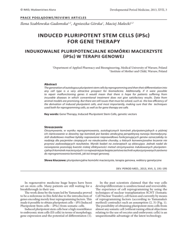 © IMiD, Wydawnictwo Aluna Developmental Period Medicine, 2013, XVII,191 3 PR ACE POGL Ą DOWE / R E VI E W S A RTI CL ES Ilona Szabłowska-Gadomska1,2, Agnieszka Górska1, Maciej Małecki1,2 INDUCED PLURIPOTENT STEM CELLS !iPSc" FOR GENE THERAPY INDUKOWALNE PLURIPOTENCJALNE KOMÓRKI MACIERZYSTE !iPSc" W TERAPII GENOWEJ 1 Department of Applied Pharmacy and Bioengineering, Medical University of Warsaw, Poland 2 Institute of Mother and Child, Warsaw, Poland Abstract The generation of autologous pluripotent stem cells by reprogramming and then their differentiation into any cell type is a very attractive prospect for biomedicine. Additionally, if it were possible to repair malfunctioning genes it would mean that there is hope for patients suffering from incurable diseases in which conventional treatment does not give satisfactory results. Data from animal models are promising. But there are still issues that must be solved, such as the low efficiency of the derivation of induced pluripotent cells, and most importantly, making sure that the techniques used both for reprogramming cells, as well as for gene therapy are safe. Key words: Gene Therapy, Induced Pluripotent Stem Cells, genetic vectors Streszczenie Otrzymywanie, w wyniku reprogramowania, autologicznych komórek pluripotencjalnych a później ich różnicowanie w dowolny typ komórek jest bardzo atrakcyjną perspektywą rozwoju biomedycyny. Jeśli dodatkowo możliwe byłoby naprawianie nieprawidłowo funkcjonujących genów oznaczałoby to nadzieję dla pacjentów cierpiących na nieuleczalne choroby, u których konwencjonalne leczenie nie przynosi zadowalających rezultatów. Wyniki badań na zwierzętach są obiecujące. Jednak nadal do rozwiązania pozostają kwestie niskiej efektywności metod otrzymywania indukowanych pluripotencjalnych komórek macierzystych i co najważniejsze bezpieczeństwa technik wykorzystywanych zarówno do reprogramowania komórek, jak też terapii genowej. Słowa kluczowe: pluripotencjalne komórki macierzyste, terapia genowa, wektory genetyczne DEV. PERIOD MED., 2013, XVII, 3, 191195 In regenerative medicine huge hopes have been set on stem cells. Many patients are still waiting for a breakthrough in their use. The work done by the team led by Yamanaka proved to be a milestone in this field due to the introduction of genes encoding merely four reprogramming factors. This made it possible to obtain pluripotent cells – iPS (Induced Pluripotent Stem cells – iPSc) from somatic cells. Induced pluripotent stem cells bear a high resemblance to embryonic stem cells (ES cells) in terms of morphology, gene expression and the potential of differentiaton (1). In the past scientists claimed that the way cells develop/differentiate is unidirectional and irreversible. The experience of cell reprogramming by using the techniques of nuclear transplantation SCNT (Somatic Cell Nuclear Transfer), cell fusion and currently by means of reprogramming factors (according to Yamanaka’s method) contradict such an assumption (2, 3) (Fig. 1). The possibility of obtaining pluripotent stem cells from almost any somatic cell (without raising ethical objections relating to the use of oocytes and embryonic cells) is an unquestionable advantage of the latest technology. 192 Ilona Szabłowska-Gadomska i wsp. ReprogrammingIReprogramowanie Oocyte/Oocyt ES cell/Zarodkowa komórka macierzysta Somatic cell/Komórka somatyczna SCNT ES cell/Zarodkowa komórka macierzysta Heterocarion/Heterokarion or/lub Hybrids/ Hybrydy Somatic cell/Komórka somatyczna Cell fusion / Fuzja komórek Reprogramming factors/ Czynniki Reprogramujące Induced Pluripotent Stem Cells – iPS Indukowana pluripotencjalna komórka macierzysta – iPS Somatic cell/ Komórka somatyczna by Yamanaka’s method / metodą Yamanaki Fig. 1. Strategy of cell reprogrammining. Ryc. 1. Strategie reprogramowania komórek. The most valuable feature of pluripotent stem cells (including iPS cells) is their ability to divide, self-renew, as well as the potential to differentiate into cells of three germ layers. The same properties are exhibited by node cells isolated from embryonic ICM (Inner Cell Mass) at the blastocyst stage. The attributes of these cells enable the production of all the body building tissues. A greater potential is exhibited only by totipotent cells (zygote) which, in addition to body building cells, are also able to create extra-embryonic structures. In order to derive iPS cells, the latest techniques are used, which are applied, among other things, in gene therapy (Fig. 2). The introduction of nucleic acids encoding the reprogramming factors (in order to obtain pluripotent stem cells) can be done with different types of vectors. The most effective method, which is unfortunately burdened with the highest risk of oncogenesis and potential reactivation of transgenes during cell differentiation, is based on the use of retro and lentiviruses. In both systems amplification of transgenes often entails the integration of the virus vector into the genome of a cell undergoing the reprogramming process (the host cell). Using a lentivirus vector makes it possible to introduce genes into non-dividing cells (4). As far as clinical application is concerned, “integration free” methods that enable the amplification of the gene that is being introduced independent of the material located on the chromosomes of the host cell, are more secure. When introduced into cells, adenoviral vectors exist in episomal form and allow a high but transient expression level (4, 5). The methods for introducing genetic material into cells can also be classified into those based on viral and non-viral vectors. Amidst the latter, there are some interesting strategies based on “PiggyBAC” and “minicircle” plasmids (6). When considering methods of cell reprogramming, control of the expression of the genes introduced is a crucial aspect to be taken into account (particularly the way of gene si