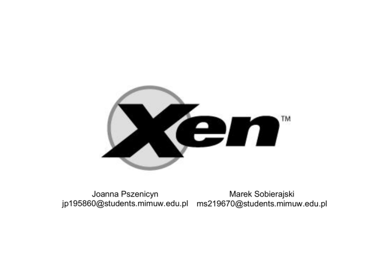 Joanna Pszenicyn [email protected] Marek Sobierajski [email protected] Monitor maszyn wirtualnych • Jest to oprogramowanie nadzorujące działanie systemów – gości • Może być to oddzielny software lub zintegrowany z systemem operacyjnym System gospodarza • Oznaczany zazwyczaj jako dom0 • Systemy – NetBSD, Debian, Ubuntu, Fedora, Gentoo, FreeBSD System gościa • Oznaczany zazwyczaj jako domU • Minix, Plan9 from Bell Labs, NetBSD, FreeBSD, OpenSolaris, NetWare • Windows ze sprzętowym wsparciem Parawirtualizacja Systemy operacyjne gości muszą być zmodyfikowane – podmienione wywołania instrukcji I/O, które muszą być symulowane przez nadzorcę Windows • Windows jako gość na specjalnym sprzęcie • AMD Virtualization, znane jako Pacifica • Intel Virtualization Technology, znane jako Vanderpool Zalety • Wszystkie zalety wirtualizacji – na wcześniejszej prezentacji • Zużywa niewiele zasobów systemowych Wady • Wymaga np. PAE • Modyfikacja systemu lub wsparcie sprzętu • Mało dokumentacji np. dla systemów gości XEN. Architektura ● Budowa systemu ● Zarządzanie zasobami: – Pamięć – Procesor – Urządzenia wejścia/wyjścia Budowa systemu ● ● XEN jest warstwą pośredniczącą między systemami-gośćmi a sprzętem System startowy („zerowy”) działa na tym samaym poziomie, co systemy-goście Budowa systemu Zasoby: Pamięć ● Segmentacja – ● Ochrona XENa przed systemami-gośćmi przez umieszczenie go w osobnym (górnym) segmencie pamięci Stronicowanie – Bezpośredni odczyt tablicy stron – Zapis buforowany przez XEN – System-gość może mieć przydzielony nieciągły obszar stron Zasoby: Pamięć – Od wersji 3.0 XEN wspiera PAE (obsługa pamięci > 4G) Zasoby: CPU ● Ochrona XENa przez zapewnienie mu najwyższego poziomu uprzywilejowania – Systemy-goście muszą być zmodyfikowane, aby chodzić na poziomie 1 – Aplikacje nie wymagają modyfikacji Sterowanie ● ● Zamiast funkcji systemowych − „hiperwywołania” do XENa Przerwania sprzętowe zamienione na zdarzenia Zasoby: CPU ● ● Szeregownie domen − wymienny scheduler – BVT − równe udziały – Atropos − udziały bezwzględne – Round Robin − wewn. scheduler XEN Czas wirtualny i rzeczywisty – Licznik cykli procesora – Czas systemowy (w nanosek. od startu systemu) – Wirtualny czas domeny (czas wykonywania) – Czas „zegarowy”, czyli rzeczywisty Zasoby: I/O ● Obsługa żądań I/O przez bufor cykliczny (producenci i konsumenci) Zasoby: I/O ● ● Wirtualne urządzenia blokowe (np. Dyski) – Pojedynczy bufor cykliczny – Operacje PROBE, READ i WRITE Wirtualne interfejsy sieciowe – W każdej domenie 2 bufory cykliczne: dla pakietów przychodzących i wychodzących – Systemy-goście mogą być widoczne na zewnątrz jako hosty w sieci lokalnej Uruchamianie domen ● xm create -c <plik konfiguracyjny> − ● Tworzy nową domenę xm console <nazwa-domeny> − Otwiera nową kosolę tekstową dla podanej domeny xentop ● Program pokazujcy wykorzystanie zasobów przez poszczególne domeny (pamięć, % czasu procesora) Przykład: xentop Zatrzymywanie domen ● xm reboot <nazwa-domeny> − ● xm shutdown <nazwa-domeny> − ● Restartuje podaną domenę Zamyka domenę (jak wyłączenie komputera) xm pause <nazwa-domeny> − Pauzuje domenę (jak stand-by) Zachowywanie i migracja ● xm save <nazwa-domeny> <nazwa-pliku> − ● xm restore <nazwa-pliku> − ● Zachowuje system do pliku i pauzuje go Uruchamia domenę z pliku xm migrate <nazwa-domeny> <host> − Przenosi podany system (podczas działania) na podany host Przykład: domena SUSE Linux Bibliografia ● ● ● http://www.cl.cam.ac.uk/netos/papers/2003xensosp.pdf – źródło ilustracji czarno-białych http://www.cl.cam.ac.uk/netos/papers/2005xen-may.ppt – źródło ilustracji kolorowej http://www.thecodingstudio.com/opensource /linux/screenshots/index.php?linux_distribution _sm=Xen%203.0.3 – źródło screenshotów ● http:/en.wikipedia.org/wiki/Xen – ogólne informacje o Xenie